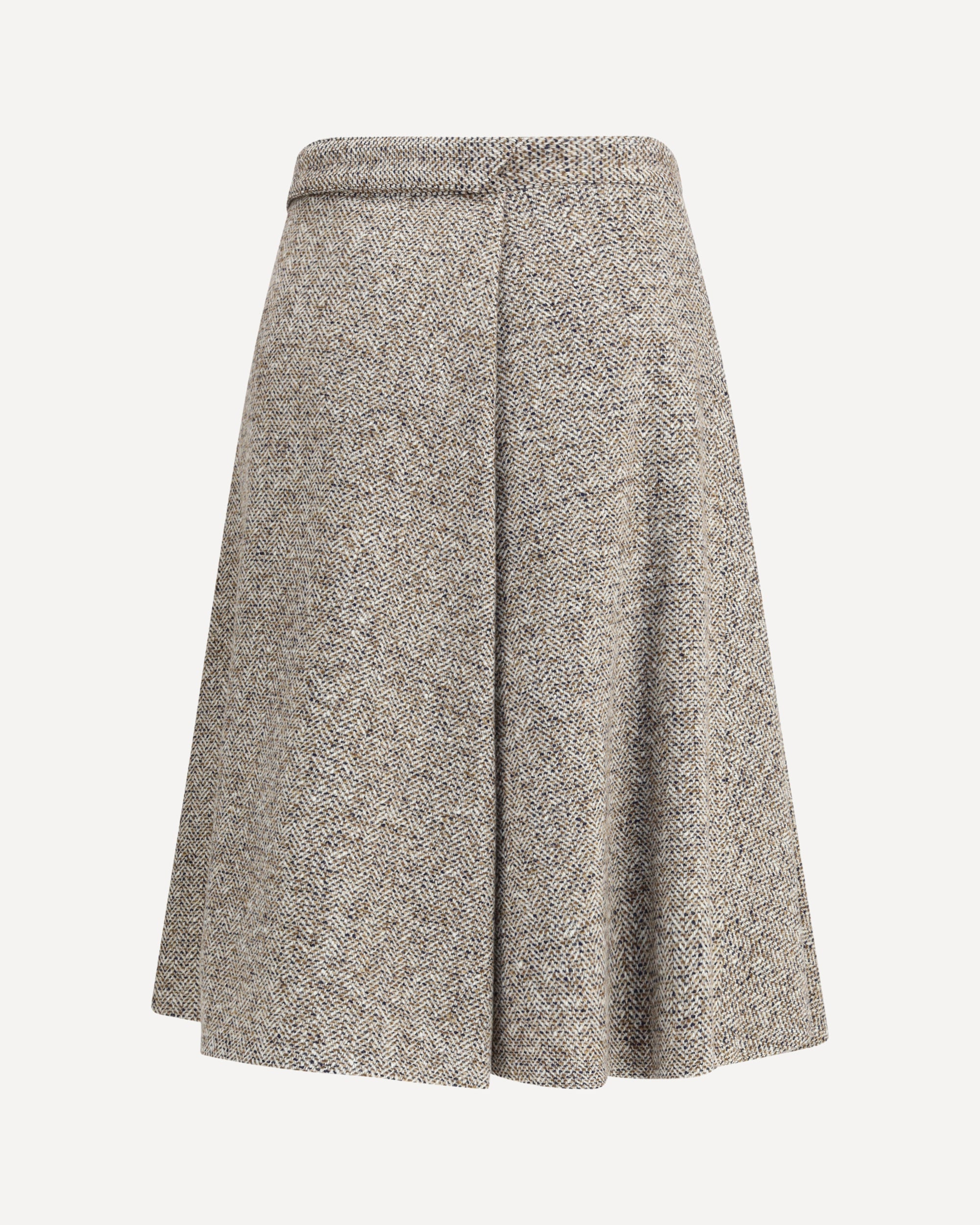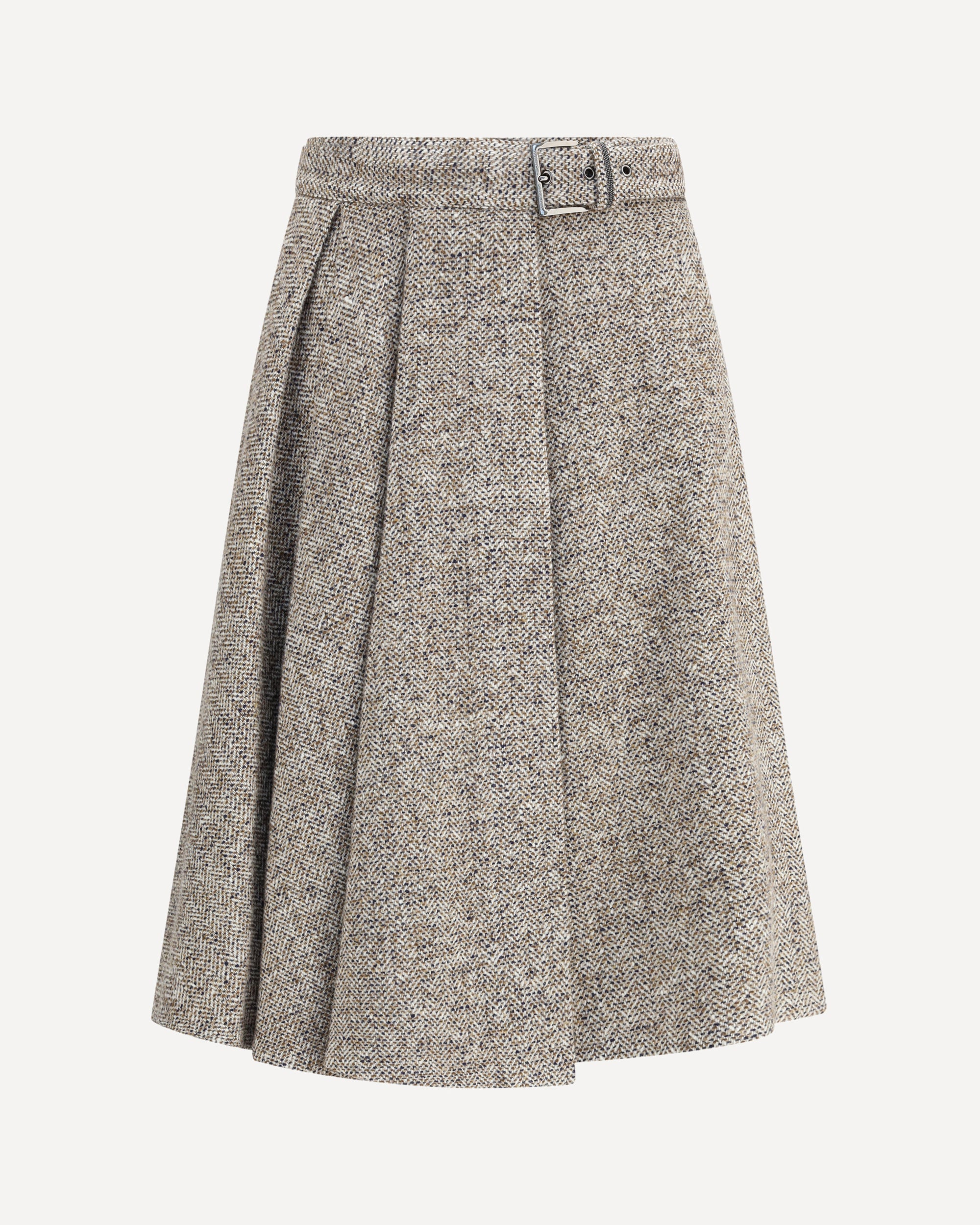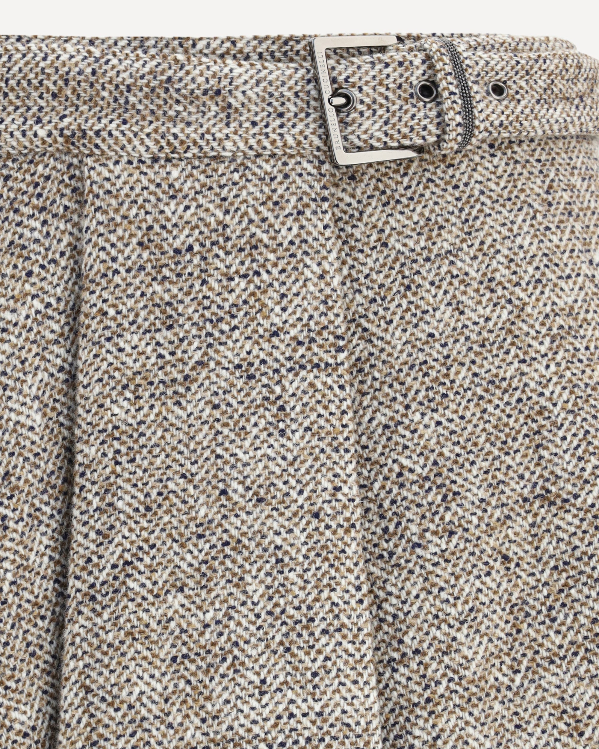 Brunello Cucinelli's virgin wool midi Skirt combines classic elegance with the brand's signature details. The wrap design is enhanced by a buckled belt embellished with the signature Monile detail, a signature of discreet sophistication. Pleats add movement and structure, making the garment perfect for sophisticated, contemporary elegance.