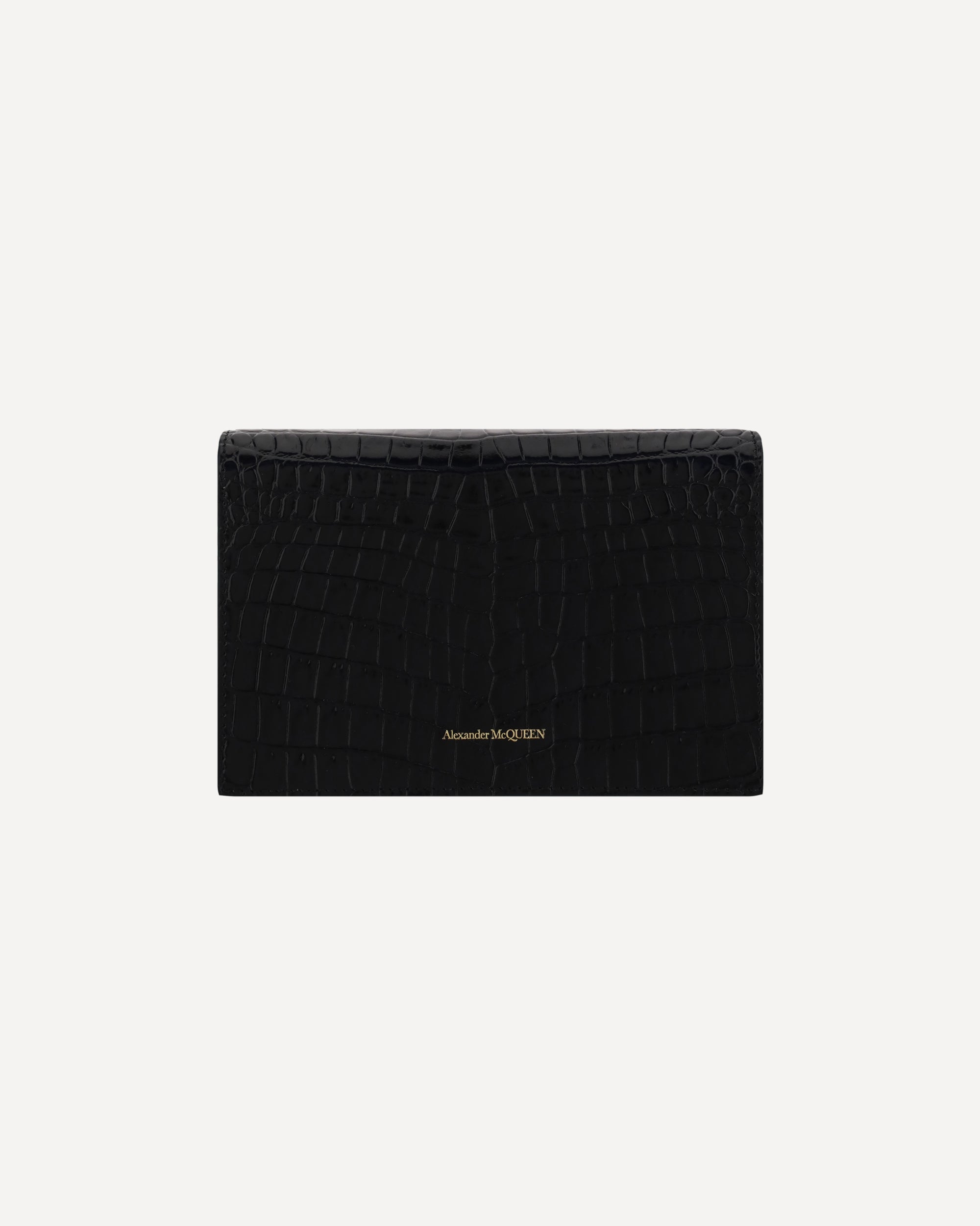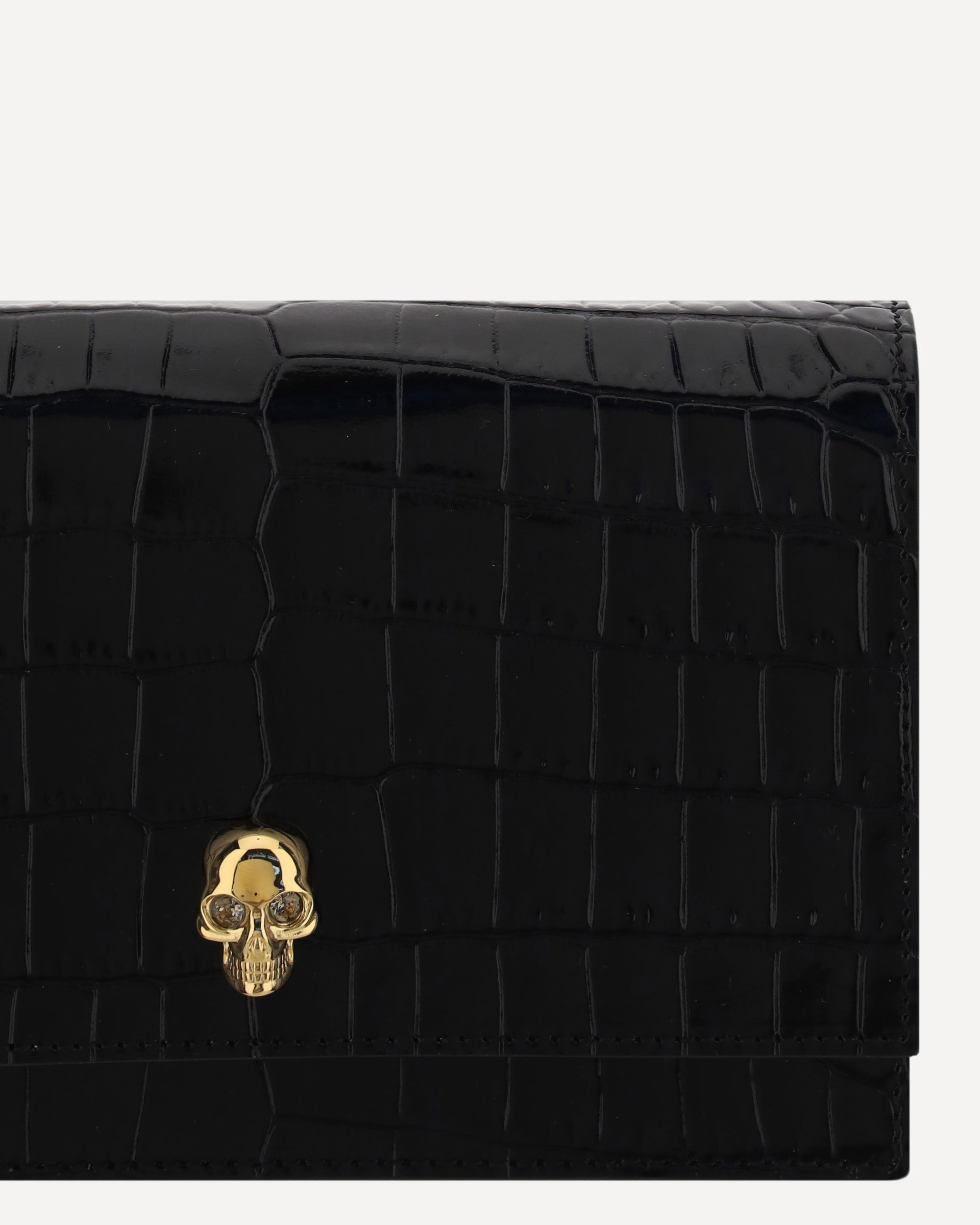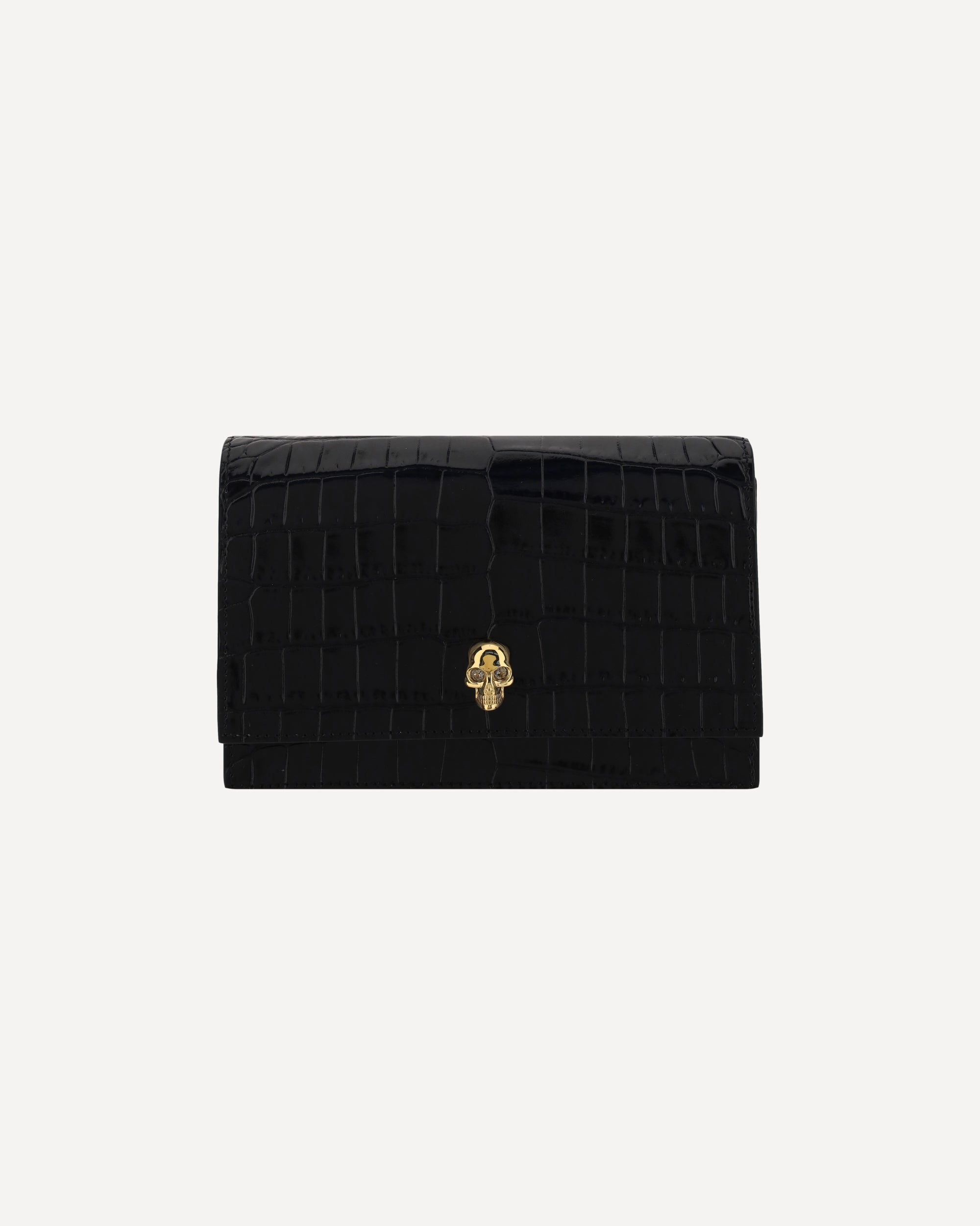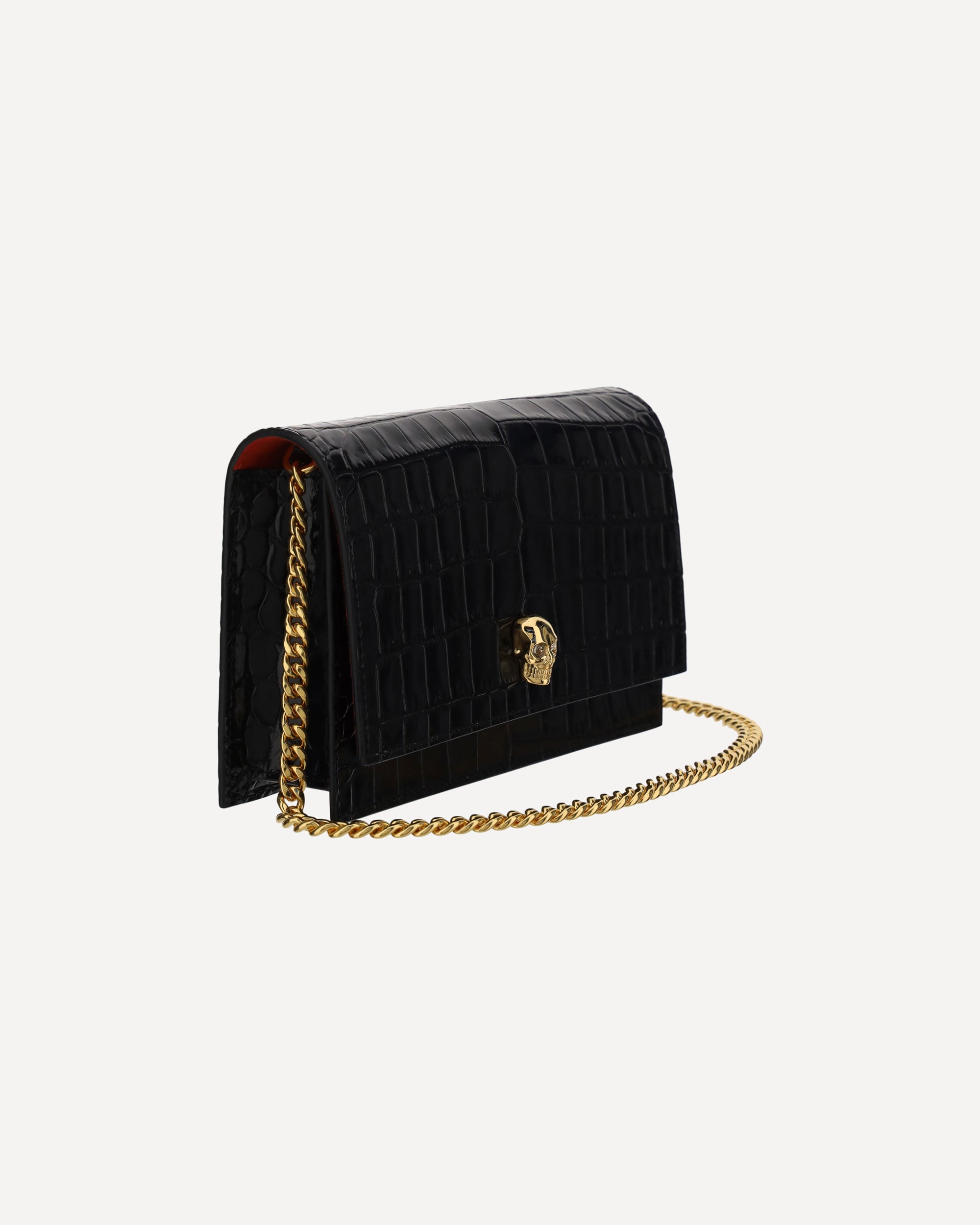 The Alexander McQueen Skull mini leather Shoulder Bag is crafted from patent crocodile-effect leather for a luxurious and distinctive look. Featuring a chain shoulder strap, it has a magnetic closure on the front for practicality and security. The iconic skull plaque on the front and contrasting brand signature on the back add character and recognition. Inside, a slip pocket offers organized storage for small essentials.
