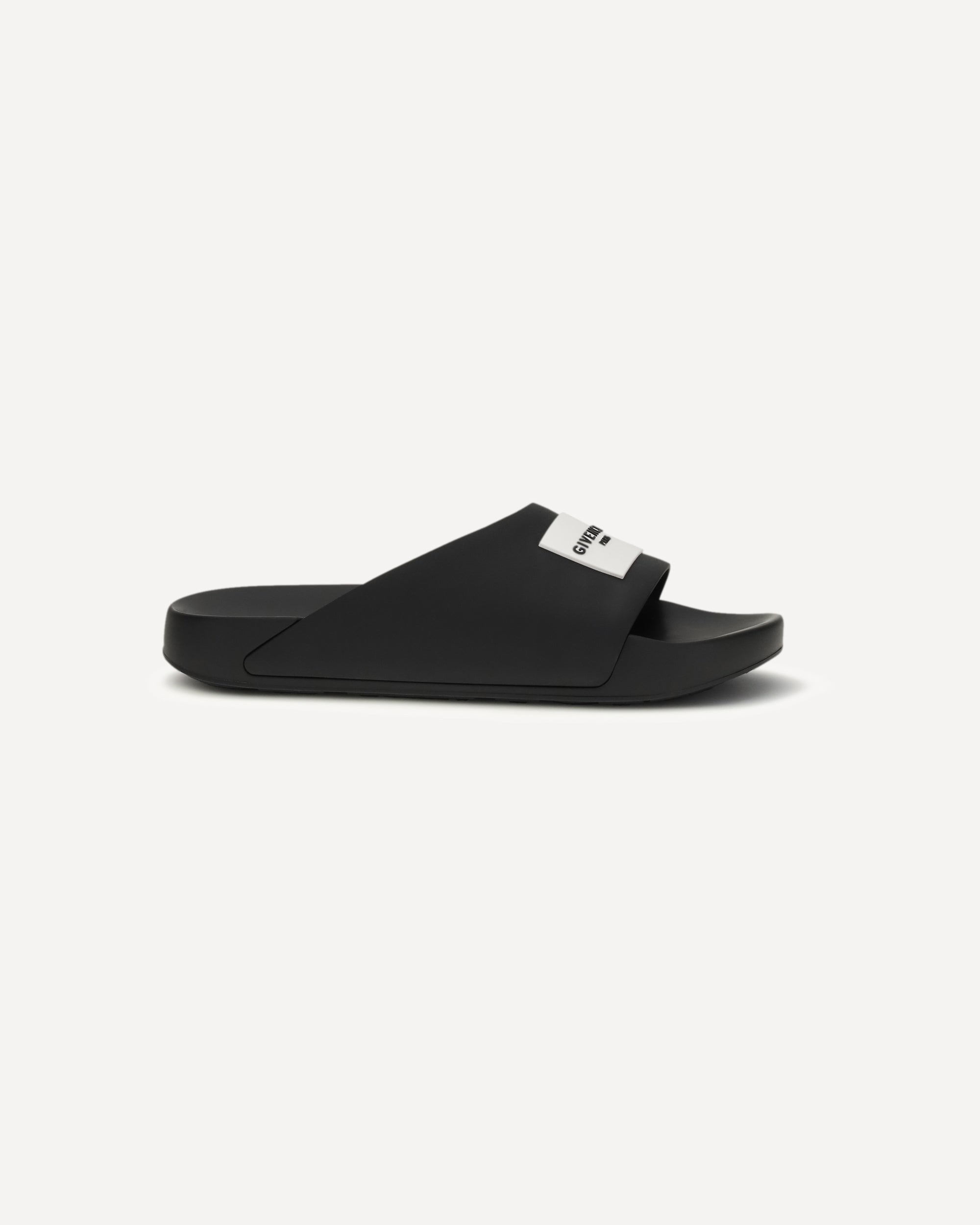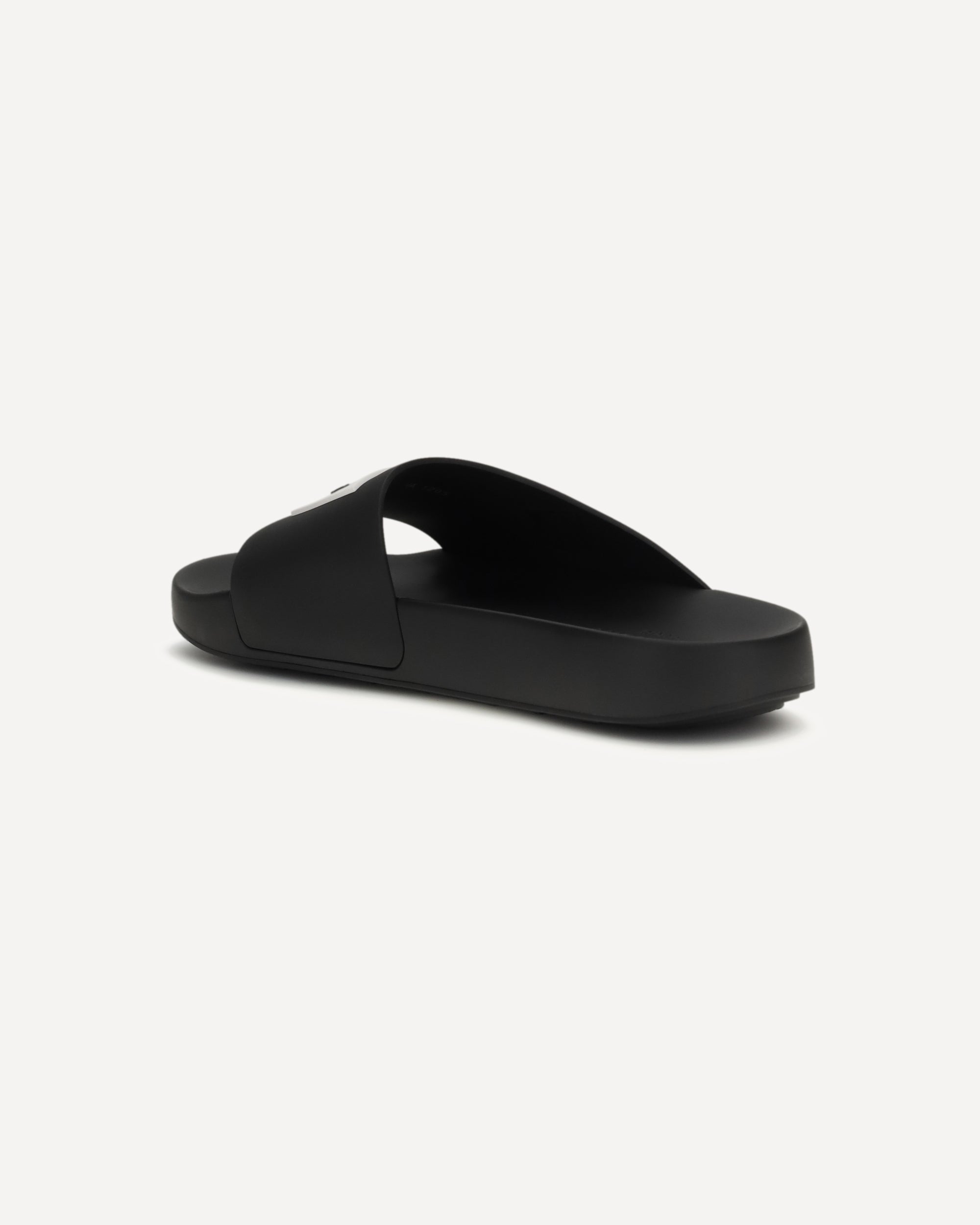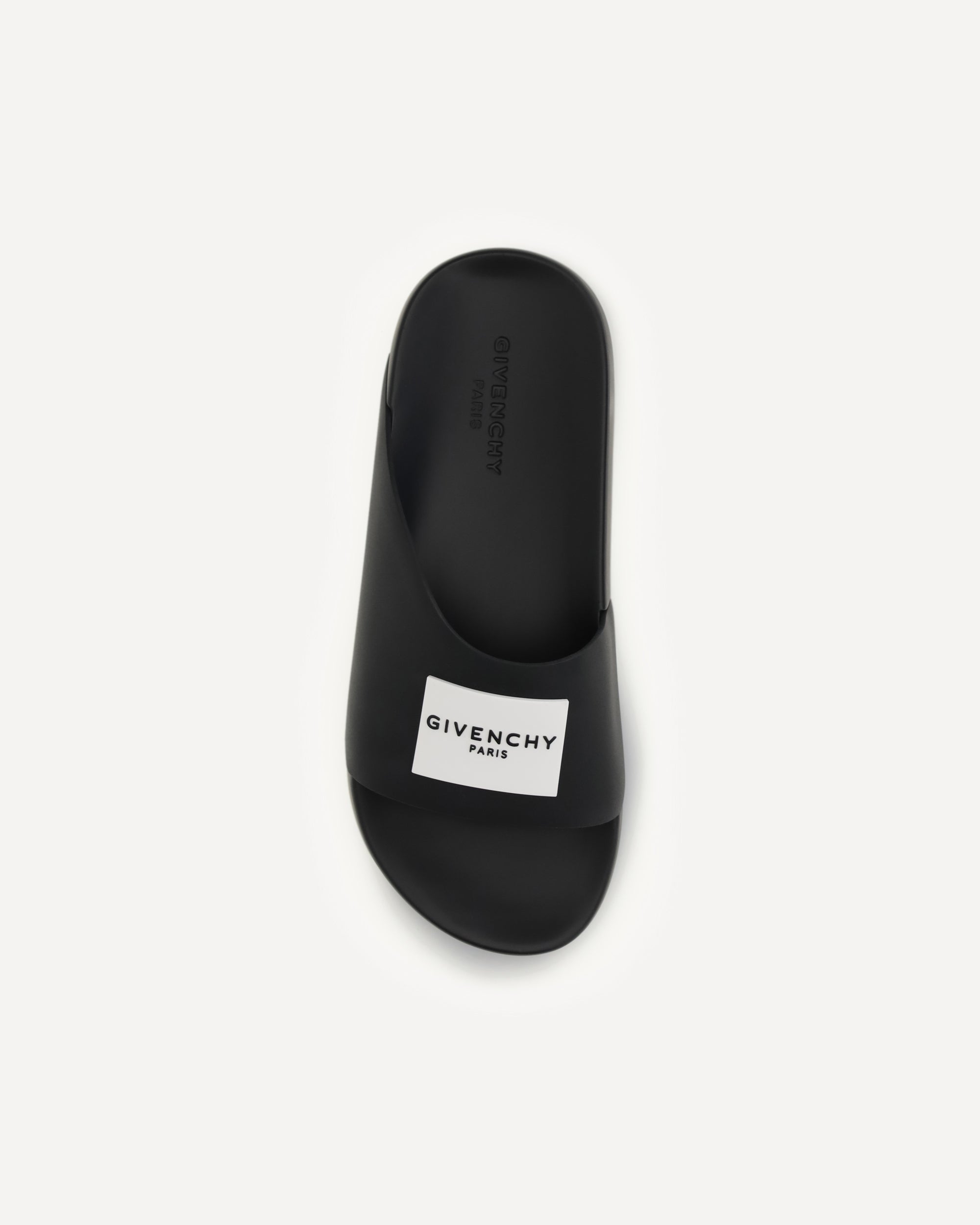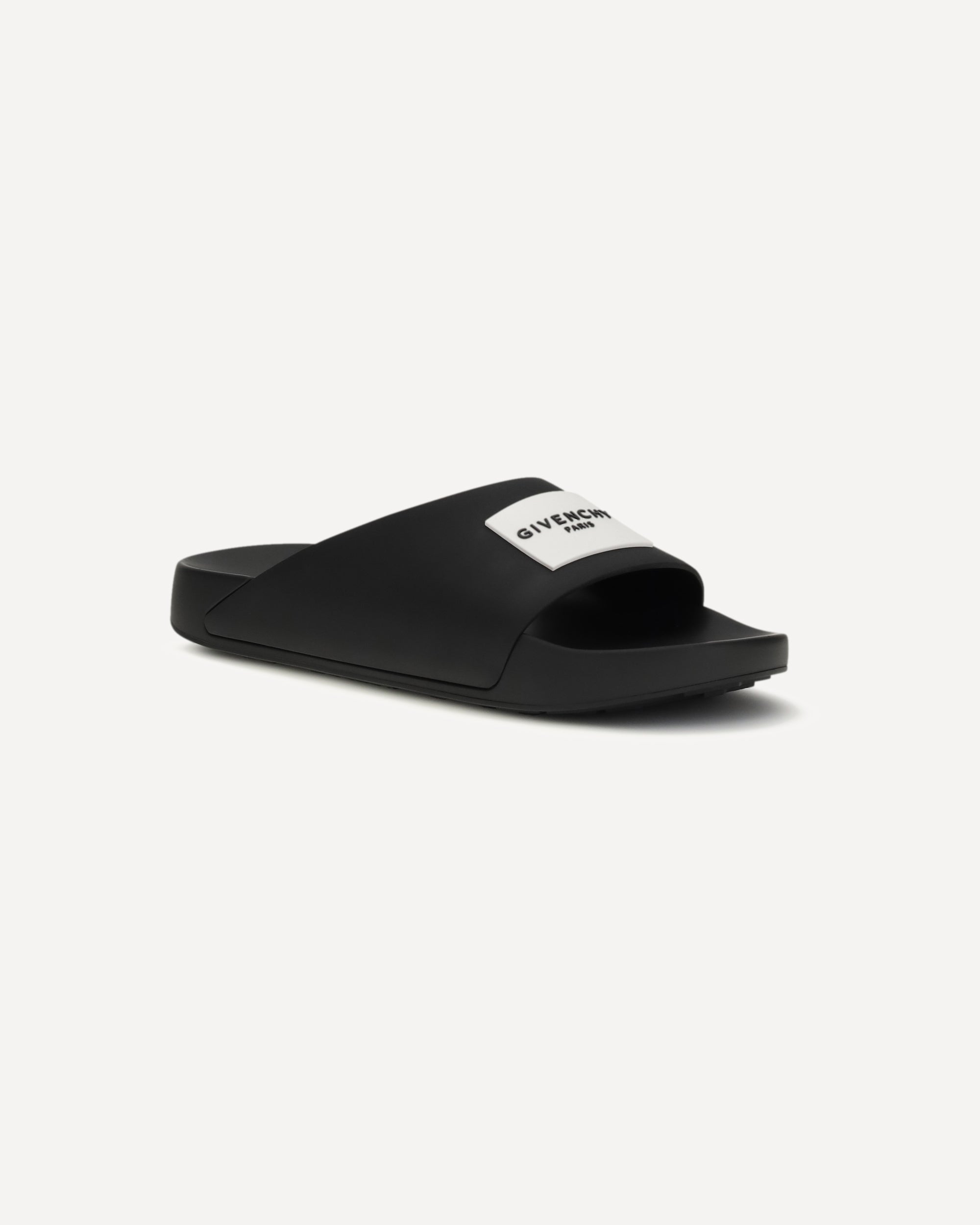 The rubber logo Slippers by Givenchy offer a modern and bold asymmetrical design. The rubber "GIVENCHY Paris" label on the upper and the signature embossed on the inner sole add a touch of understated luxury. The maxi signature under the sole completes the look, adding a distinctive accent. Comfortable and stylish, these slippers are perfect for those seeking a blend of practicality and sophistication with every step.