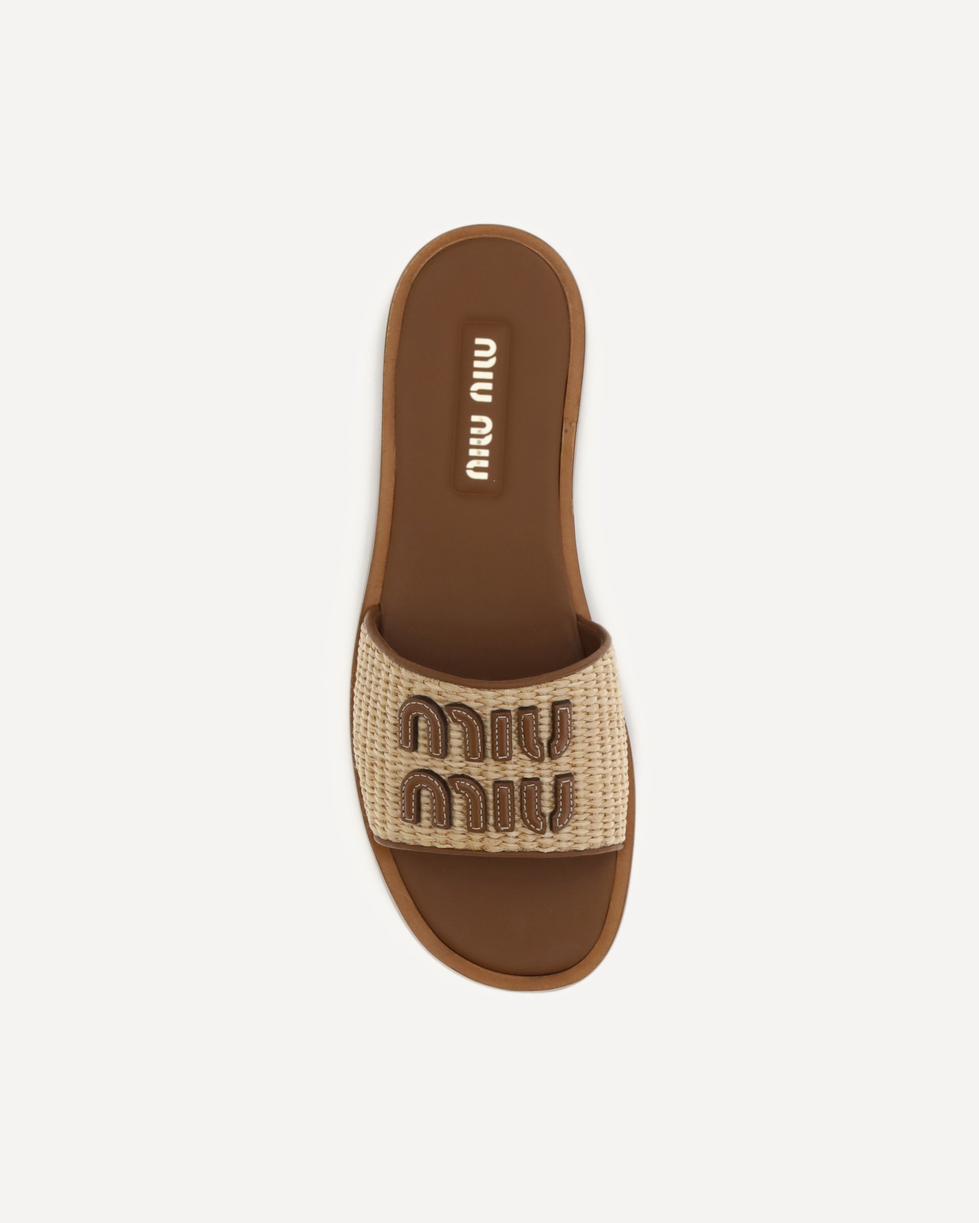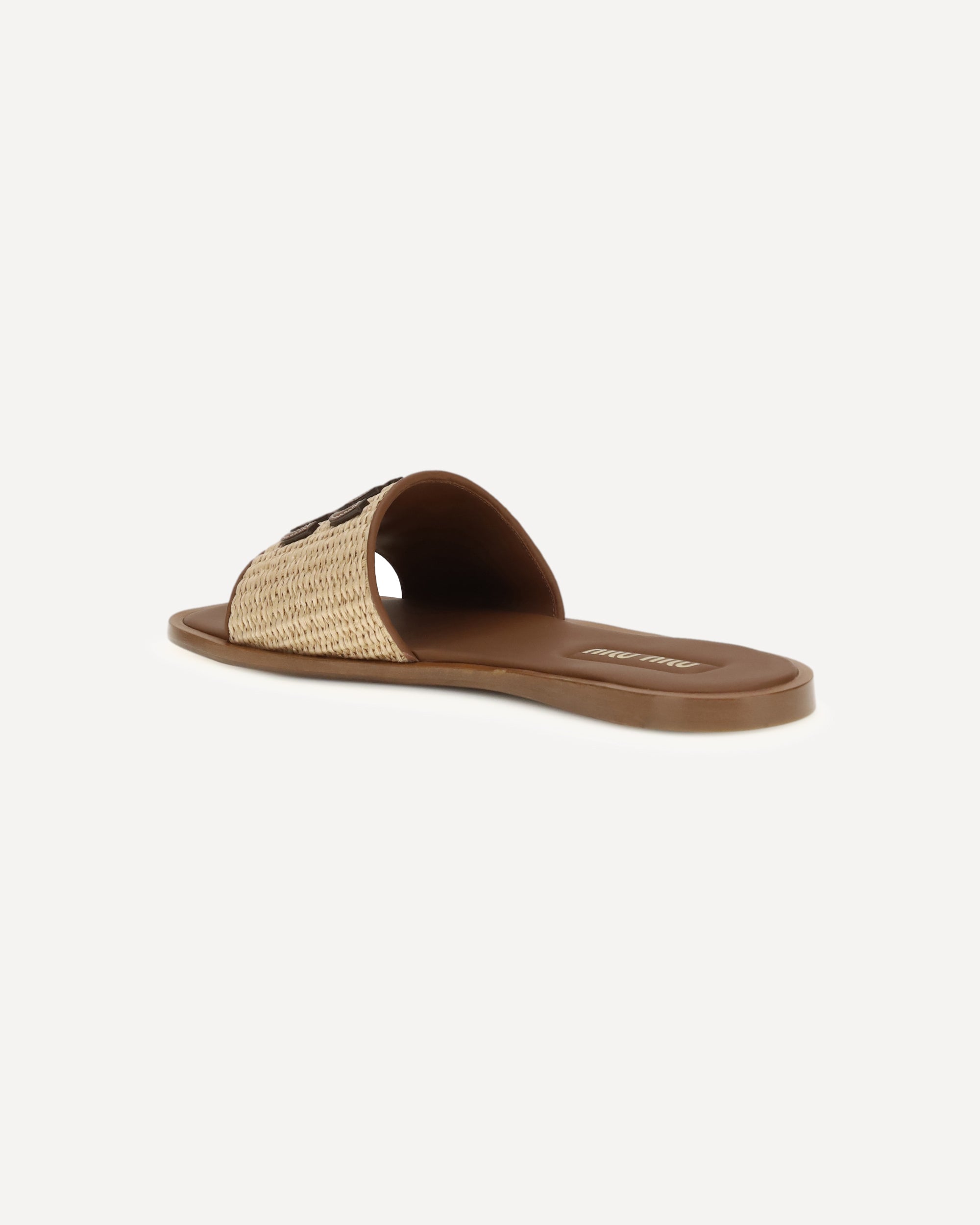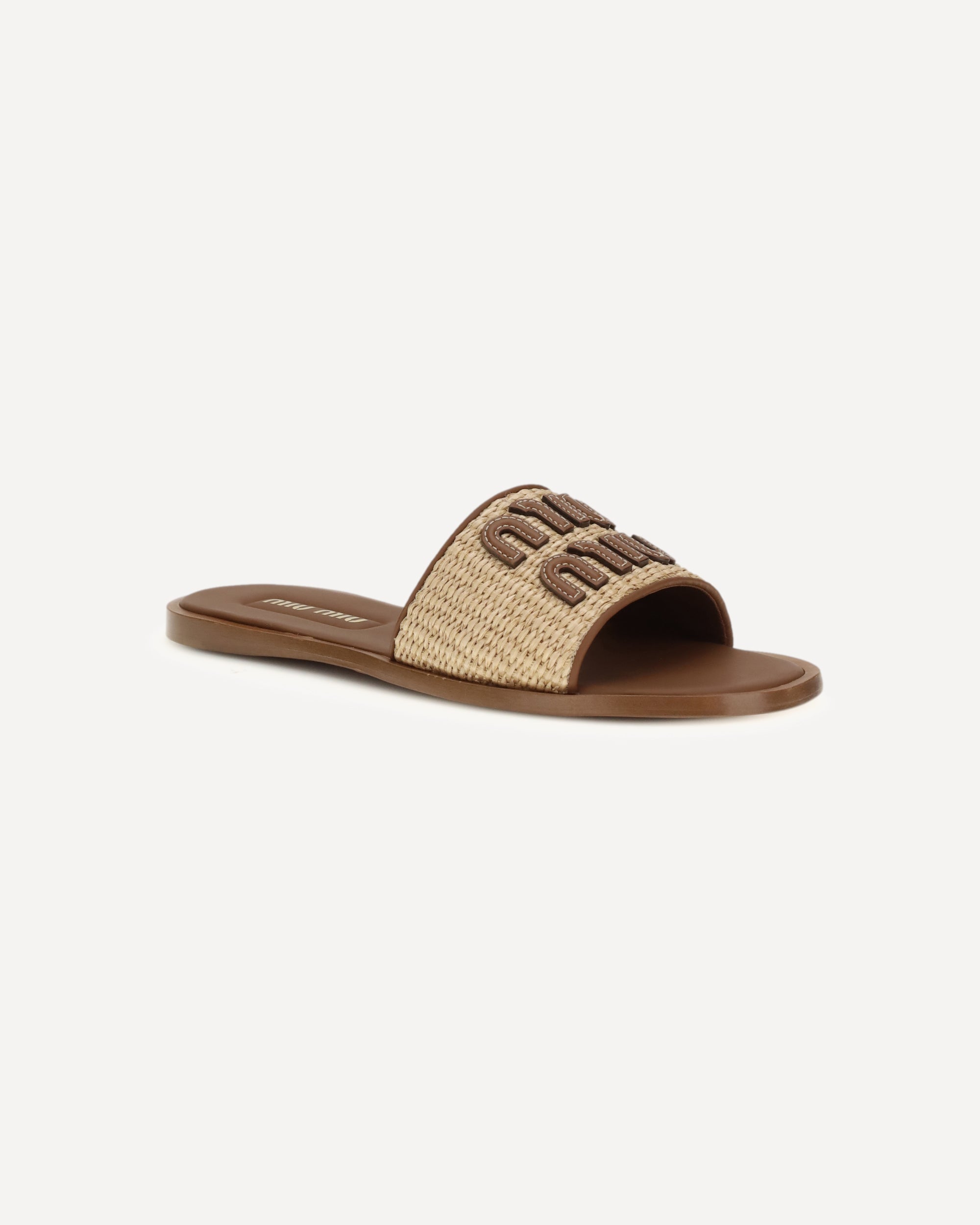 The raffia slippers Sandals by Miu Miu are made of natural raffia and stand out for their fresh and sophisticated style, enriched by the leather logo appliqué on the band that gives an iconic touch to the design. The round toe ensures a soft and comfortable line, while the logo printed on the inside recalls the brand's identity, making these slippers ideal to complete summer looks with elegance and lightness.