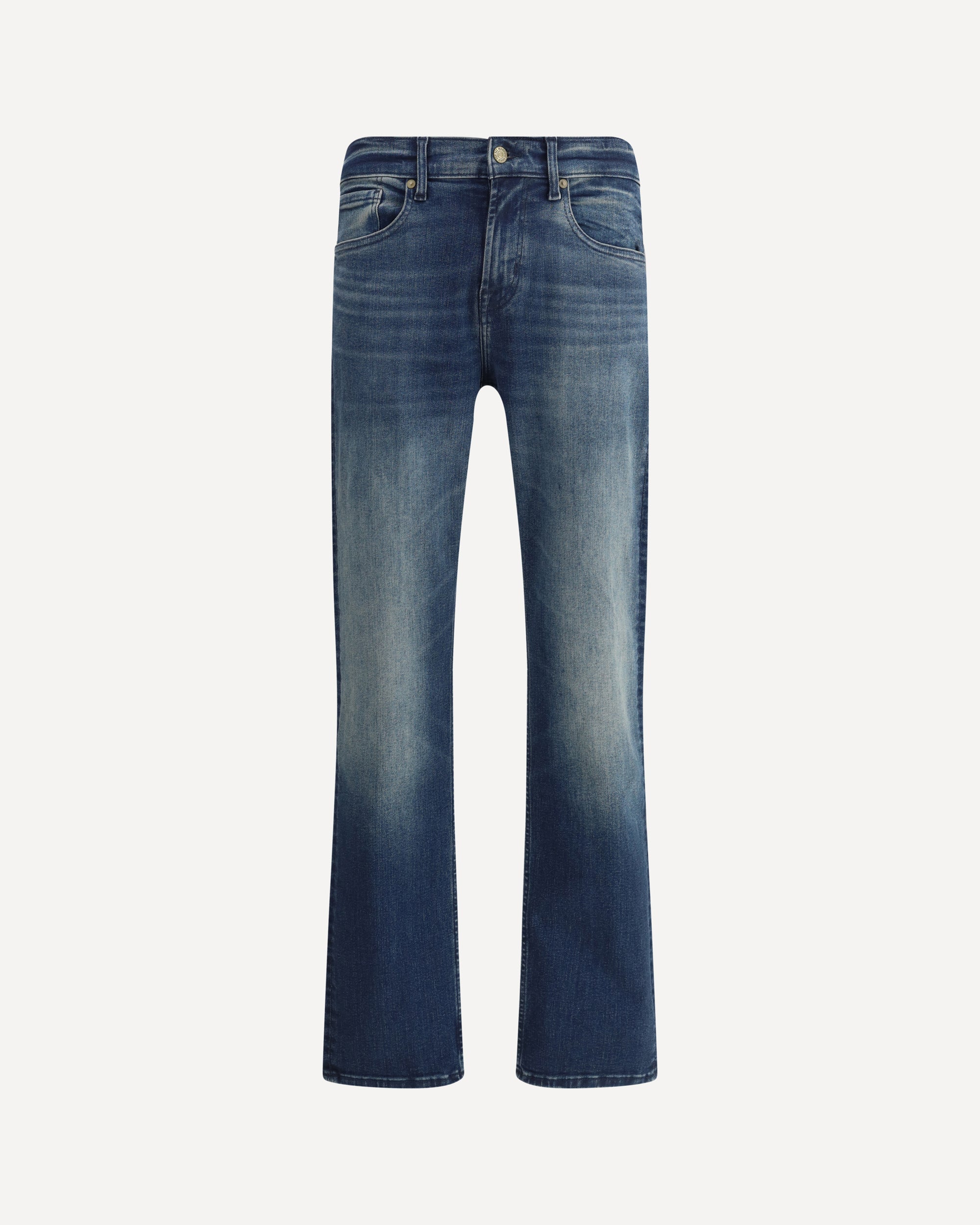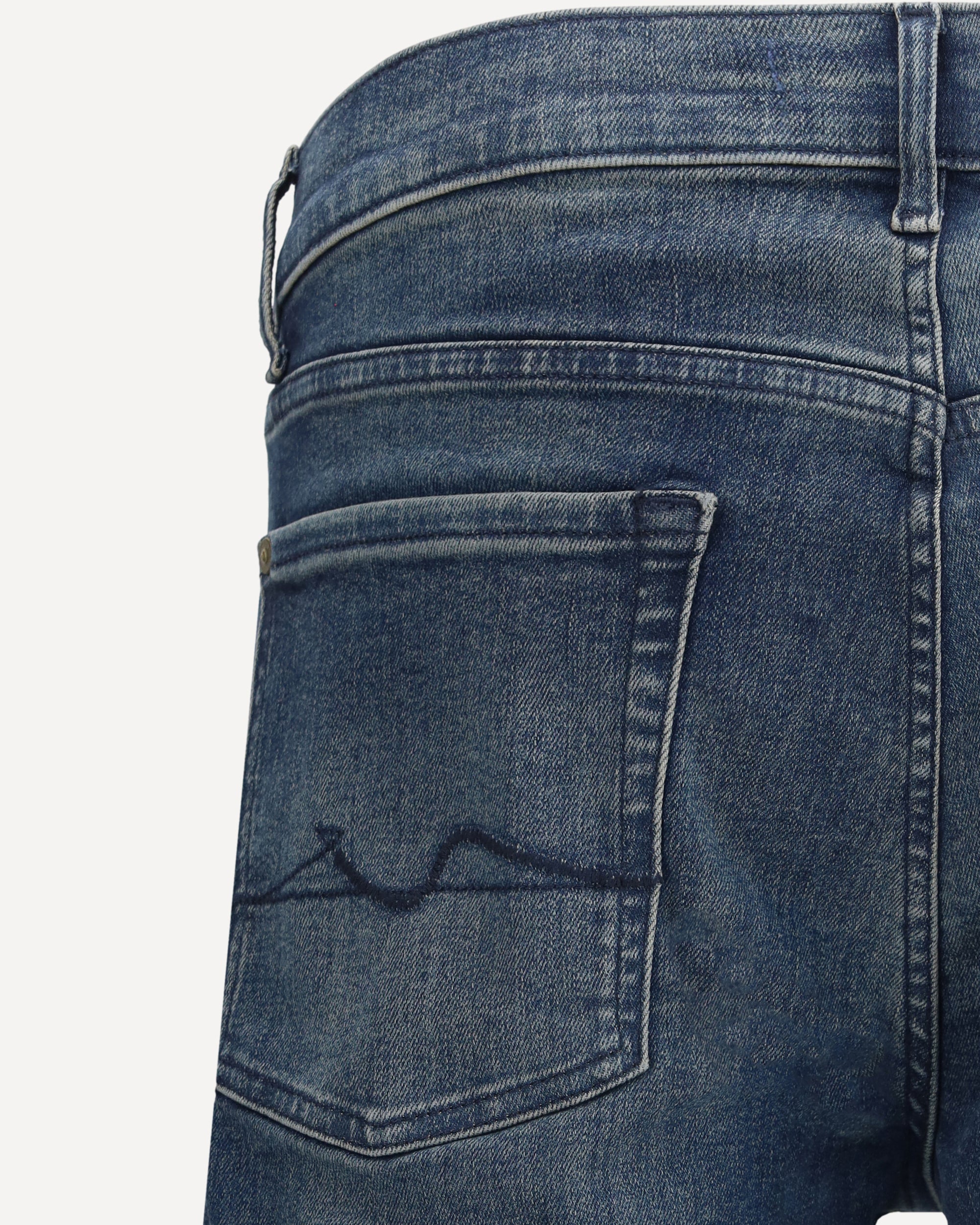 Slimmy Largo Jeans in cotton by 7For. The front closure is zipper and button, while belt loops on the waistband allow a belt to be added for a customizable fit. The style is a five-pocket, with two side pockets, a coin pocket and two back pockets. These jeans combine a slim fit with a wider end, offering a modern and versatile look.