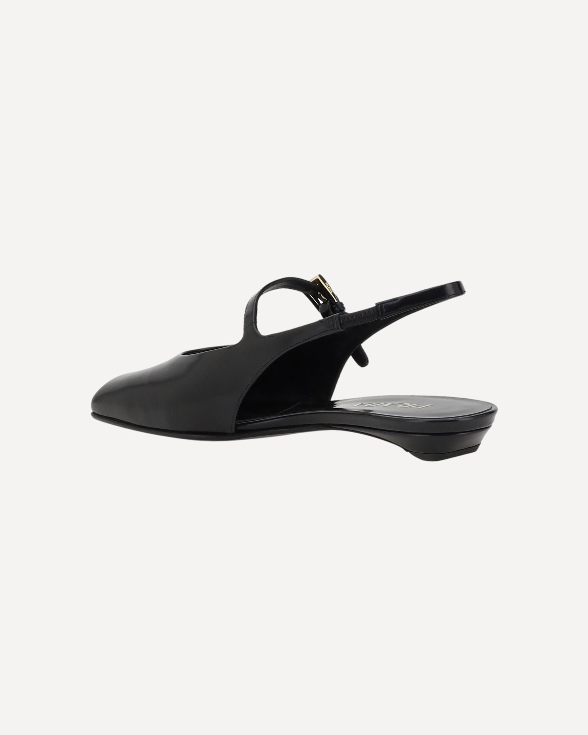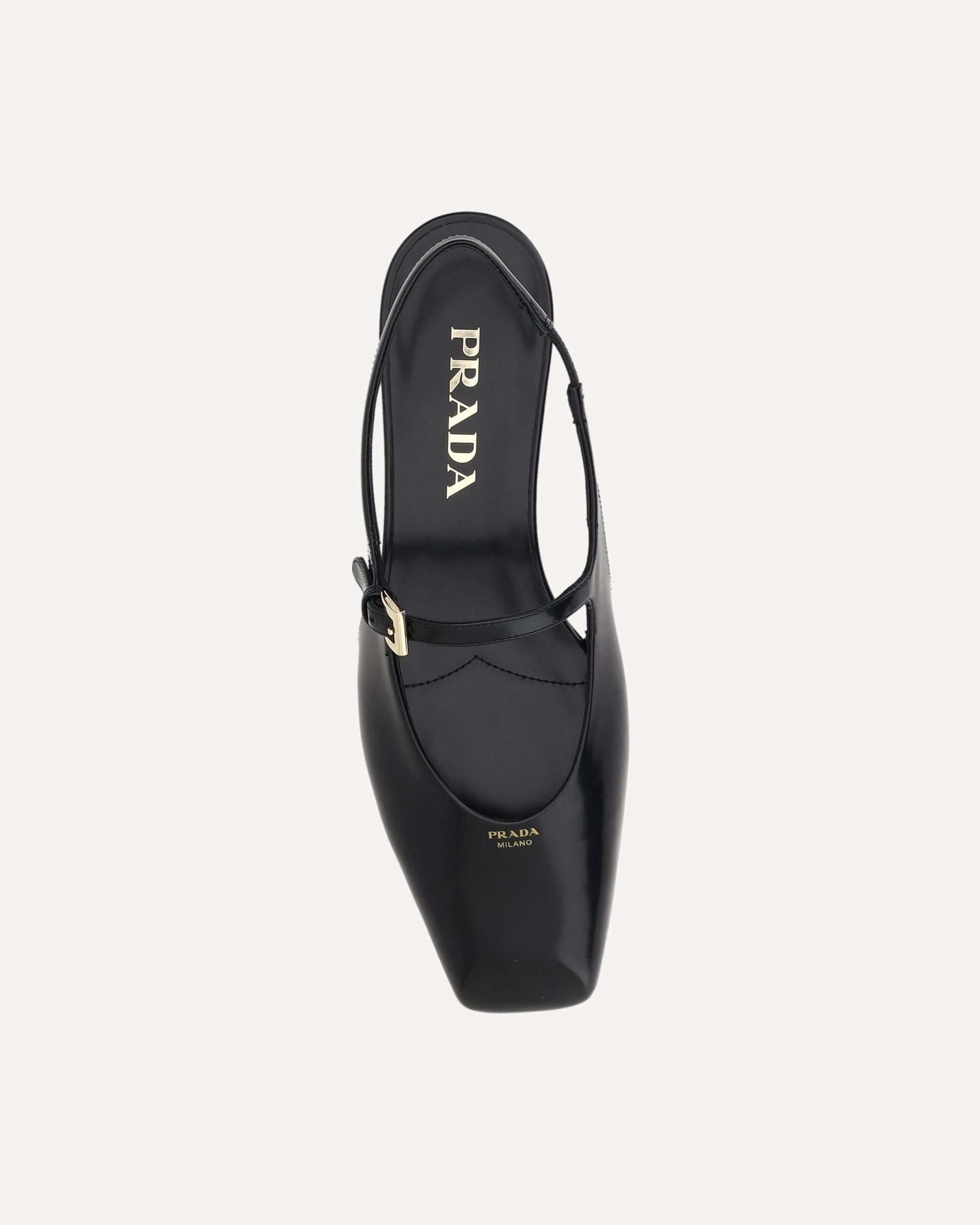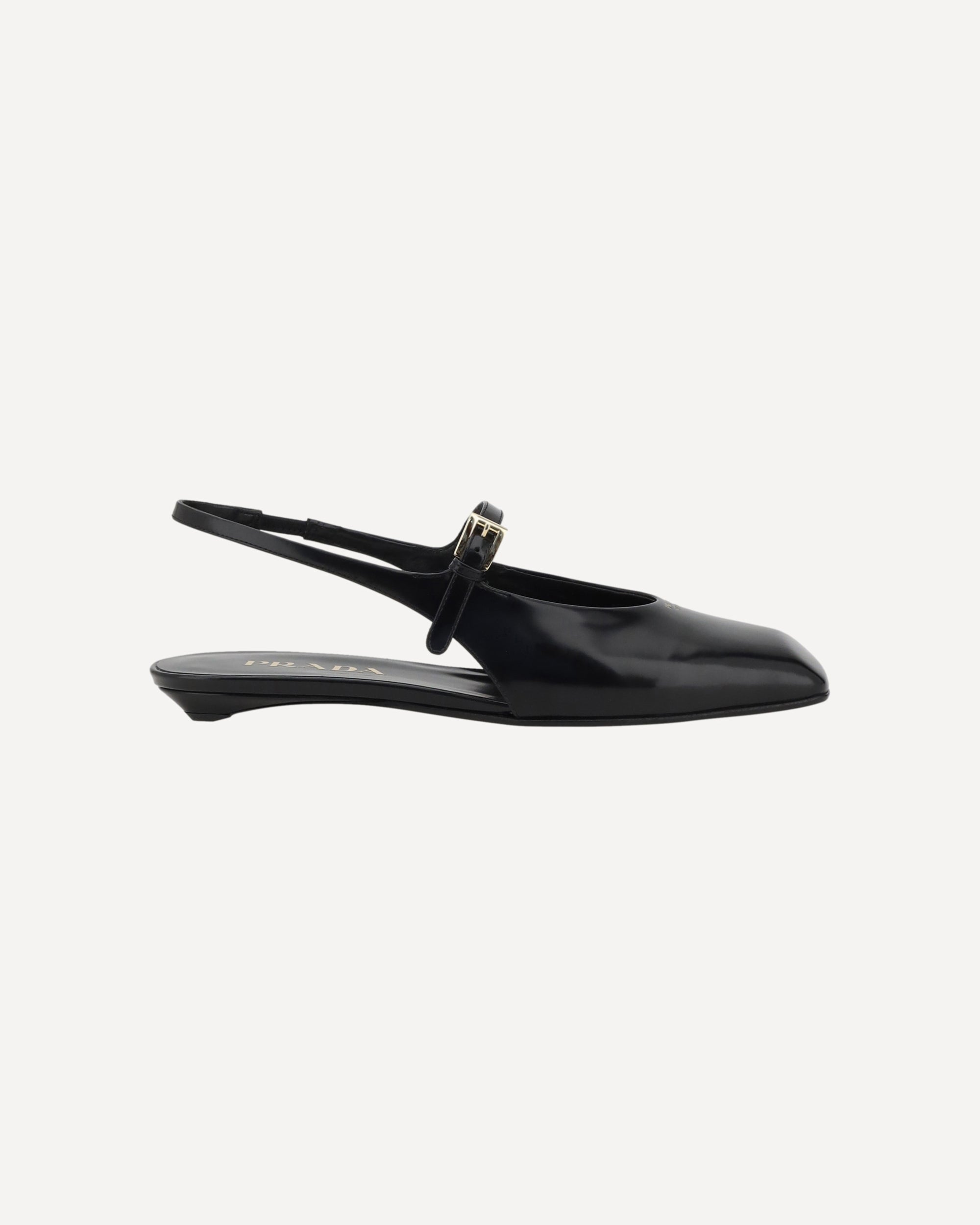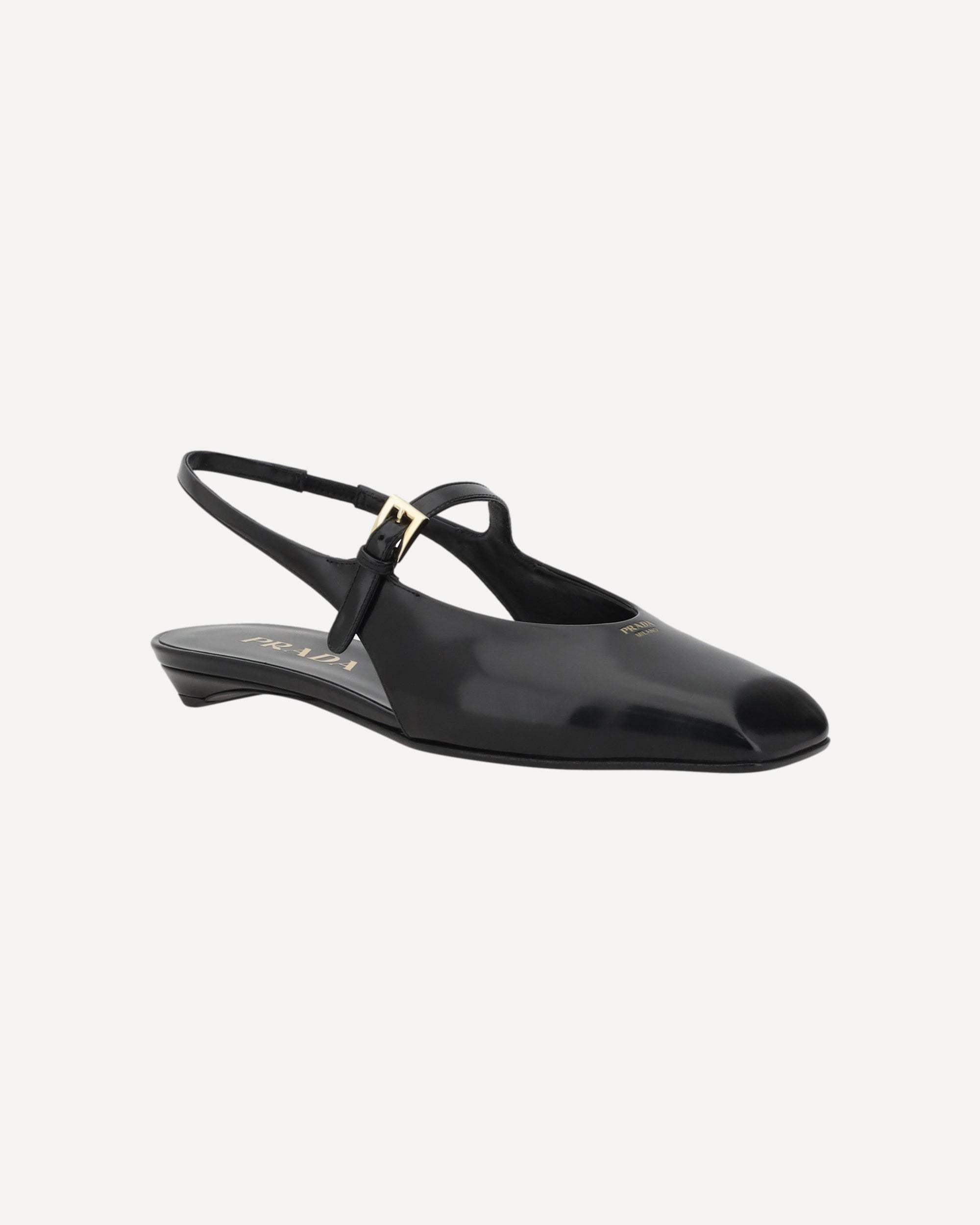 Prada's Patent leather Slingback Décolleté pumps are an elegant and refined design featuring an adjustable buckle strap at the front for a customized fit. The stretch slingback ensures comfort and adaptability, while the small leather heel adds a touch of class and practicality. The iconic contrasting monogram on the front lends a distinctive and luxurious detail. The logoed insole completes the design, confirming the brand's authenticity and elegance.