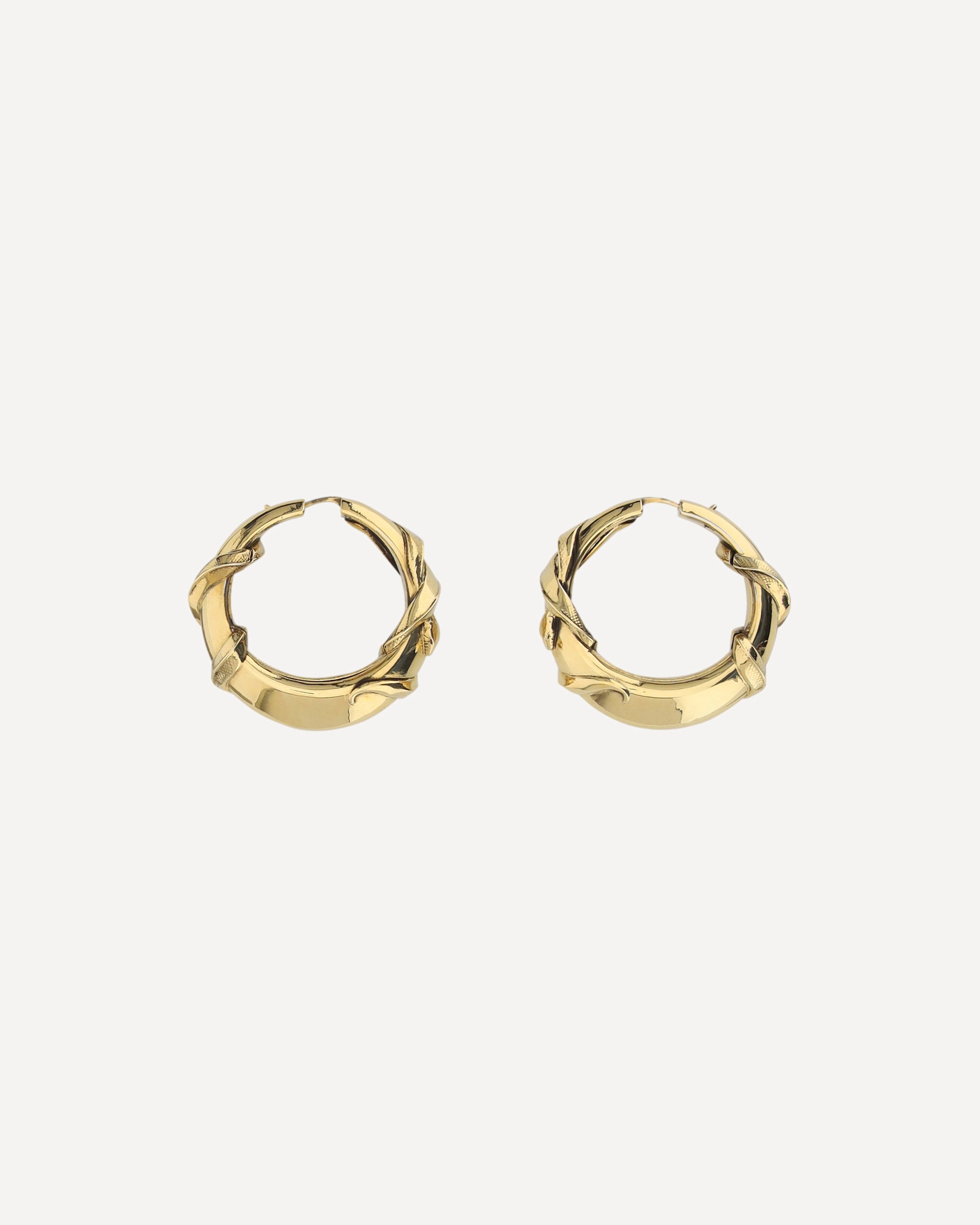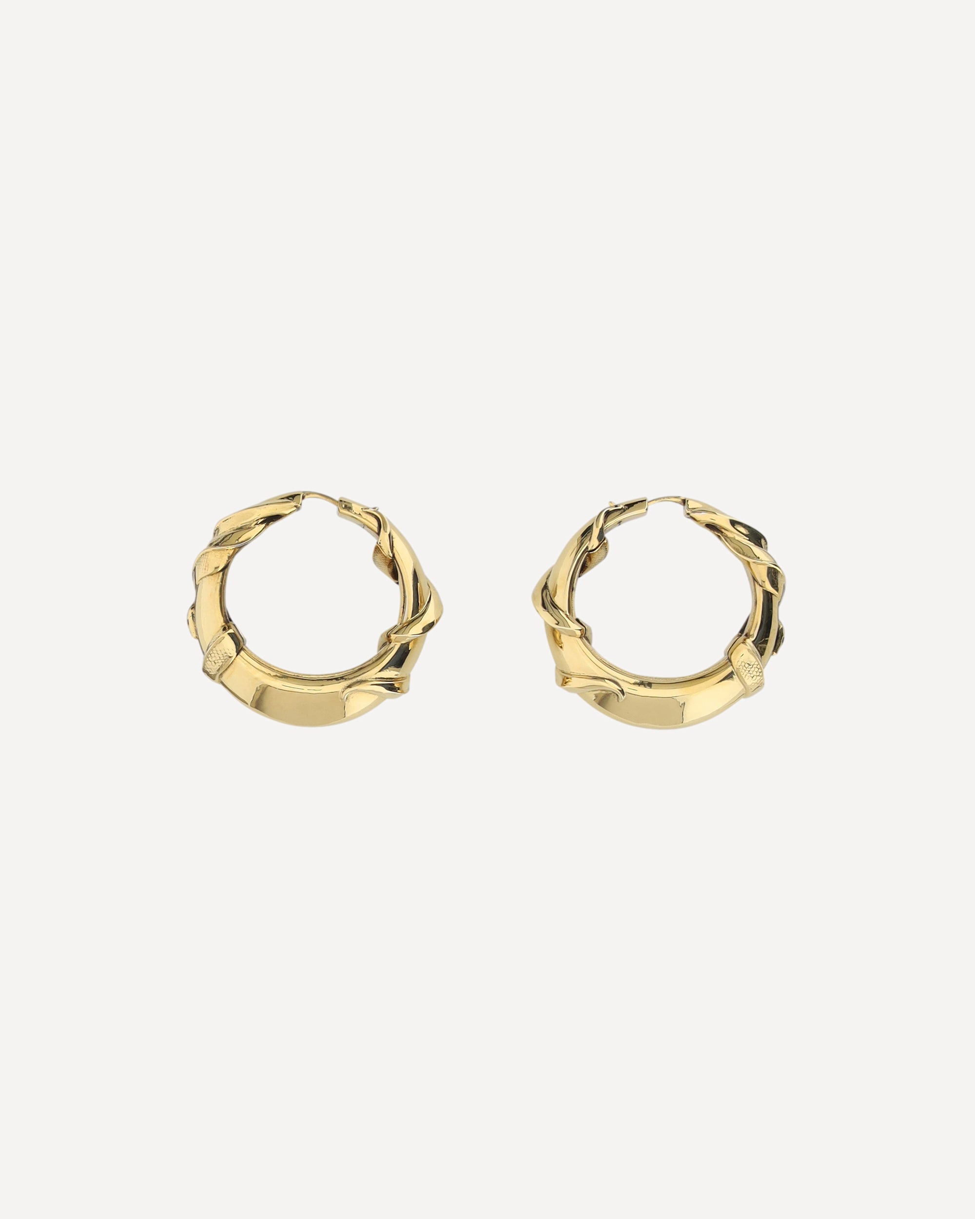 The Snake Earrings by Alexander McQueen are a round model with a bold design, featuring an elegant coiled snake that wraps around the shape, a distinctive symbol of the fashion house.