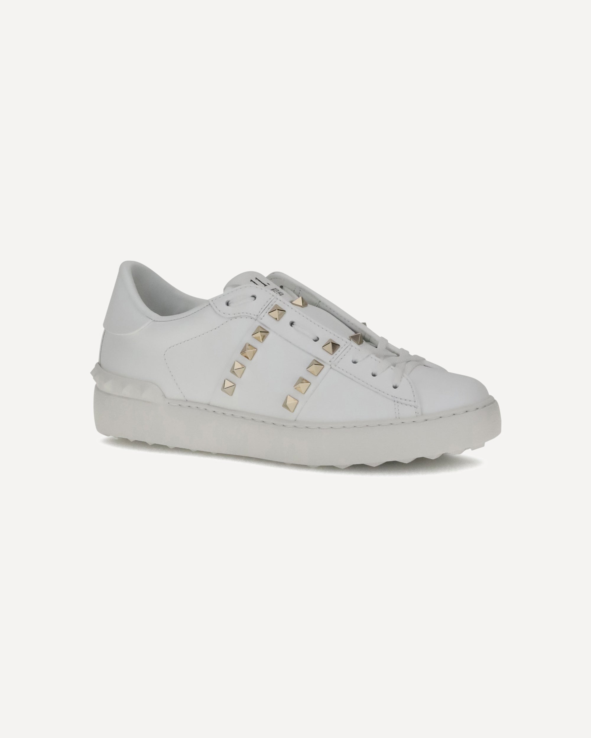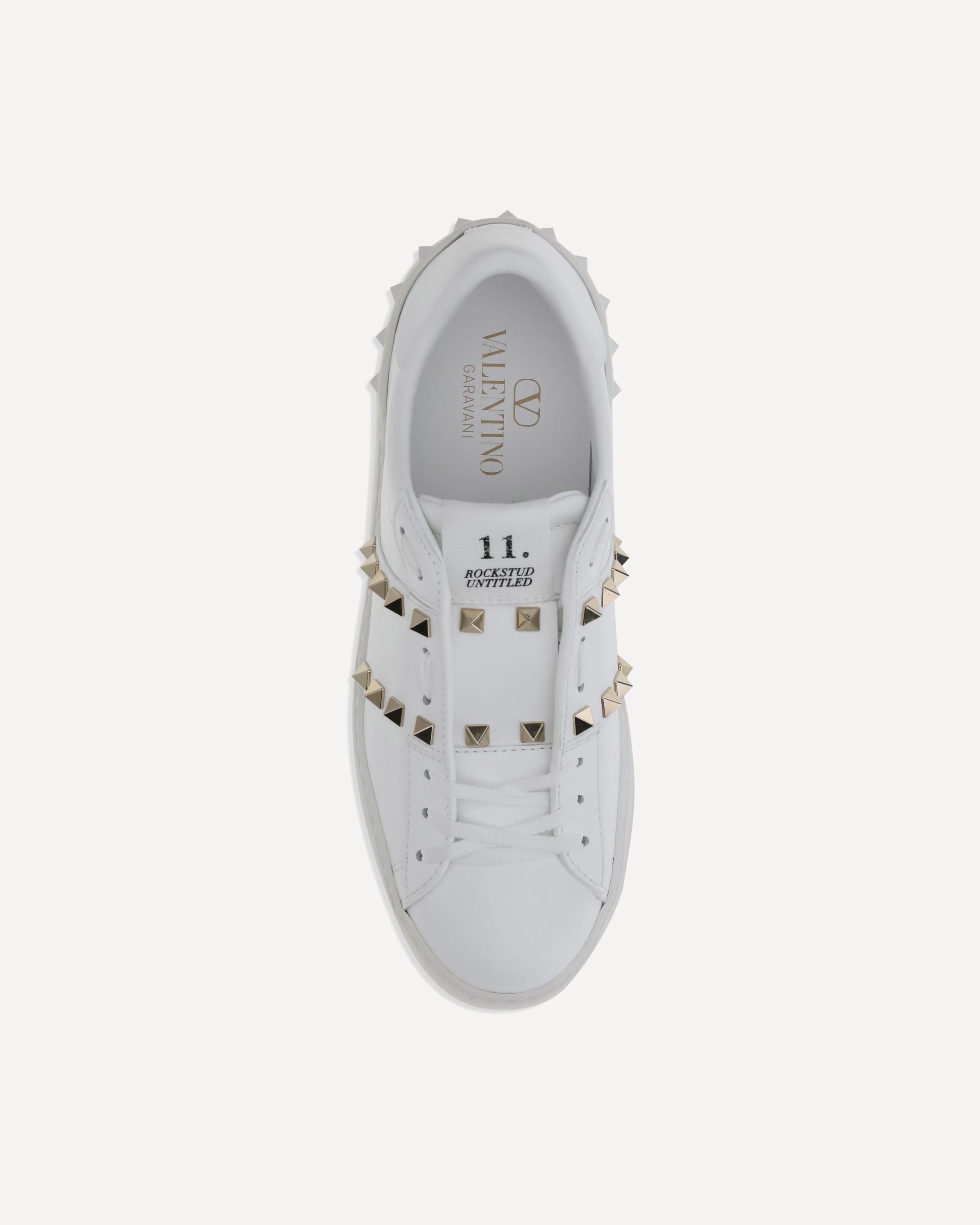 Valentino Garavani's Rockstud Untitled Sneakers are a bold and refined interpretation of urban style. Crafted from white calfskin, they feature a platinum-finish studded appliqué band that lends a touch of shine and grit to the design. The special label with the number 11 adds an exclusive element, while the white rubber sole, embellished with rubber studs on the back, completes the look with a distinctive, modern accent.