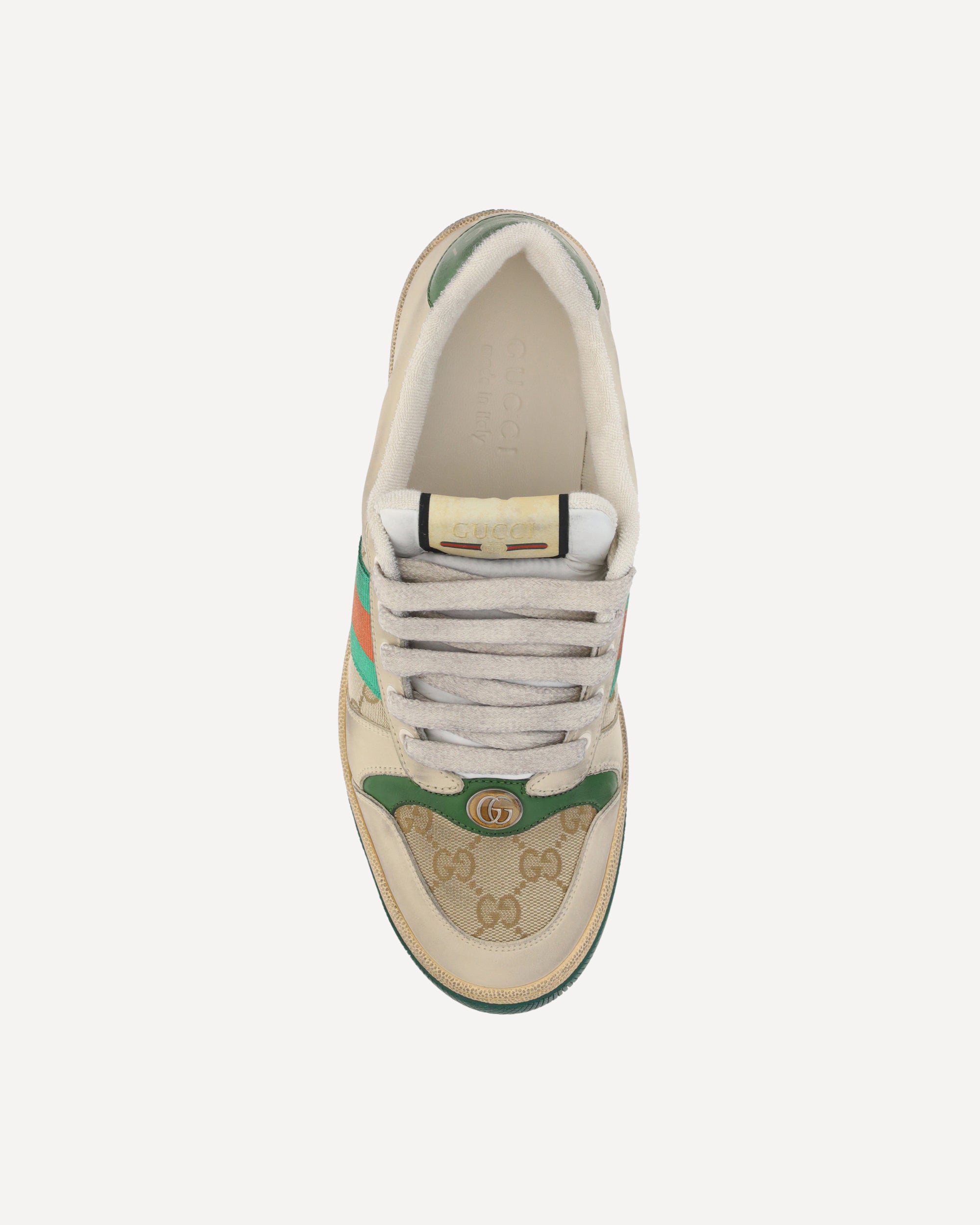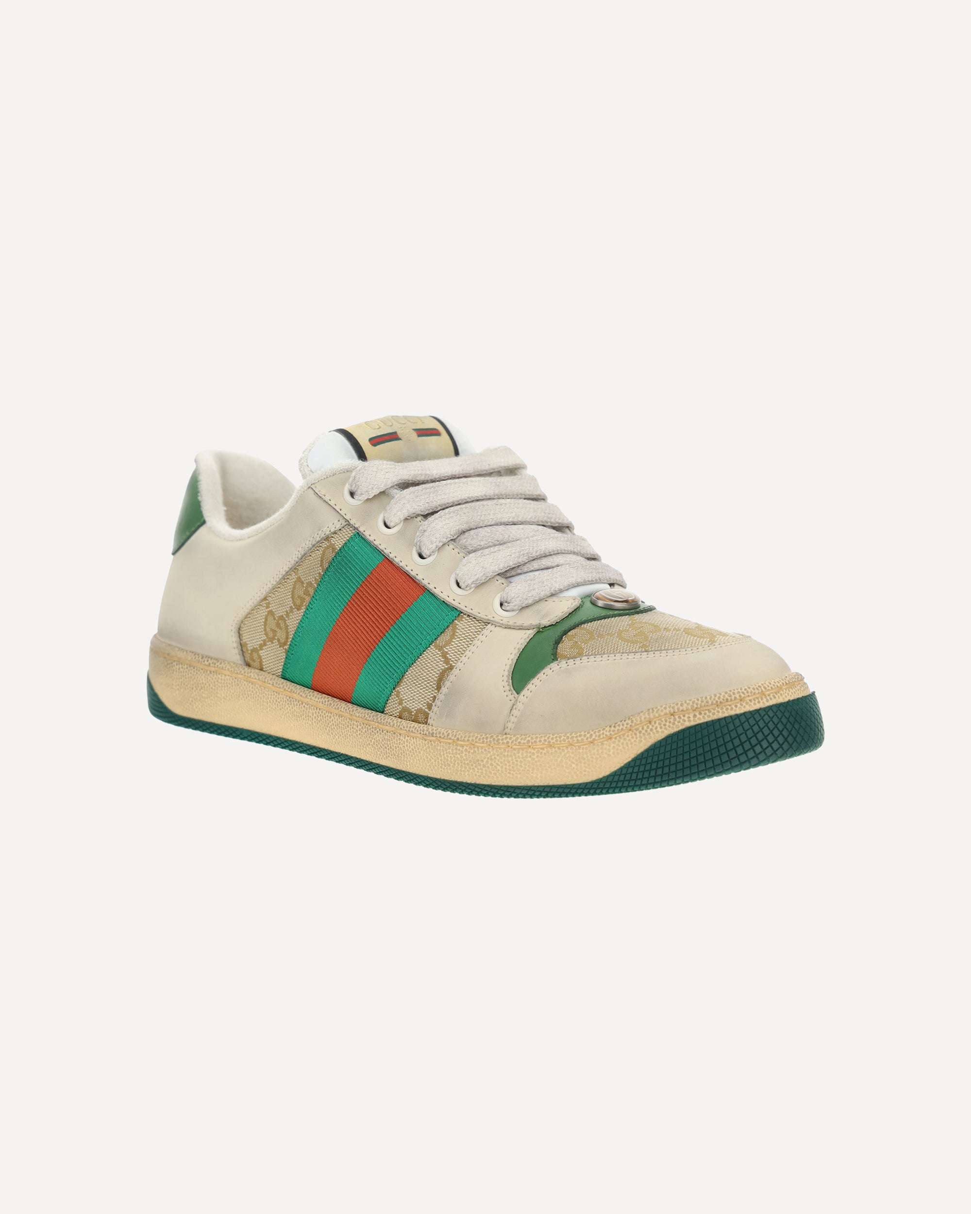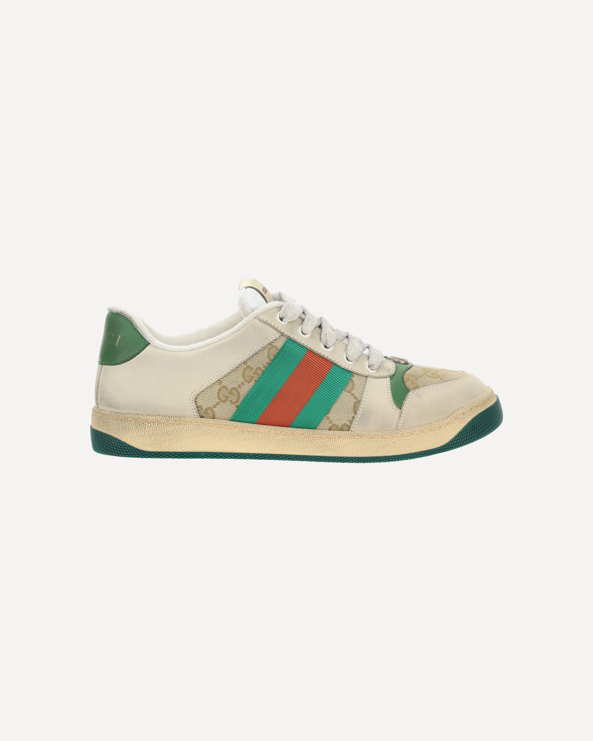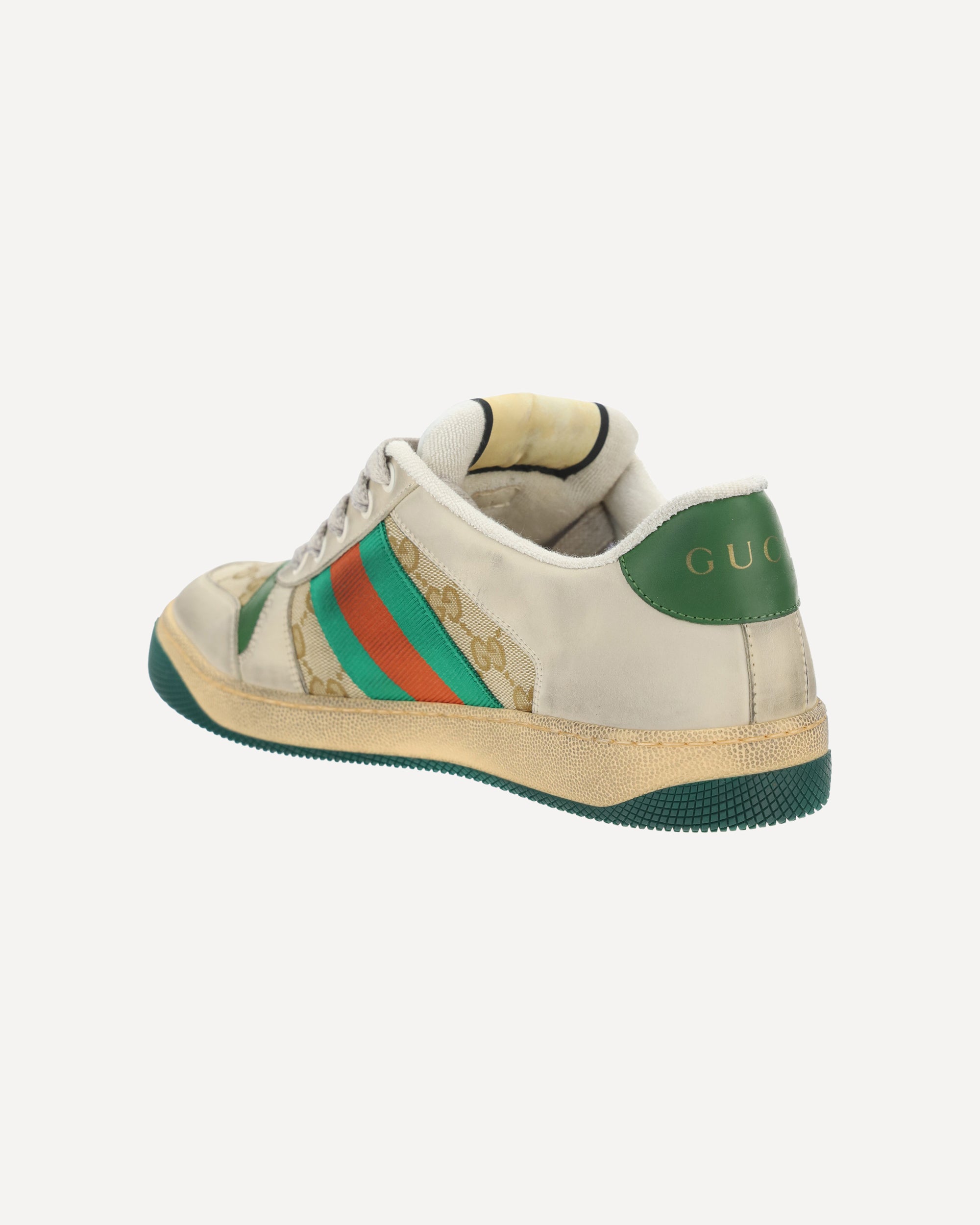 Sneakers by Gucci, lace-up front closure, iconic brand signature applied in contrast on front tab, iconic brand monogram repeated all-over, iconic brand monogram plaque applied on front, iconic brand colors on side panels, contrasting leather patch on heel.