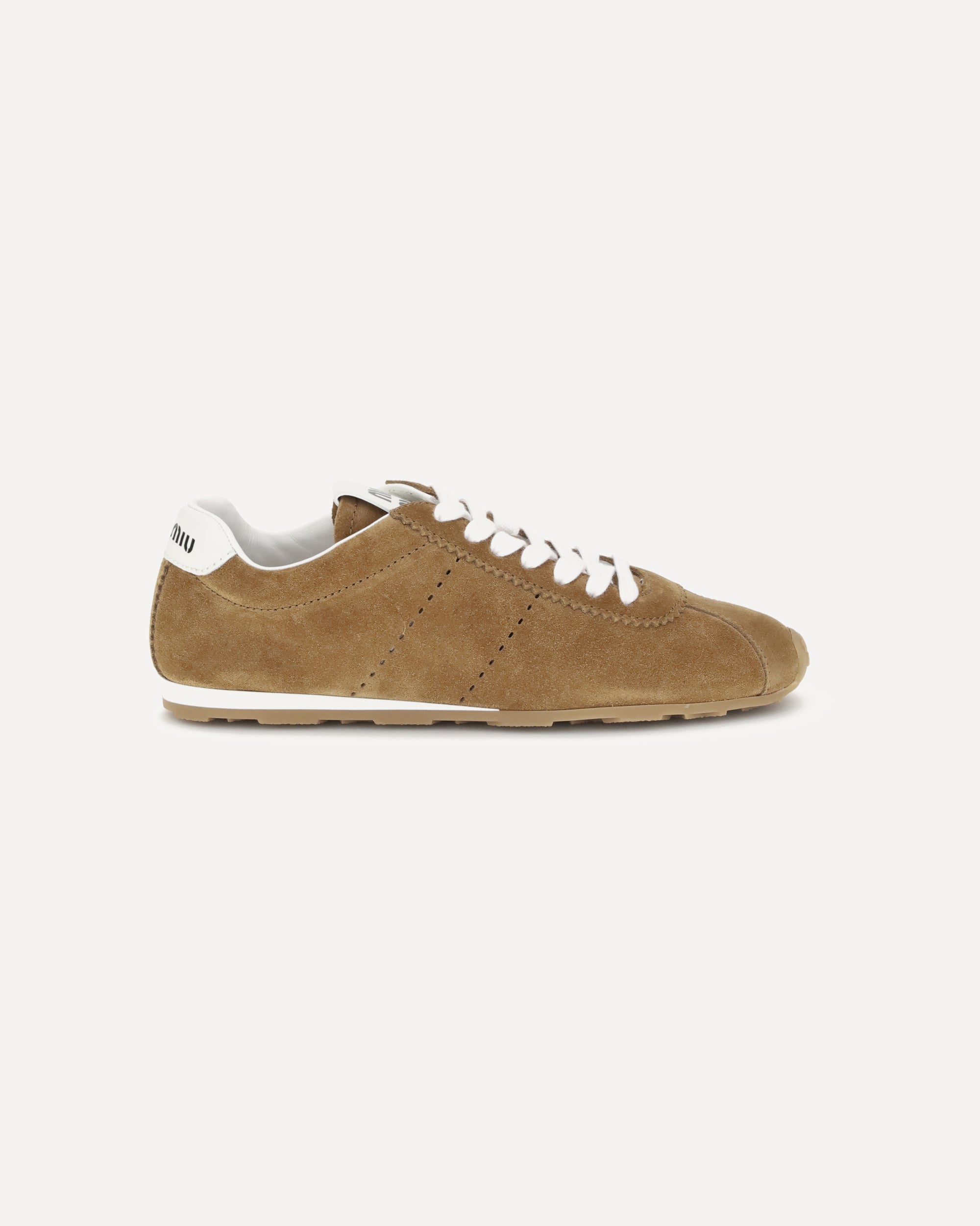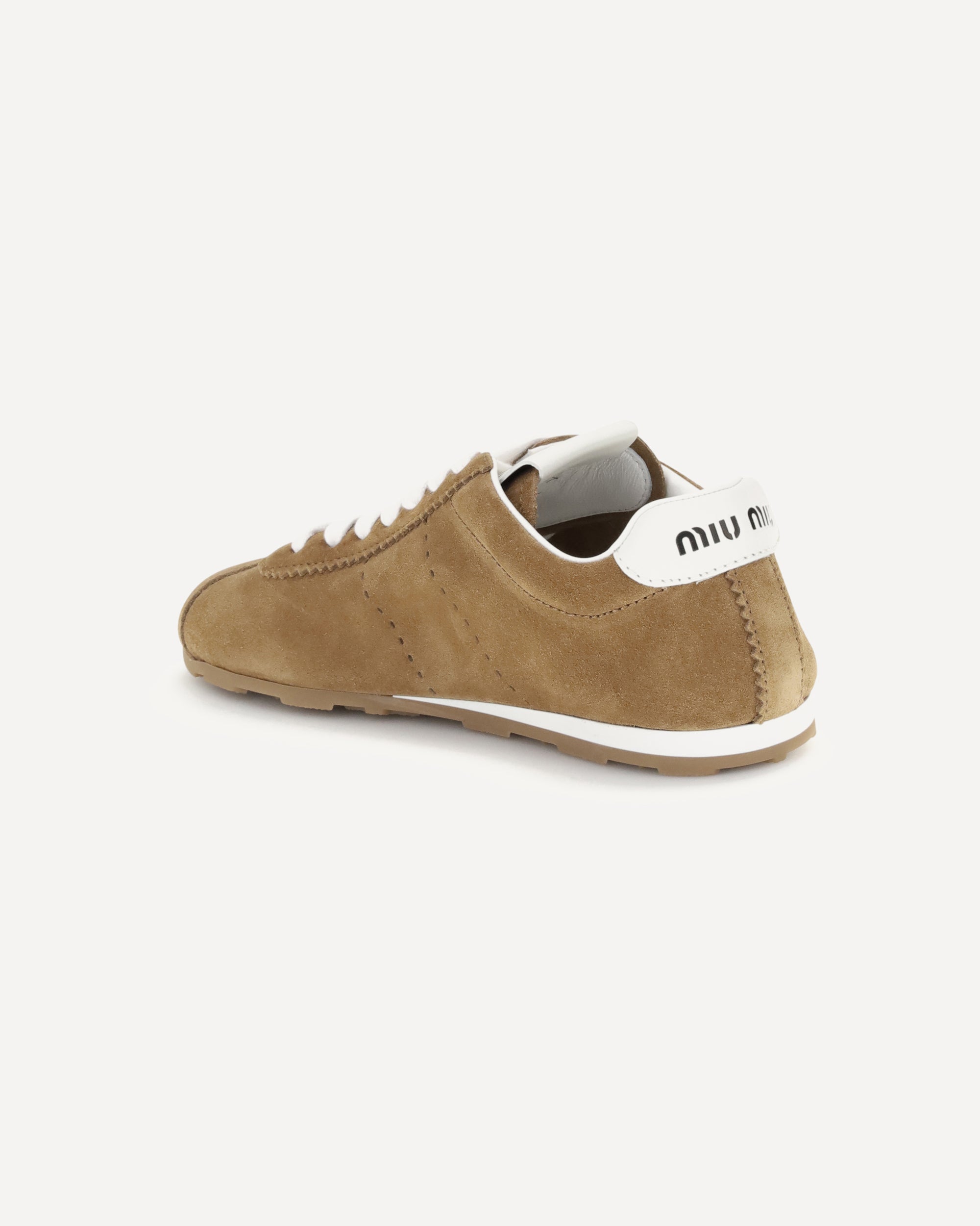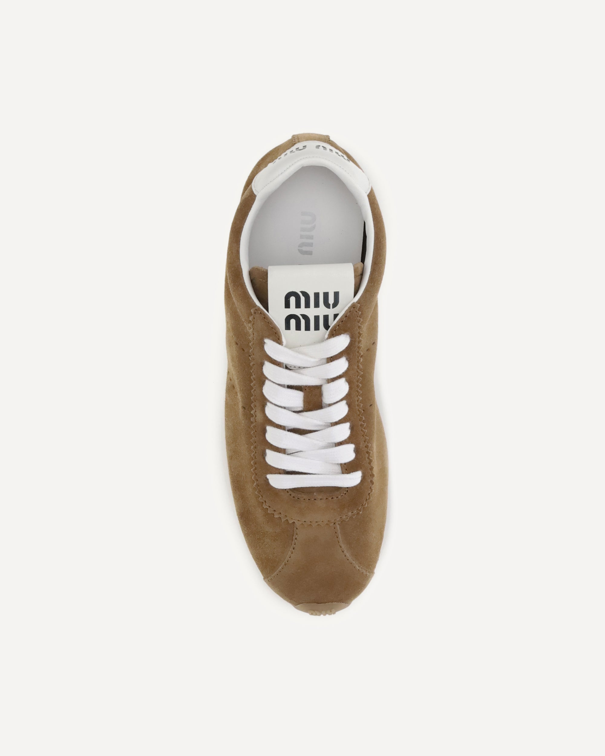 Miu Miu's Suede Plume Sneakers combine refined workmanship and fine materials with an essential and extremely lightweight design. The logo stands out iconically on the tongue and back, lending a distinctive touch. The perforated upper offers breathability, while the flat string lacing ensures a comfortable fit. Completing the design is a rubber outsole and tread with lug pattern, providing grip and flexibility.