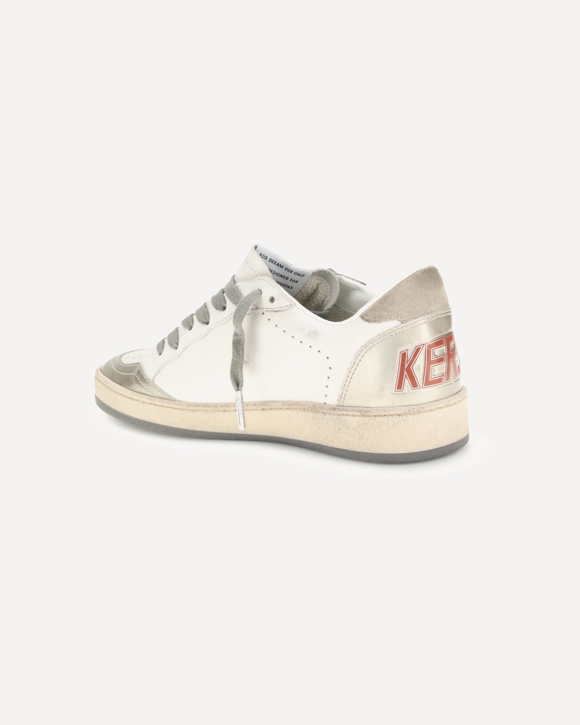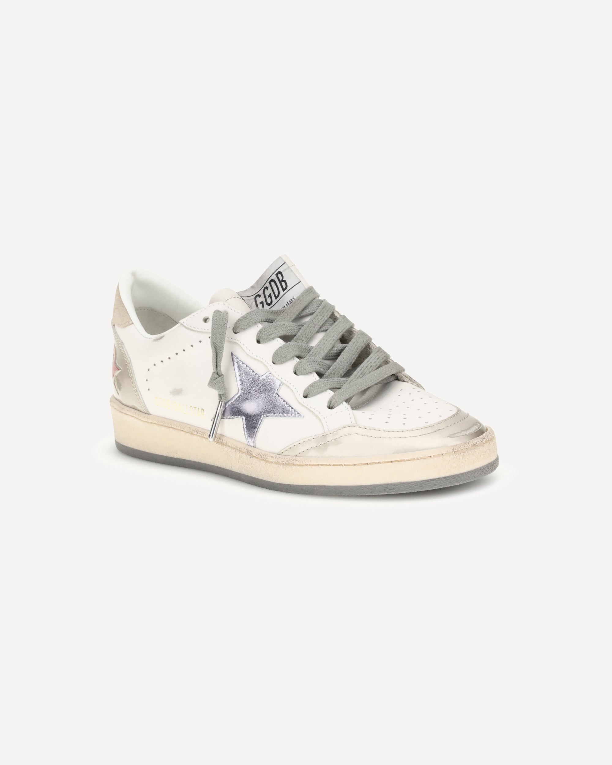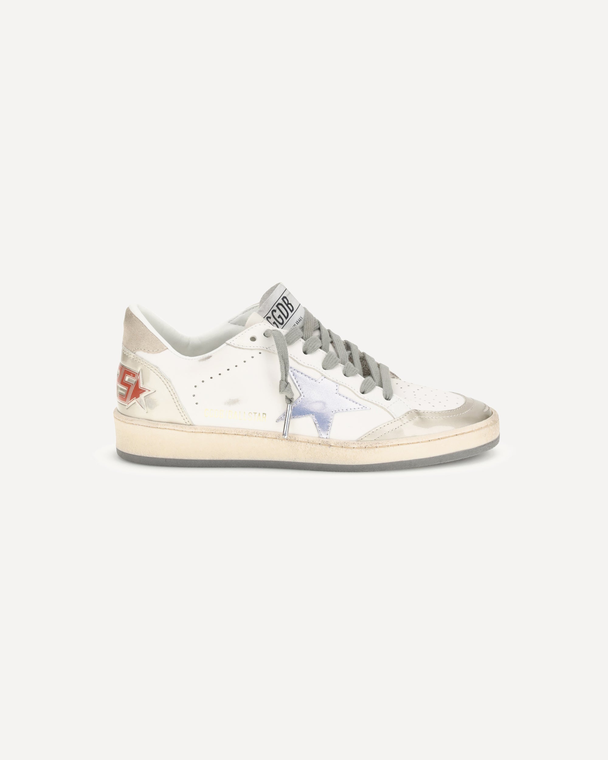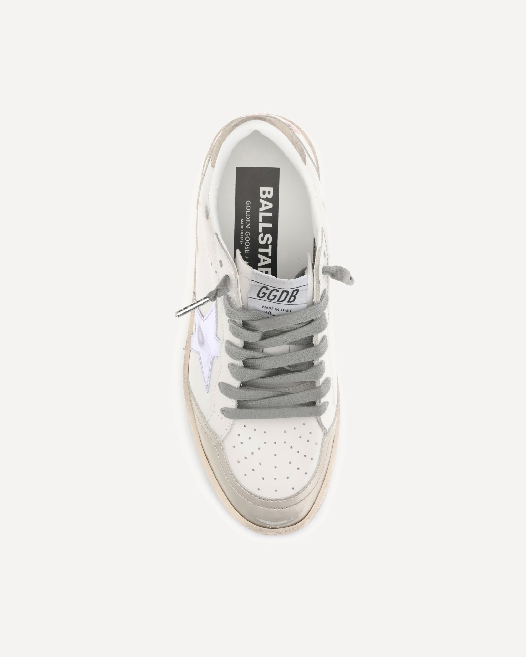 The Ball Star Sneakers by Golden Goose are low-top leather shoes featuring lace-up closure, a metallic leather star detail, and an embossed logo on the heel. The rubber sole completes the design, offering comfort and everyday style.