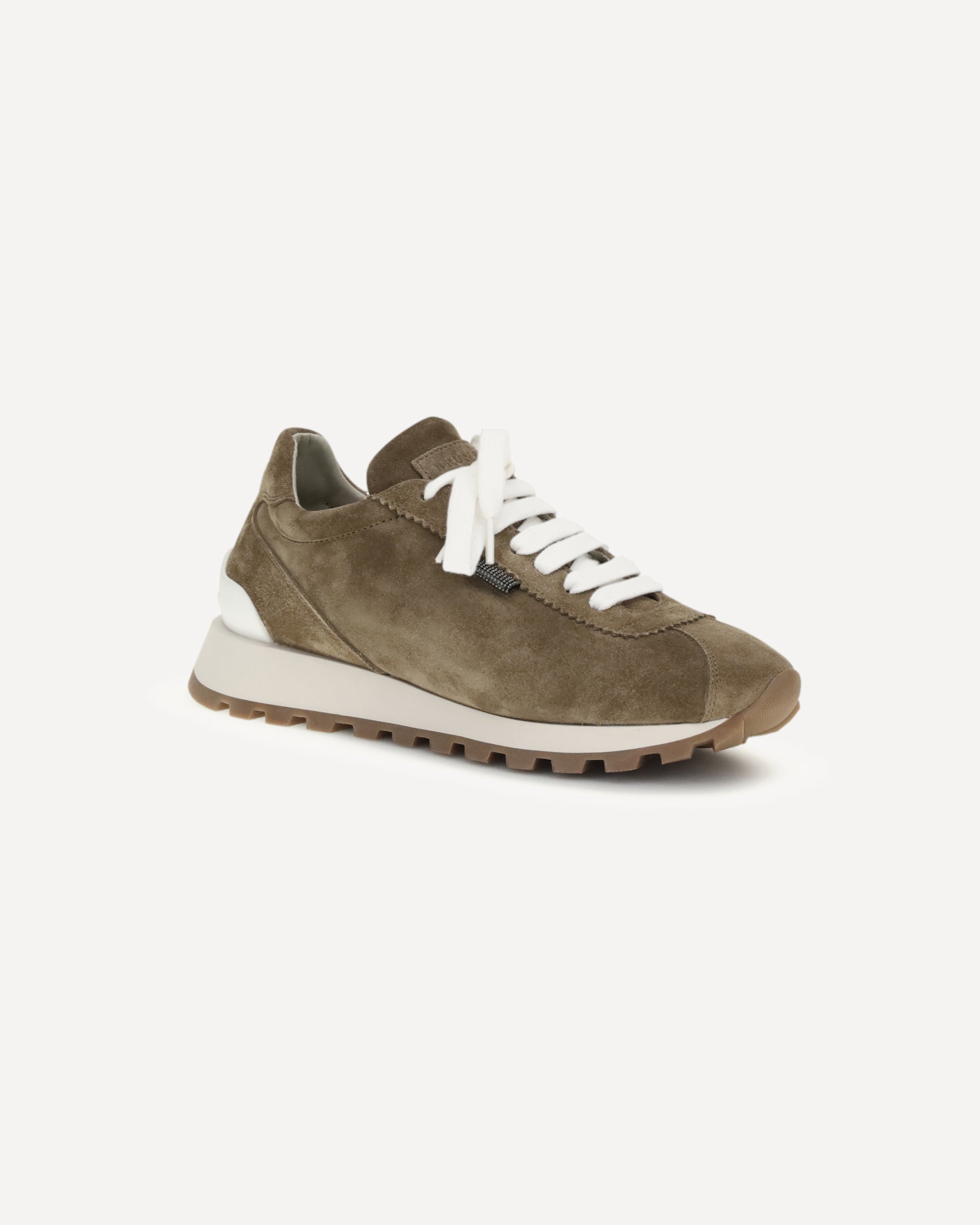 The leather Sneakers by Brunello Cucinelli combine elegance and comfort. The suede design lends a refined touch, while the front lace-up closure ensures an adjustable fit. The round toe ensures comfort, while the knurled platform sole adds a modern touch and extra grip. The shiny bead detail on the front enhances the brand's distinctive aesthetic. Completing the design is the logo-embossed press stud insole, a symbol of exclusivity and craftsmanship.