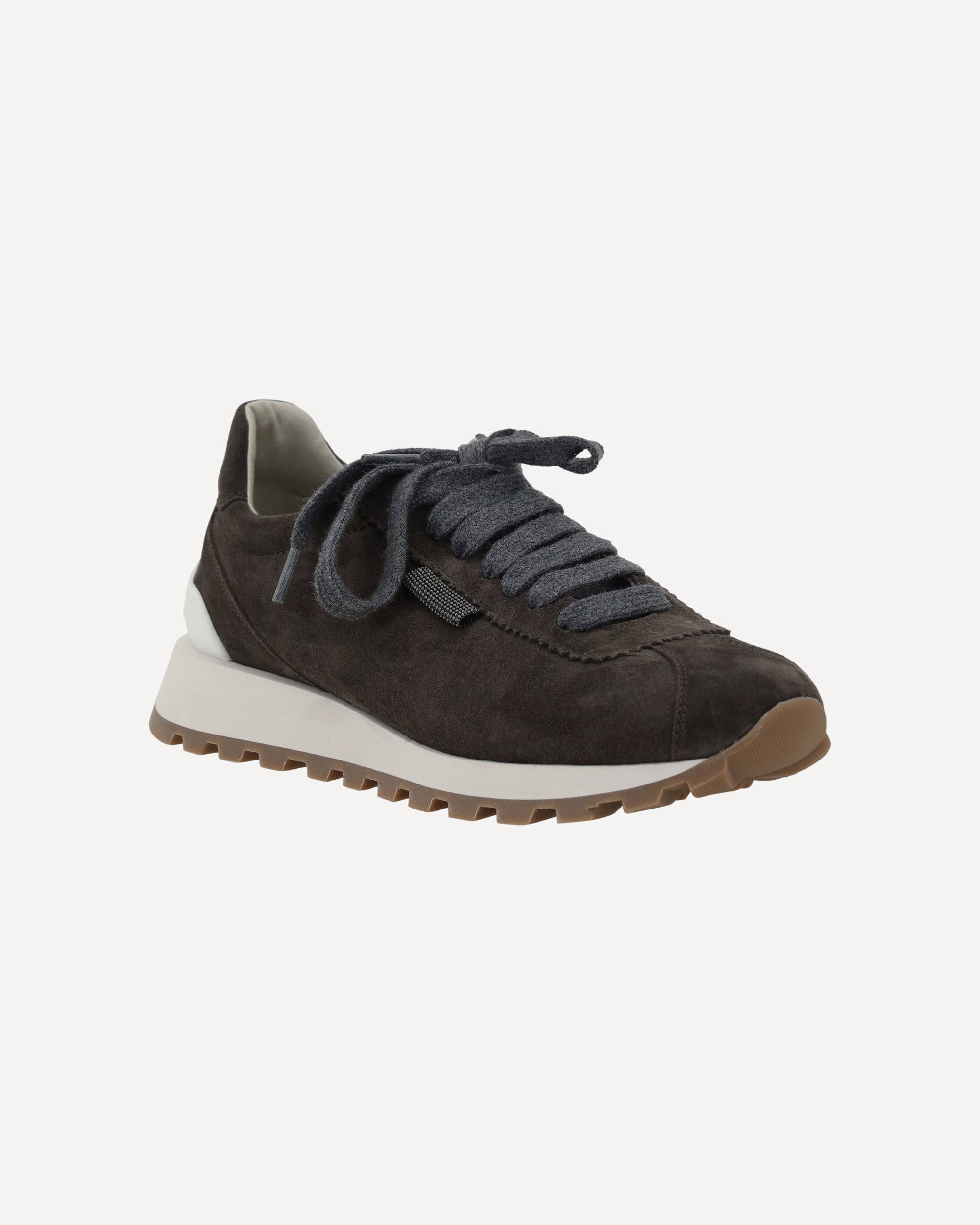 The leather Sneakers by Brunello Cucinelli combine elegance and comfort. The suede design lends a refined touch, while the front lace-up closure ensures an adjustable fit. The round toe ensures comfort, while the knurled platform sole adds a modern touch and extra grip. The shiny bead detail on the front enhances the brand's distinctive aesthetic. Completing the design is the logo-embossed press stud insole, a symbol of exclusivity and craftsmanship.