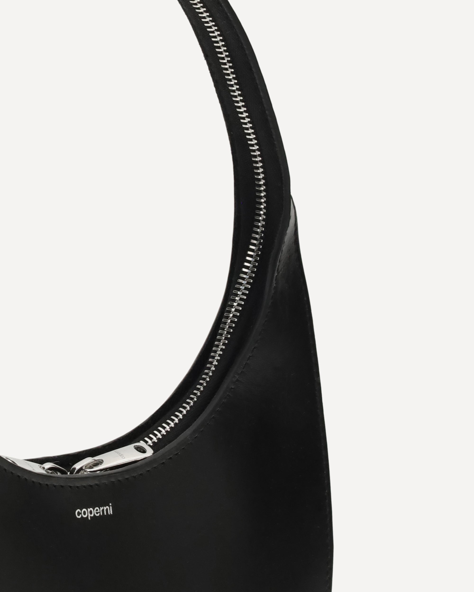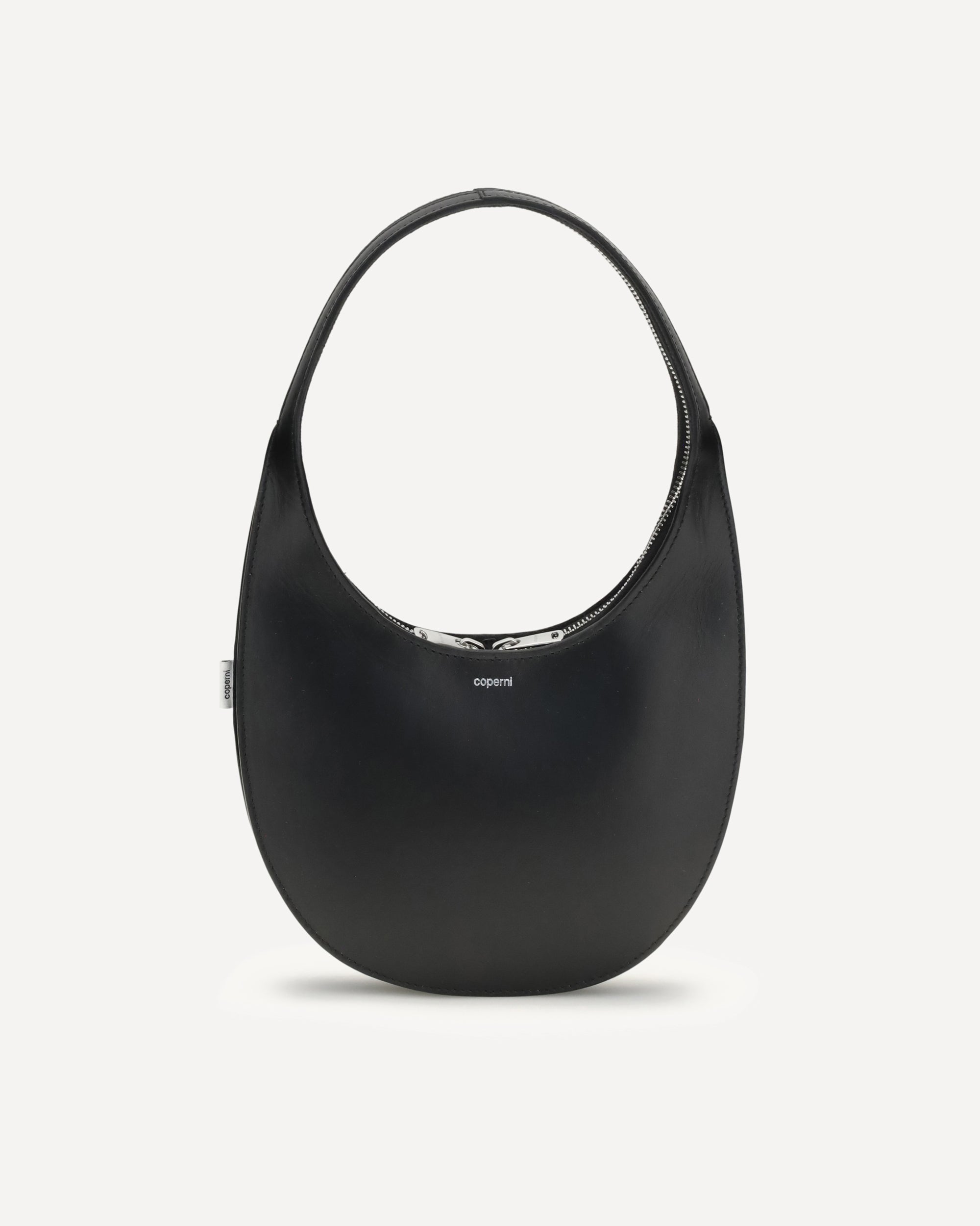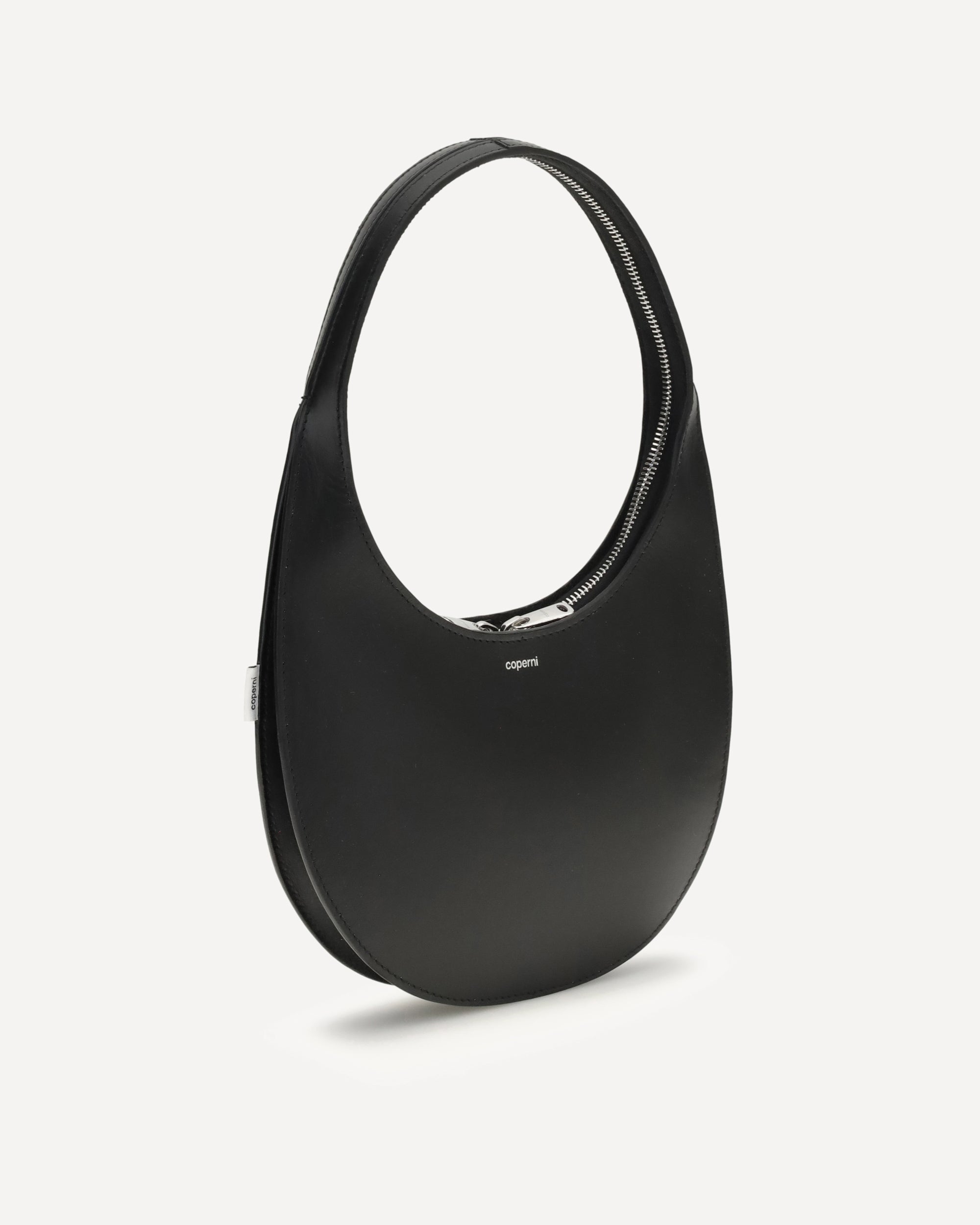 The Soft Swipe Bag by Coperni, in this “double gusset” version, features a slightly wider profile than the classic model, with a slimmer arched handle. Crafted from soft dark caramel suede, it is finished with the signature 360° hidden silver-tone zip and a discreet embossed Coperni logo on the front.