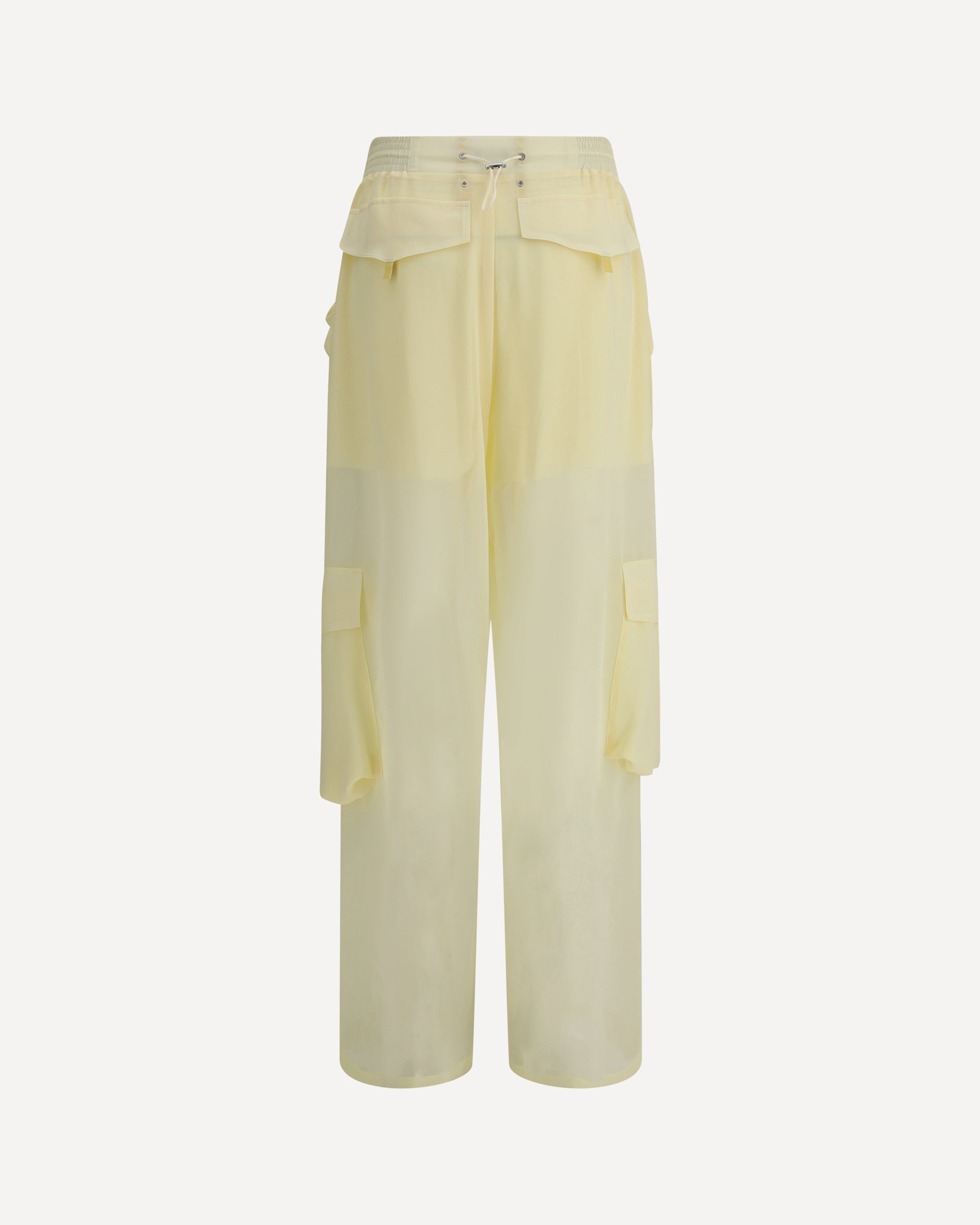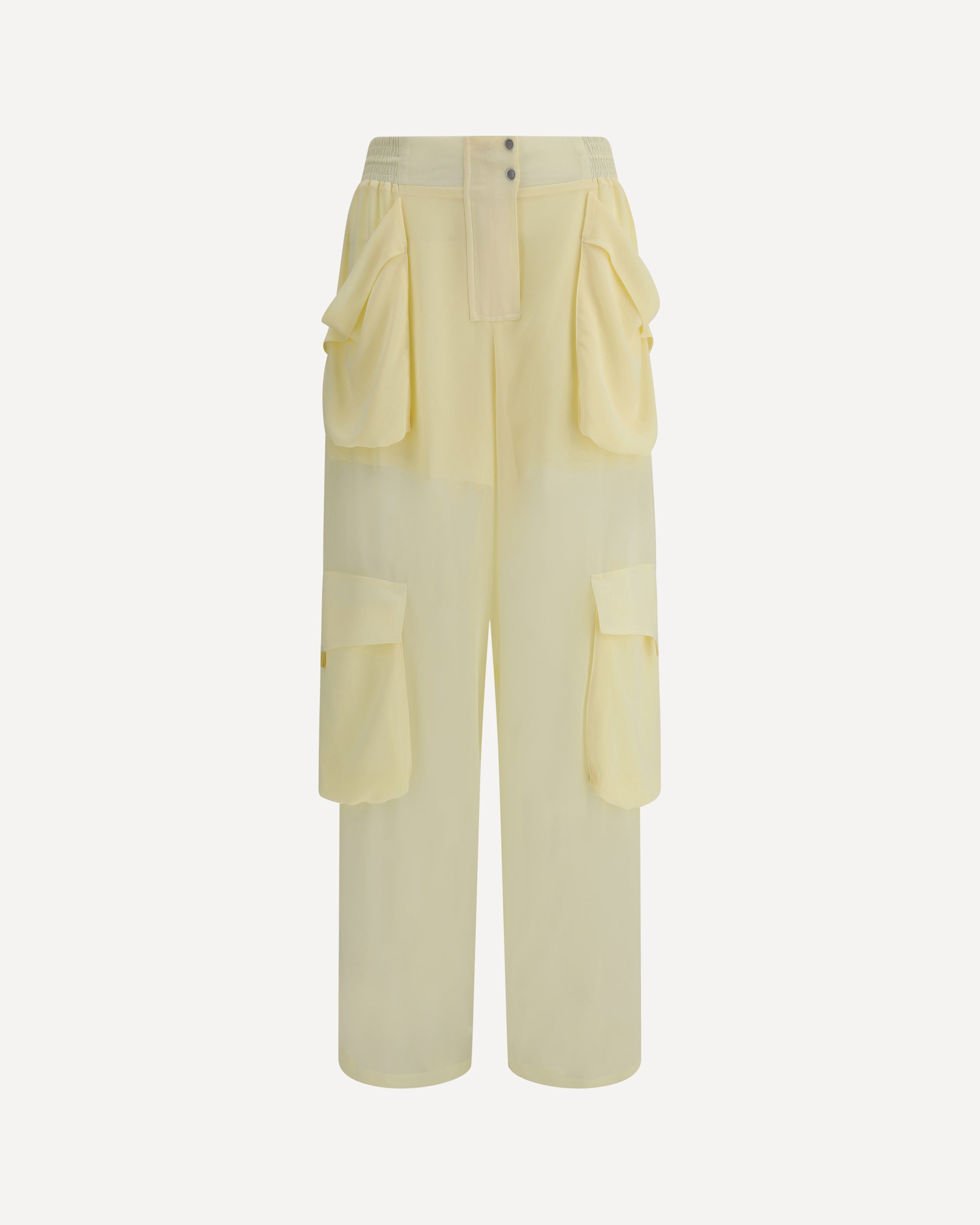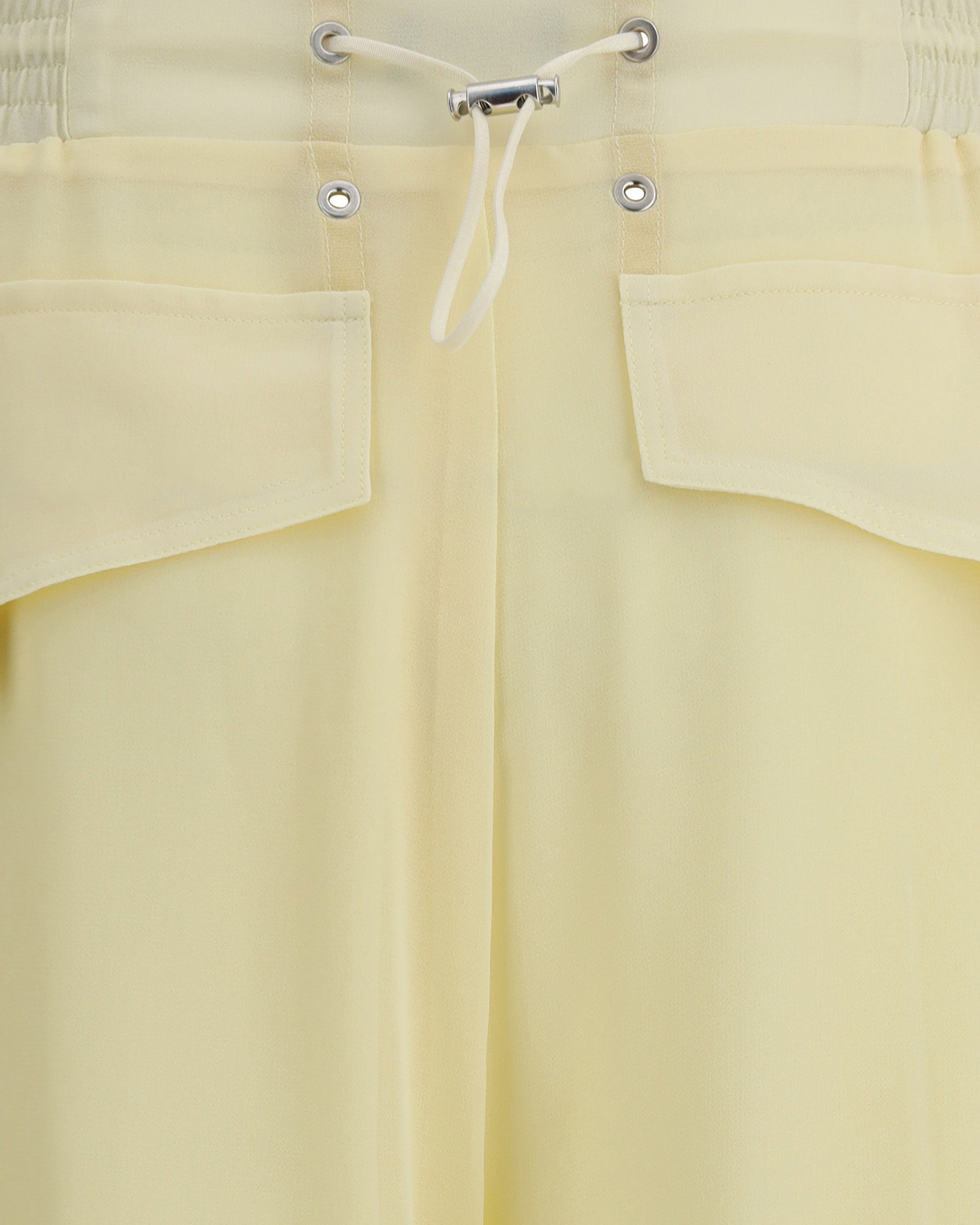 The Pinko Sottocasa Pants in georgette are an elegant and modern piece, characterized by a wide-leg model that offers a loose and fluid fit. The elasticized waistband, adjustable with a drawstring on the back, allows for a comfortable and personalized fit. The front closure with belt and button adds a tailored detail that gives a sophisticated touch. The two maxi welt pockets applied on the front and the two maxi cargo pockets on the side panels contribute to a practical and functional look, while the fake back pockets maintain a clean and minimalist look. The detail of the applied opaque shorts offers an additional layer of comfort and originality.