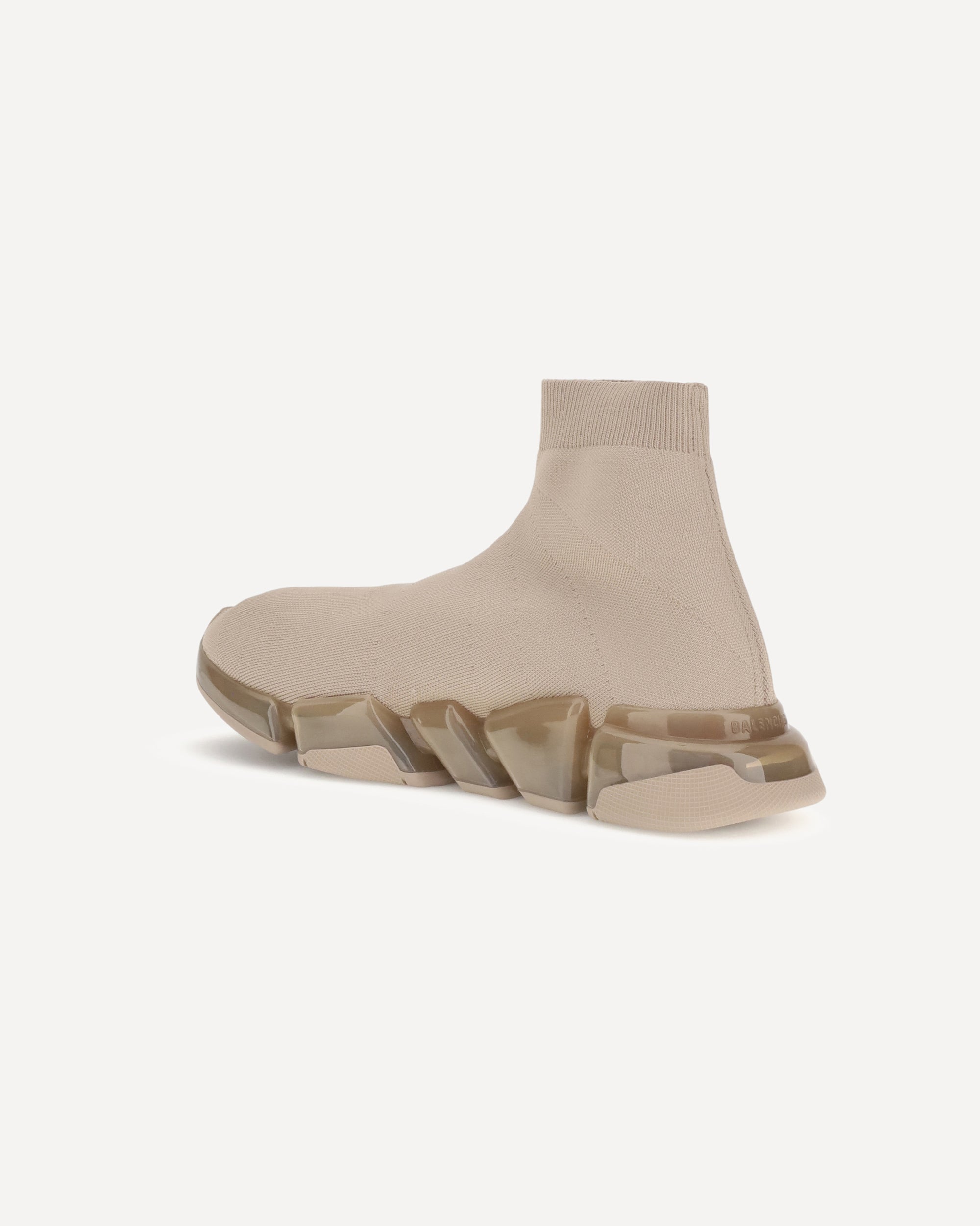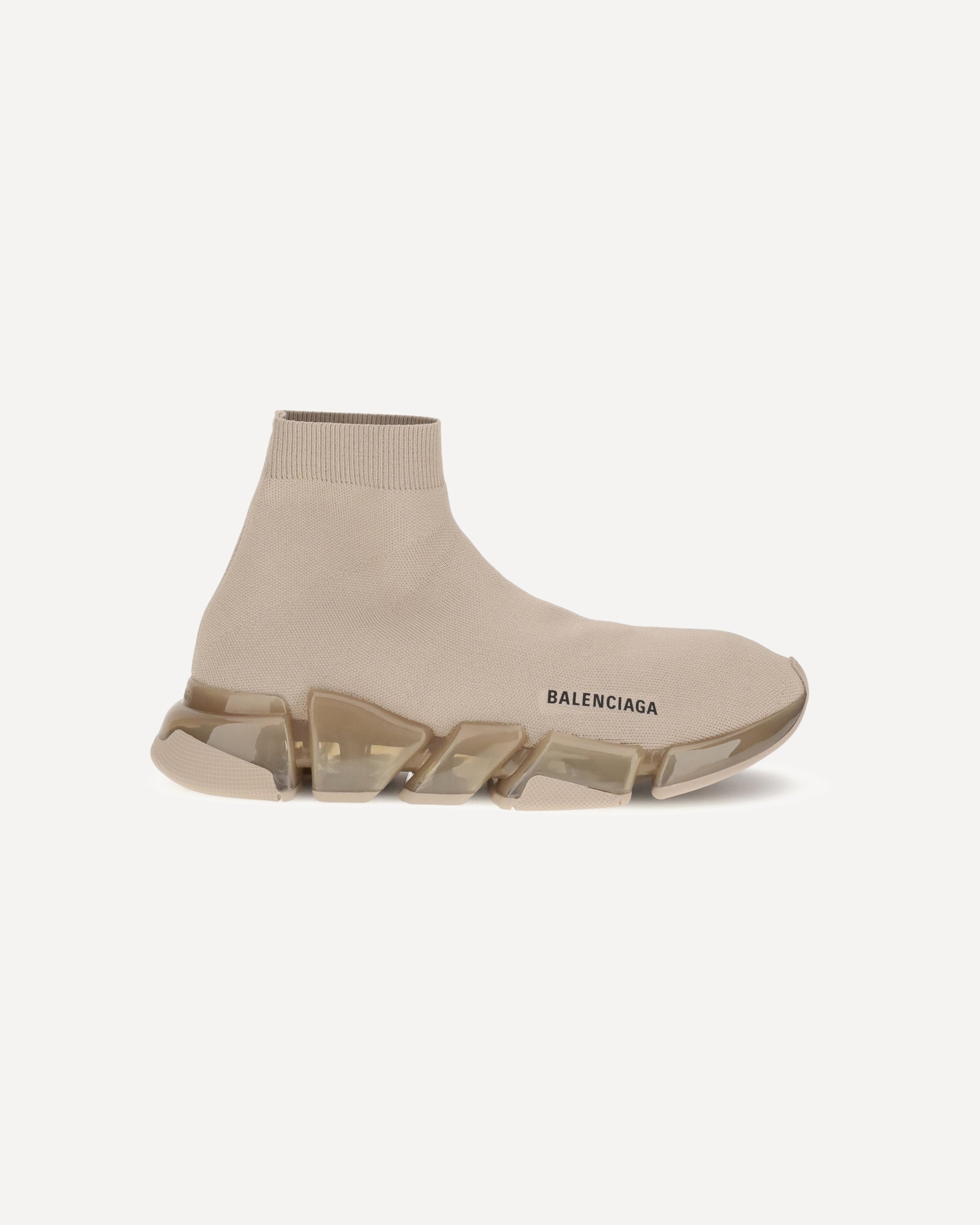 Balenciaga's Speed Sneakers are a bold and contemporary take on the sneaker concept, with an innovative design that combines comfort and style. The fitted sock style ensures a perfect fit and a lightweight feel, while the elongated toe on the front gives a sleek, modern look. The non-slip geometric textured sole offers added stability and comfort, while the brand's iconic contrasting signature on the outer side panel adds a distinctive and easily recognizable detail. The slip-on style without closures completes their practicality, making them easy to wear and perfect for casual-chic style.