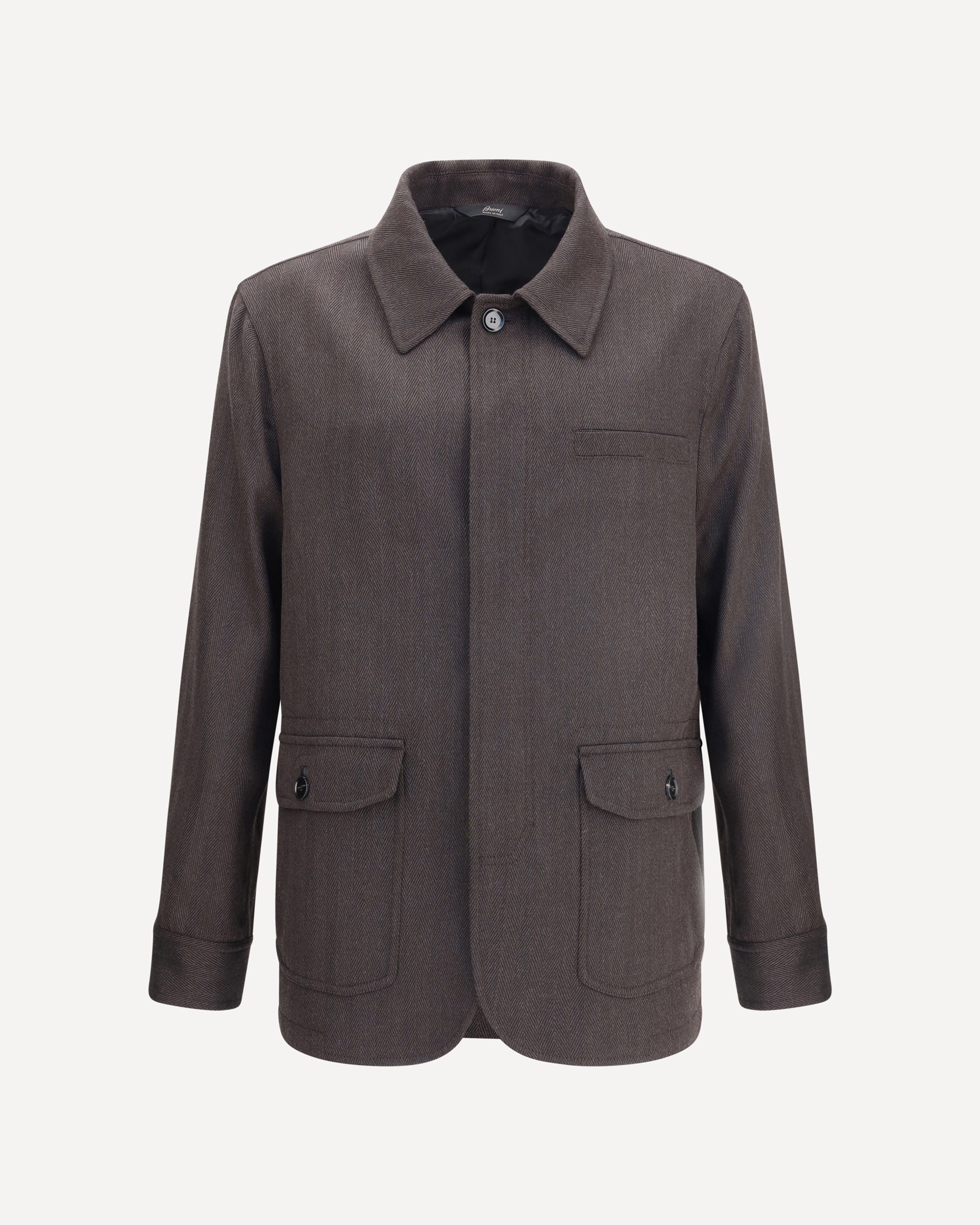 Brioni's Herringbone fabric Jacket is a refined garment that combines elegance and tradition. Featuring a classic collar and front closure with concealed buttons, it has two patch flap pockets on the front and a welt breast pocket for a sophisticated and impeccable look.
