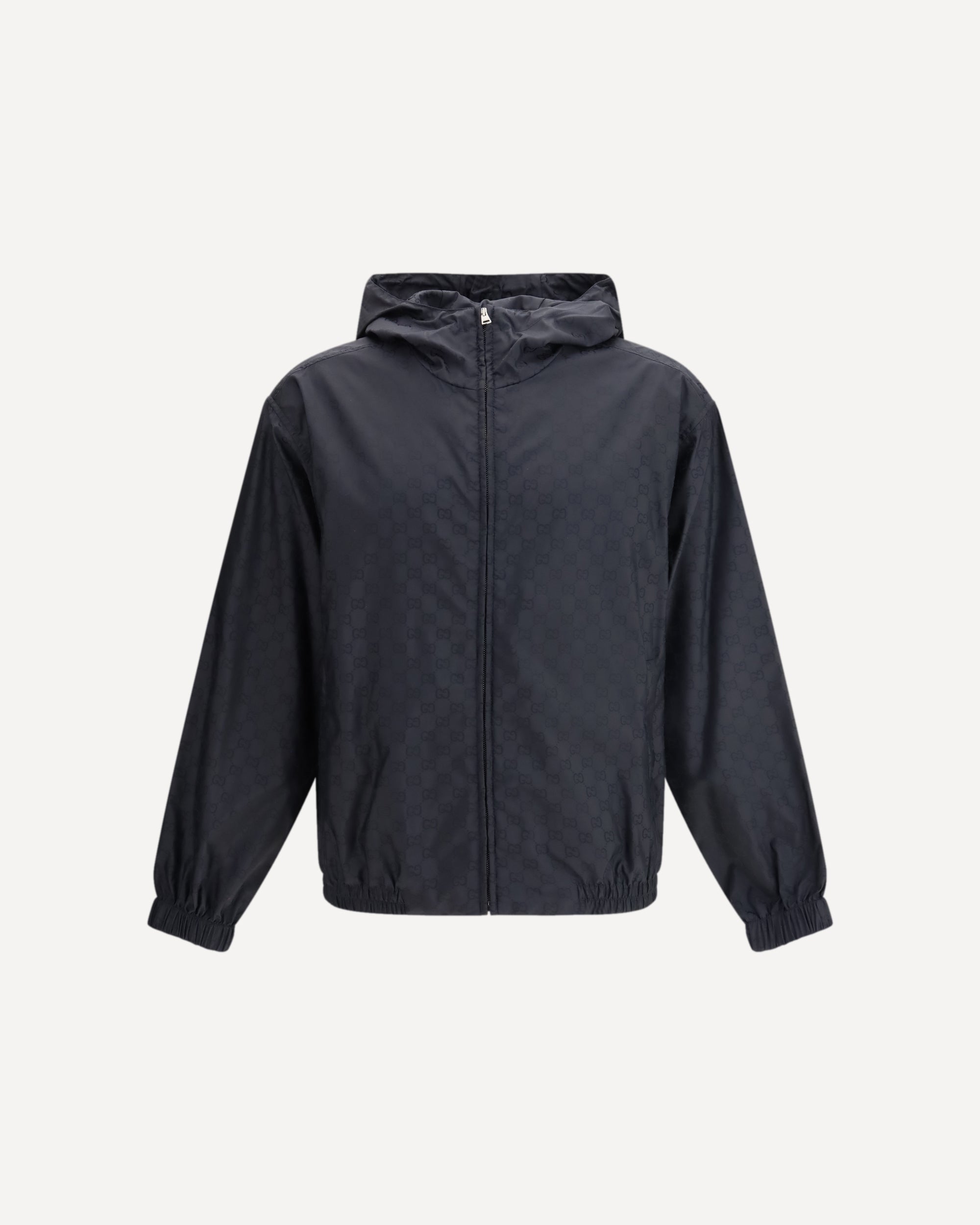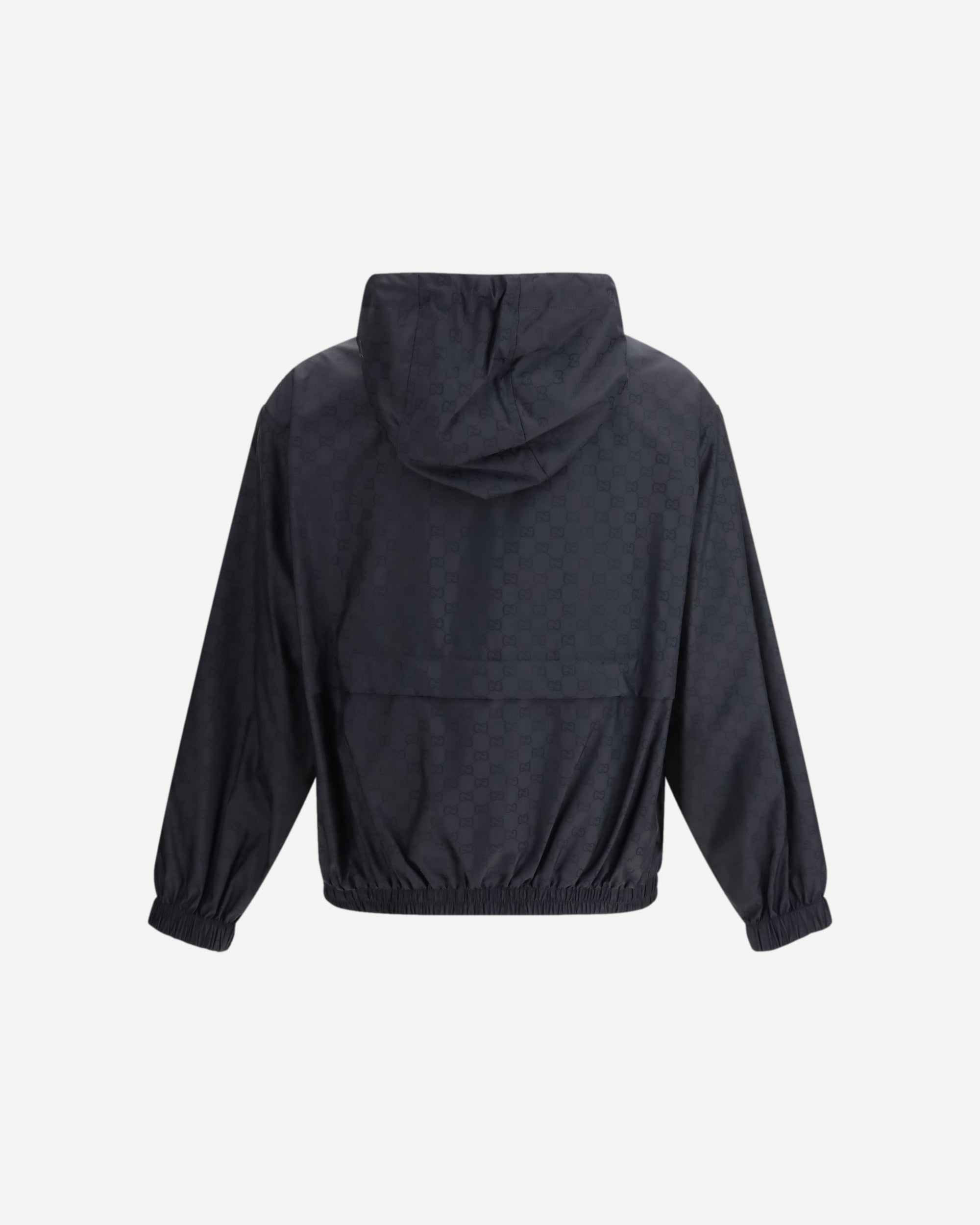 This GG jacquard nylon zip Jacket by Gucci captures the refined mood of the Pre-Fall 2025. Crafted from GG jacquard nylon, the jacket features a packable design that blends practicality with a sleek, contemporary attitude. The relaxed silhouette with dropped shoulders is enhanced by a fixed hood with internal drawstring, two side pockets, and a front zip fastening. Elasticated cuffs and hem add comfort and structure, resulting in a lightweight, versatile piece that seamlessly merges function with Gucci’s unmistakable aesthetic.
