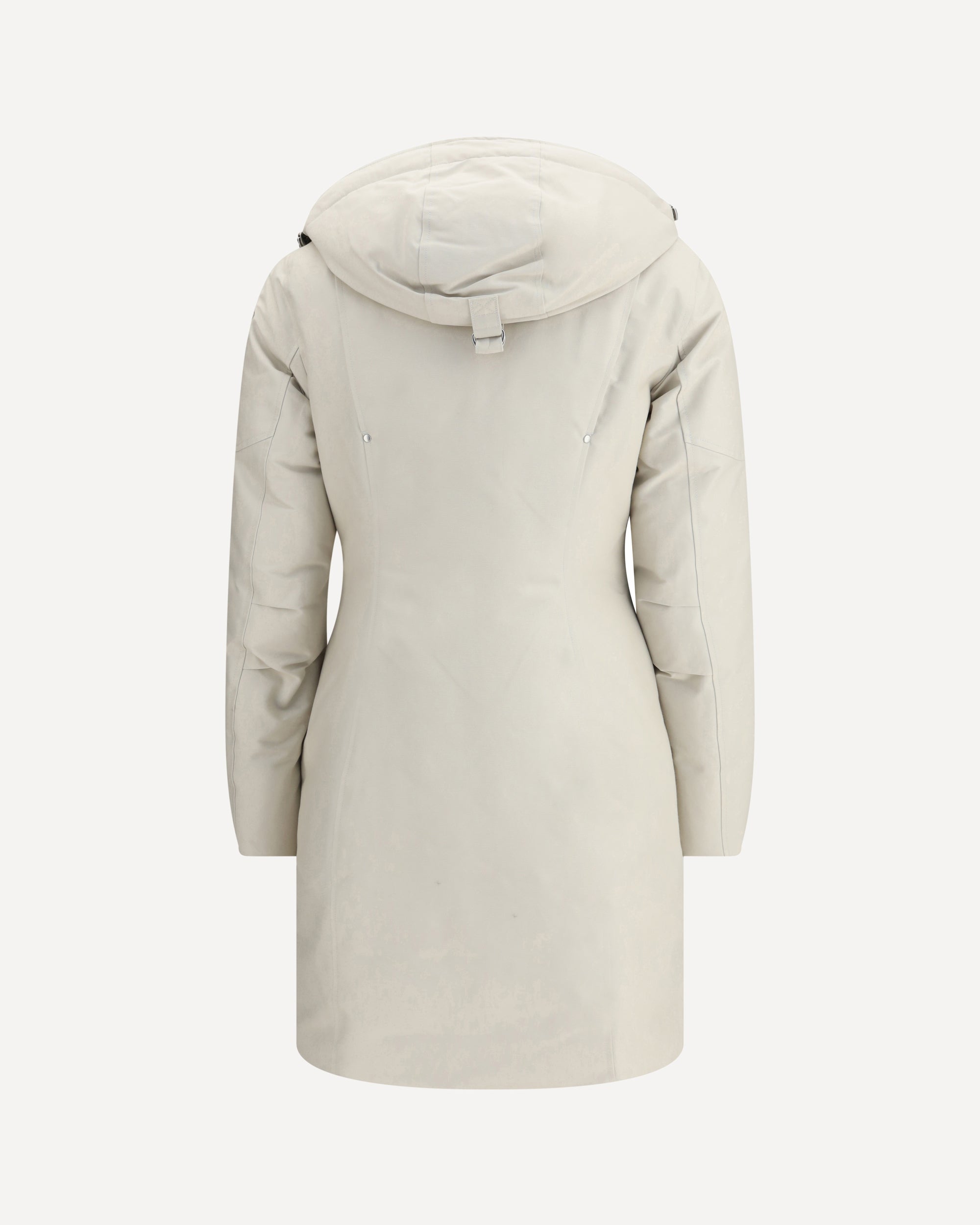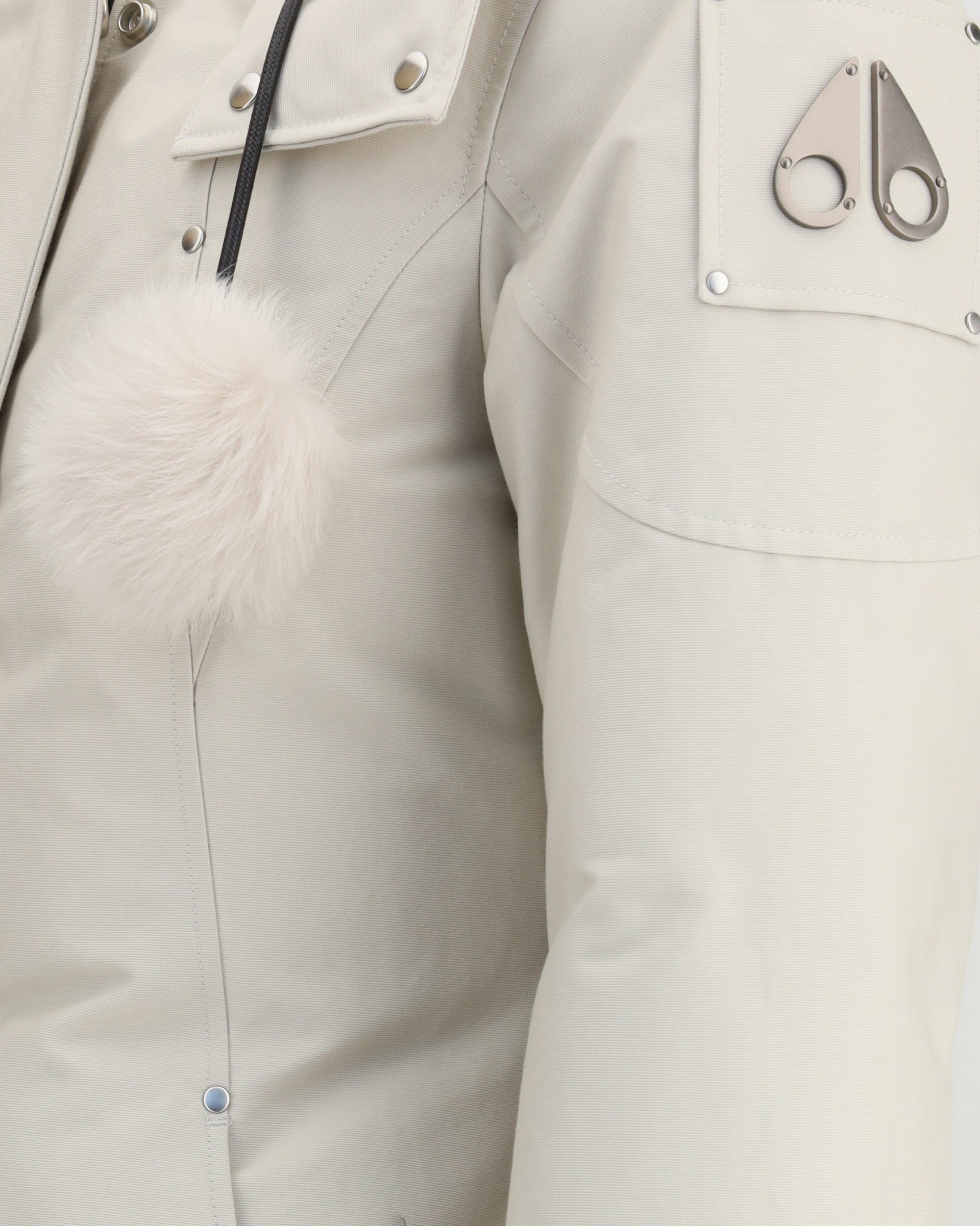 The Original Stirling Parka by Moose Knuckles is an icon of winter outerwear, designed to combine functionality with distinctive character. Featuring a removable hood with detachable shearling trim and pom poms, it includes a down-filled collar for optimal warmth. The two-way zipper is complemented by a snap-button placket, while two slit pockets ensure everyday practicality. The look is finished with the metal logo, a signature mark of the brand.
