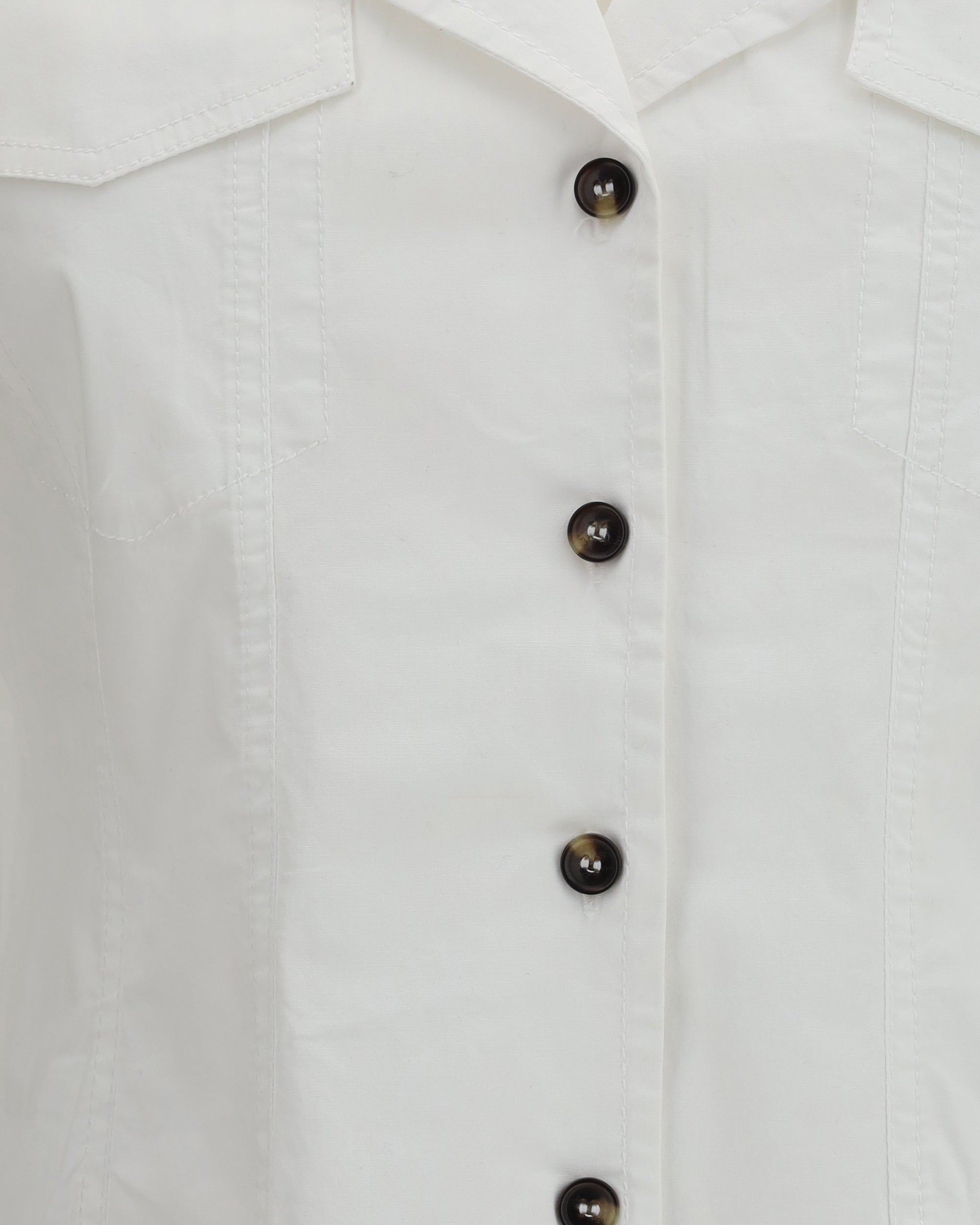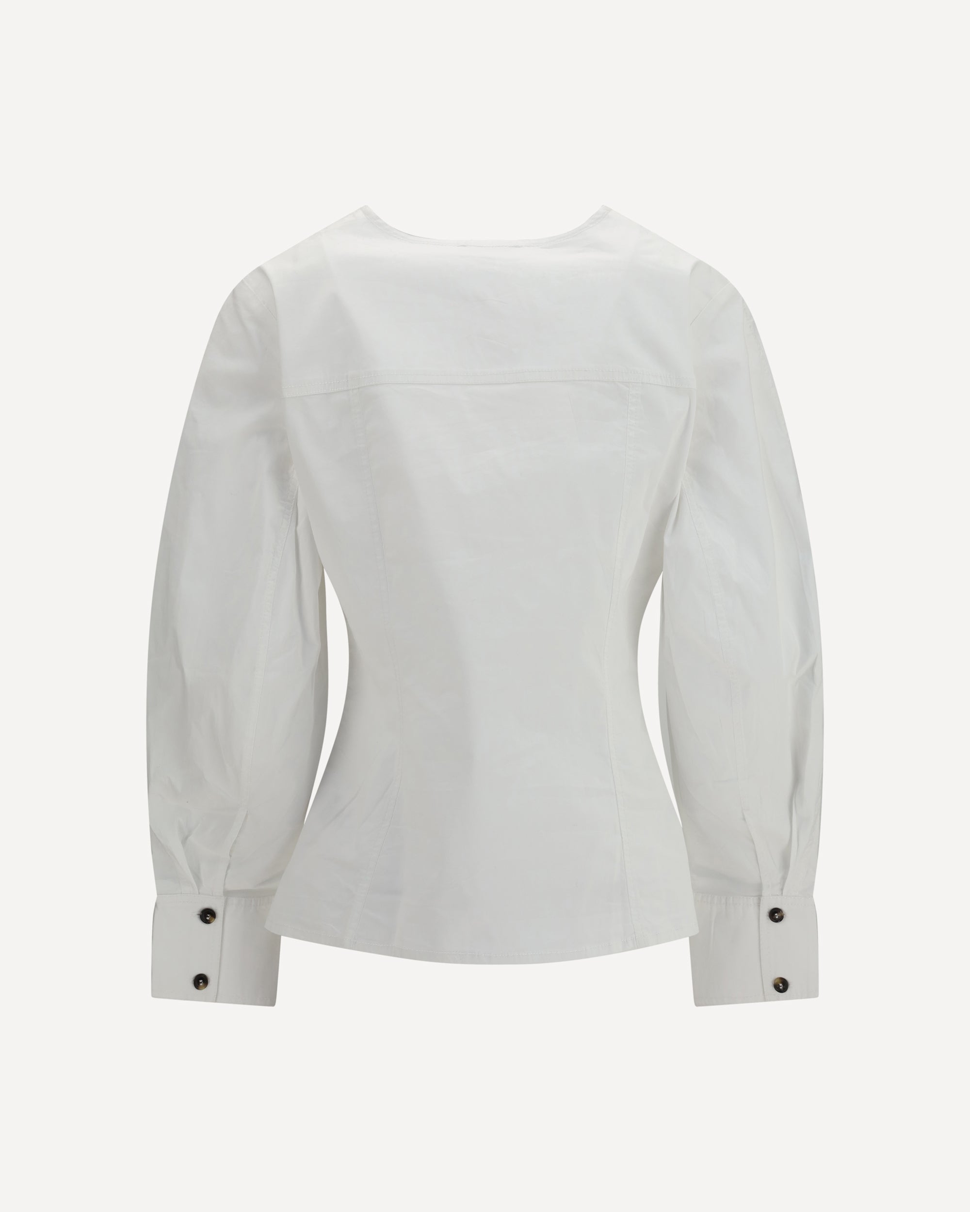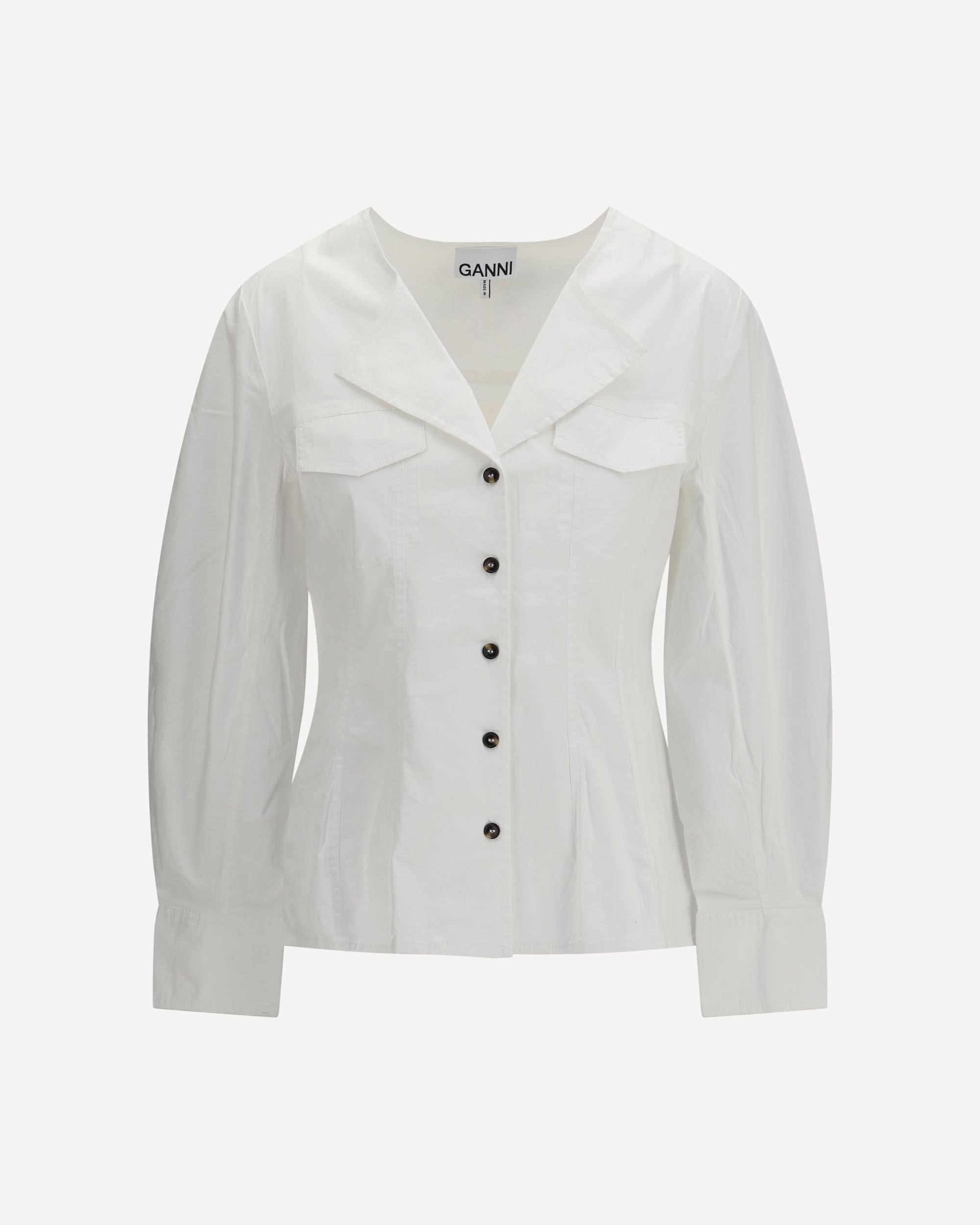 The long-sleeve cotton Shirt by Ganni embodies a contemporary style with relaxed lines and functional details. Crafted from cotton, it features a V-neck with lapels and a front button fastening, while the design without closure up to the collar adds a modern, laid-back touch. The wide sleeves taper at the cuffs, creating a contrast between volume and structure. The two faux chest pockets and patch pockets complete the piece with an essential aesthetic detail, making it ideal for a casual yet refined look.