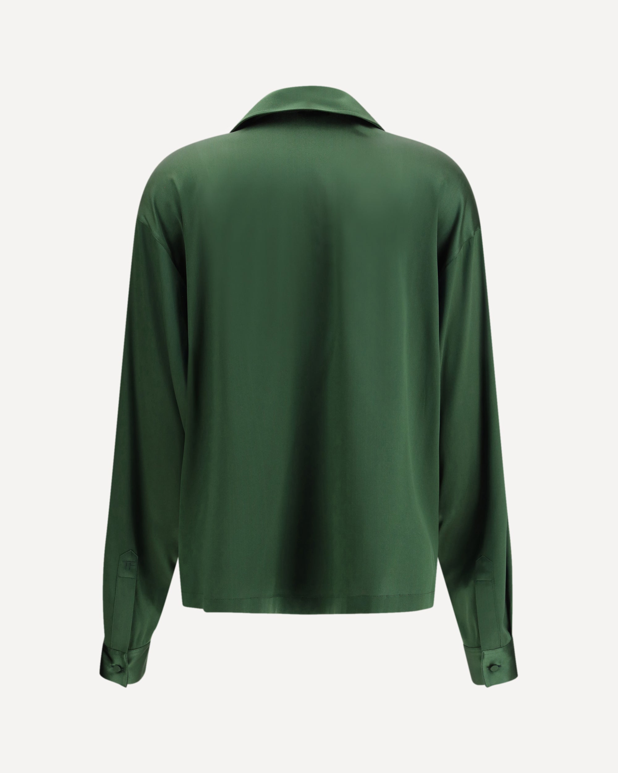 The Stretch Silk Shirt by Tom Ford features an open design with a tonal embroidered TF logo. Crafted from stretch silk satin, the piece offers a regular fit that highlights the fabric’s fluidity. The long sleeves are finished with self-covered buttons at the cuffs, adding a refined, signature touch to the garment’s sophisticated construction.