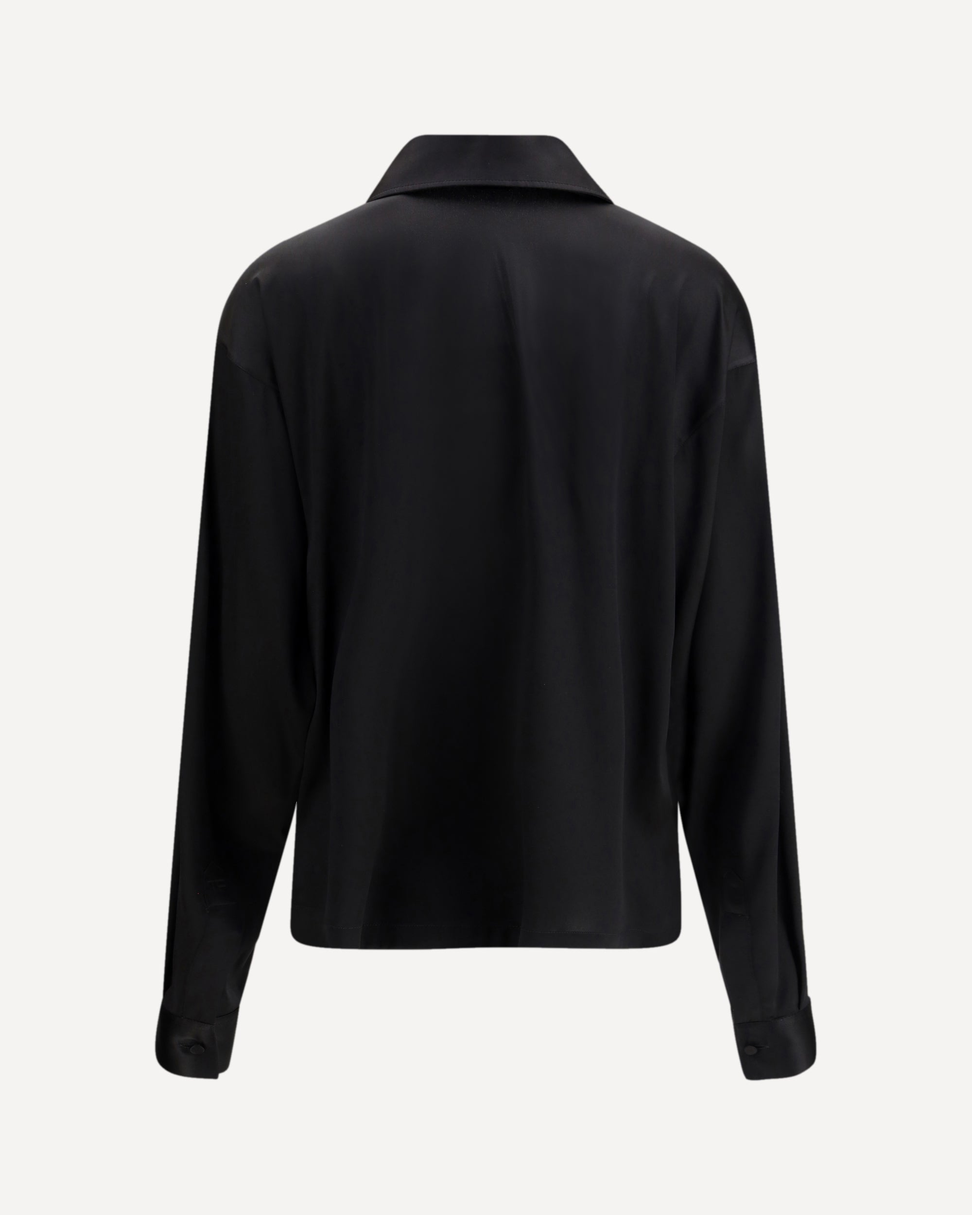 The Stretch Silk Shirt by Tom Ford features an open design with a tonal embroidered TF logo. Crafted from stretch silk satin, the piece offers a regular fit that highlights the fabric’s fluidity. The long sleeves are finished with self-covered buttons at the cuffs, adding a refined, signature touch to the garment’s sophisticated construction.
