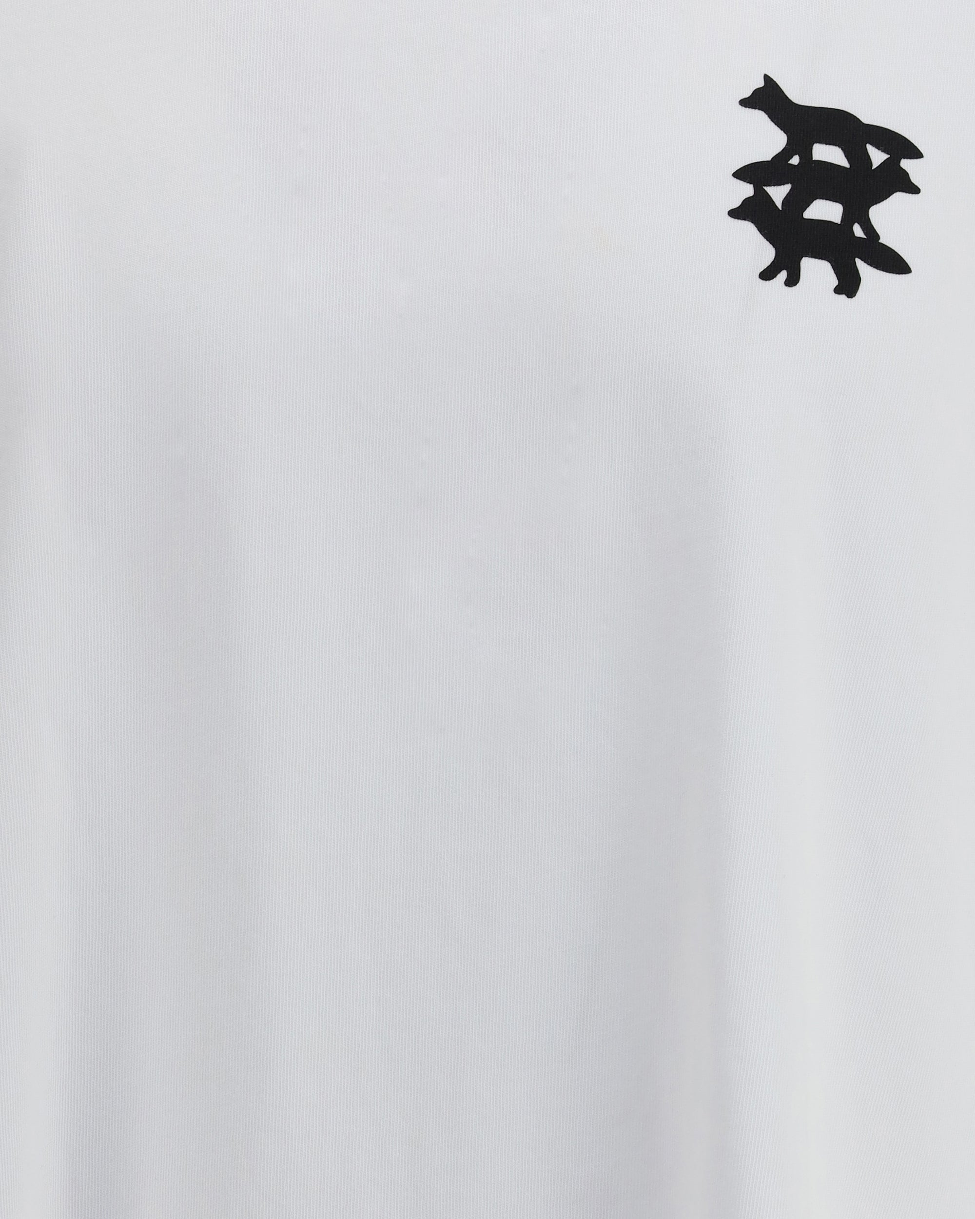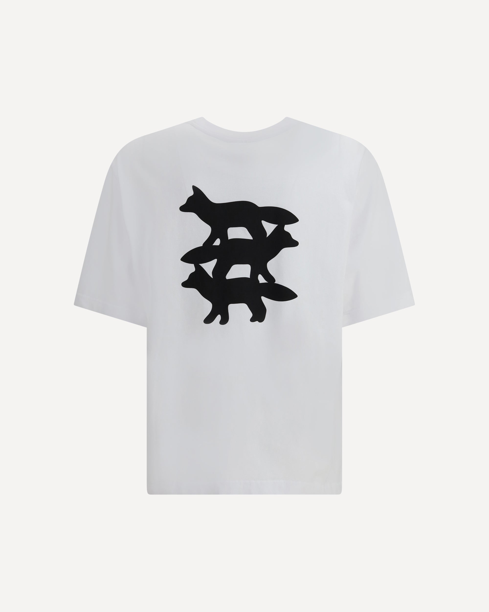 The Stunt Fox Oversize T-shirt by Maison Kitsuné brings creativity and wit into a standout wardrobe staple. Crafted from heavier organic cotton jersey (240g), it offers an oversized fit and enveloping comfort. The front and back feature the whimsical “Stunt Fox” print by Kajsa Ståhl, depicting three foxes stacked in a surreal yet architectural balance. A playful yet artistic piece, it embodies Maison Kitsuné’s ability to merge fashion with imagination.