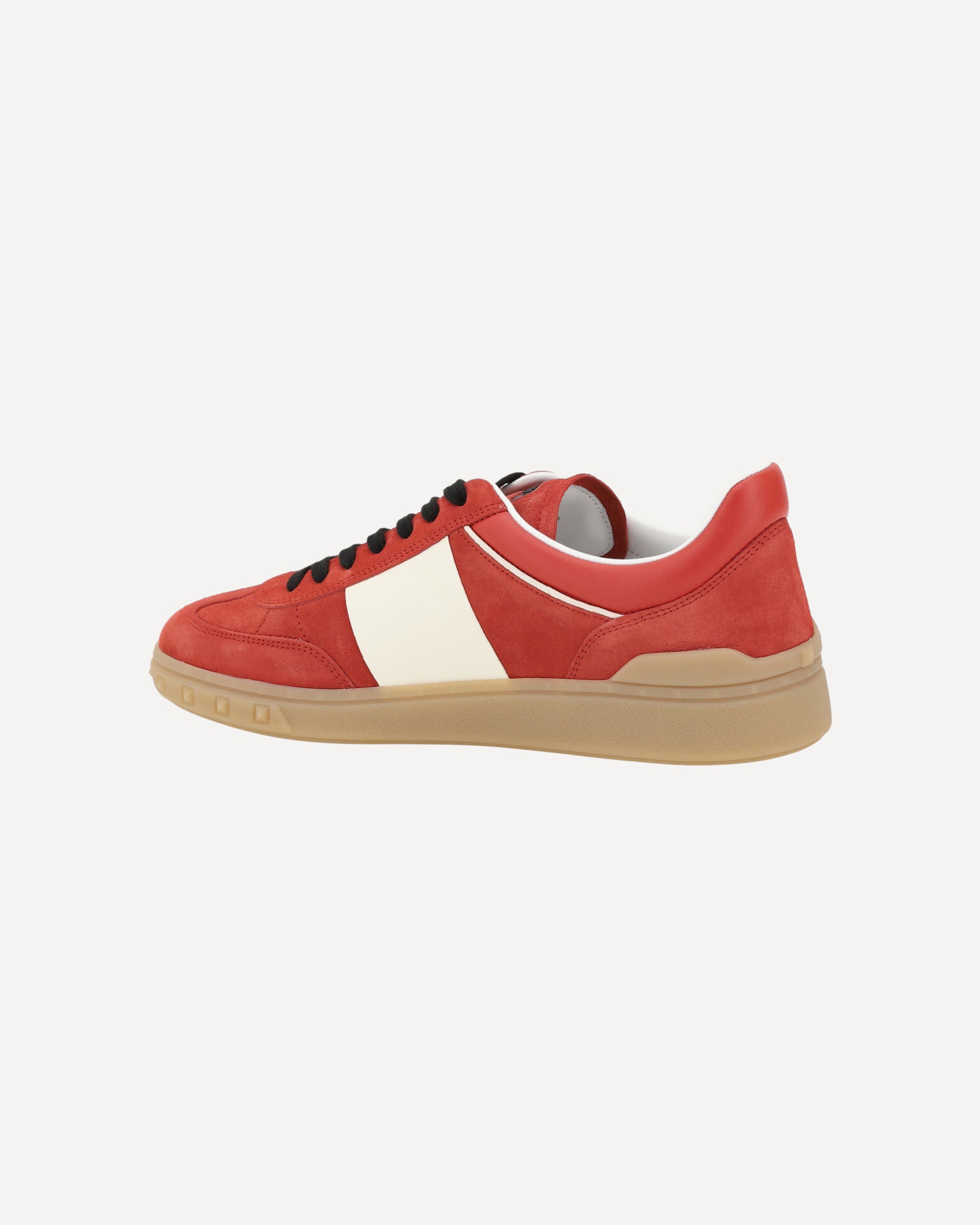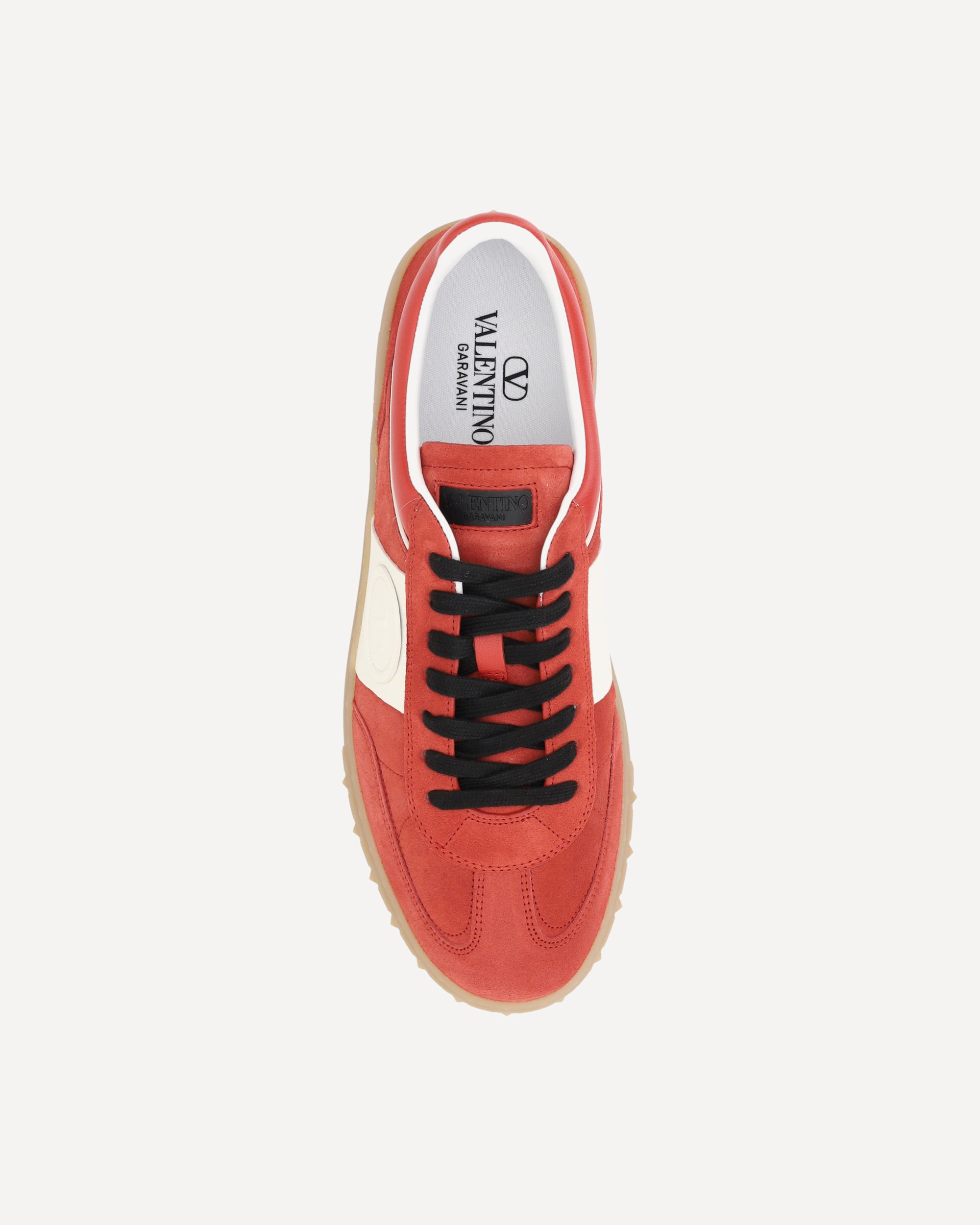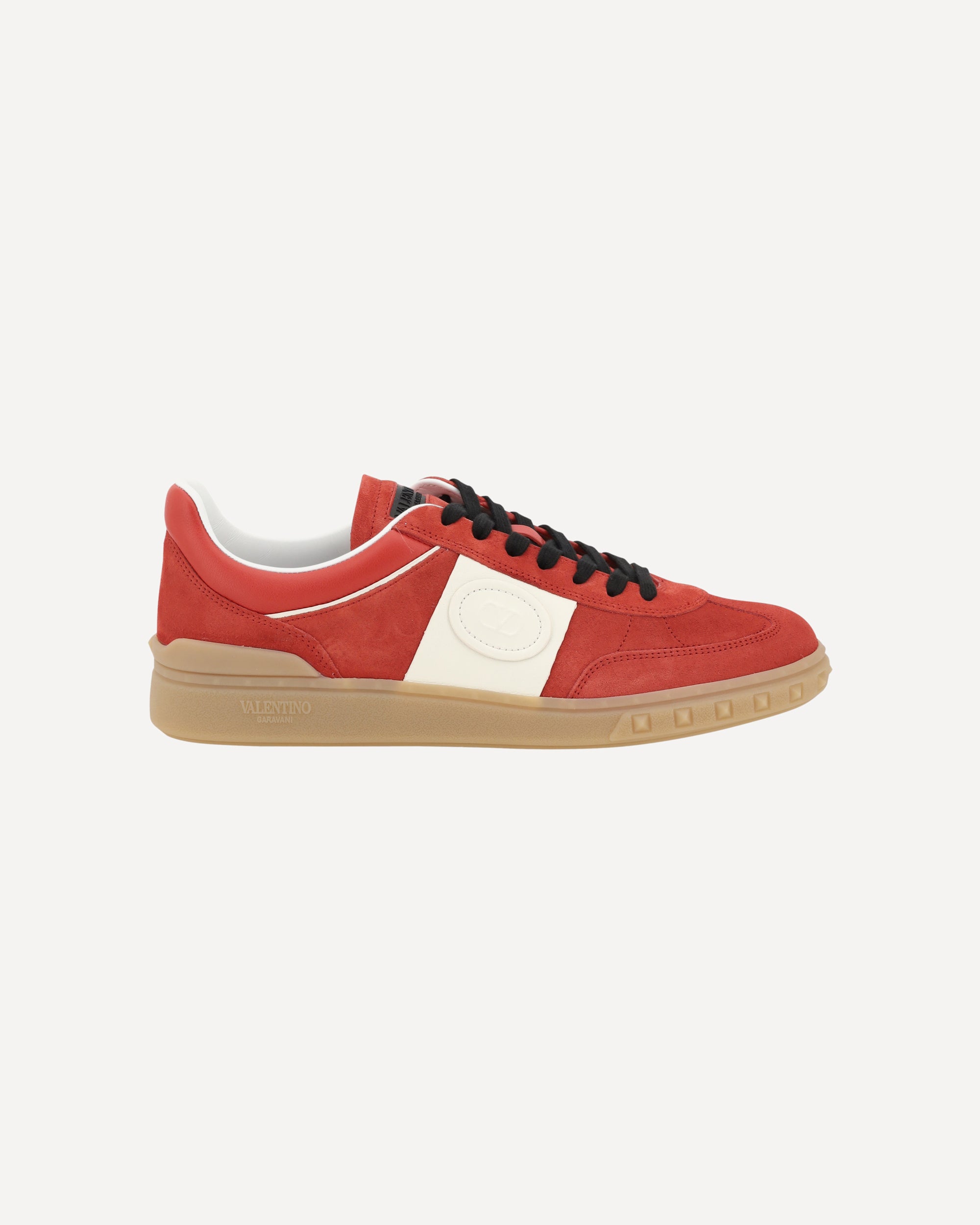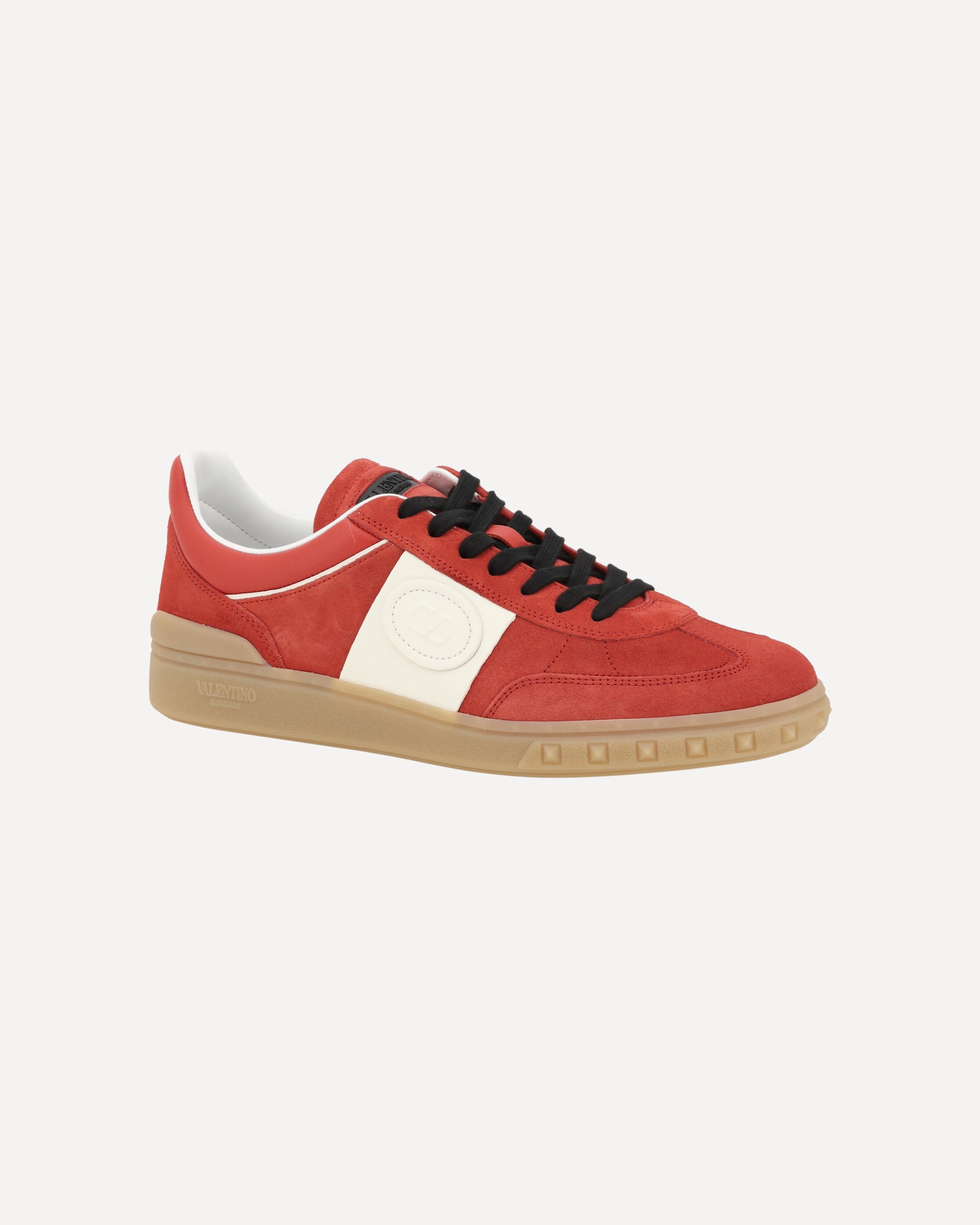 Suede Sneakers by Valentino Garavani feature a round toe and a front lace-up closure. A contrasting slanted band on the outer side panel is embellished with the brand's signature embossed VLogo. The flat rubber sole is decorated with the brand's iconic monogram and embossed Rockstud studs, an additional detail that lends a bold and sophisticated touch to the design. A pair of sneakers with a unique and refined look, ideal for a modern and trendy outfit.