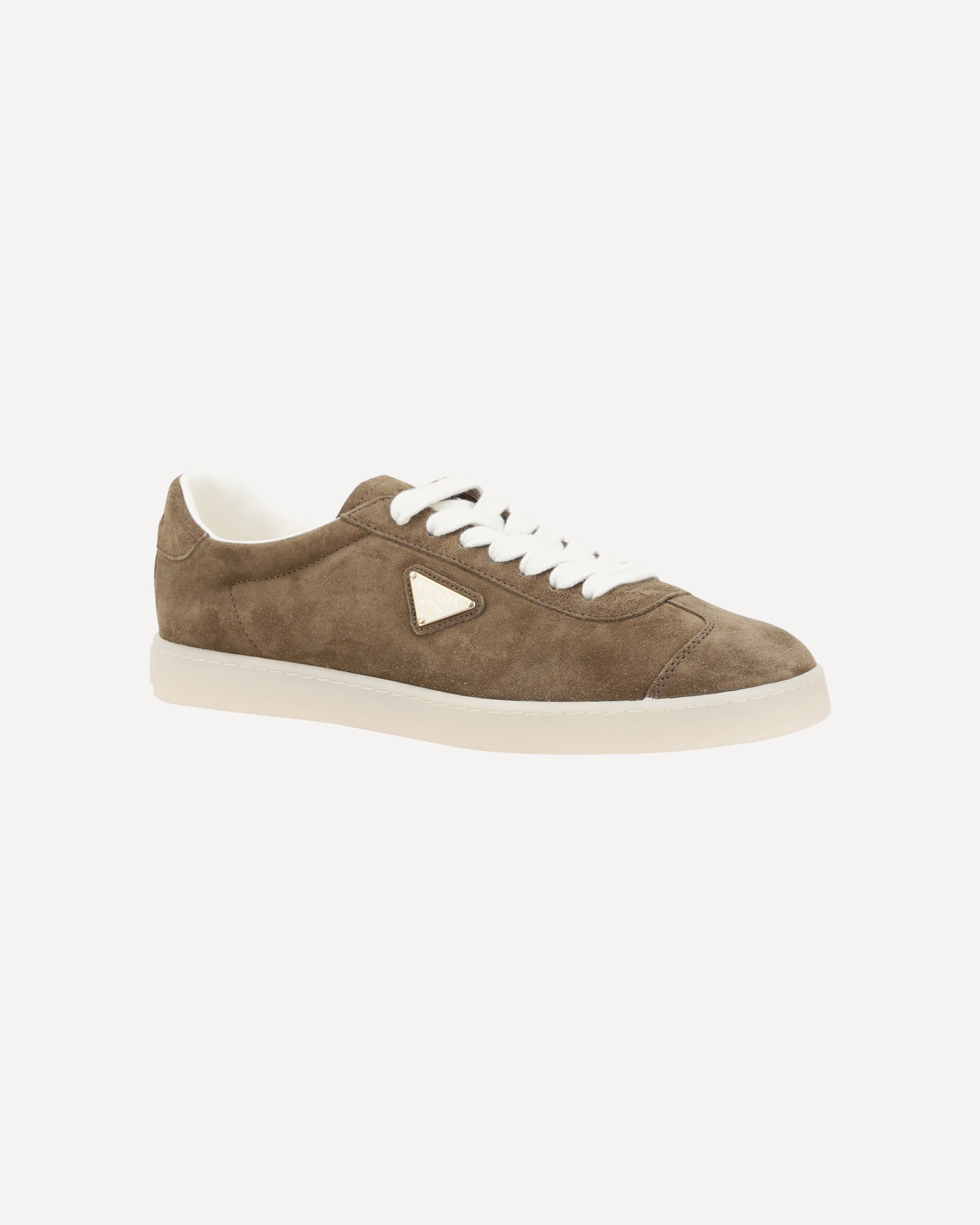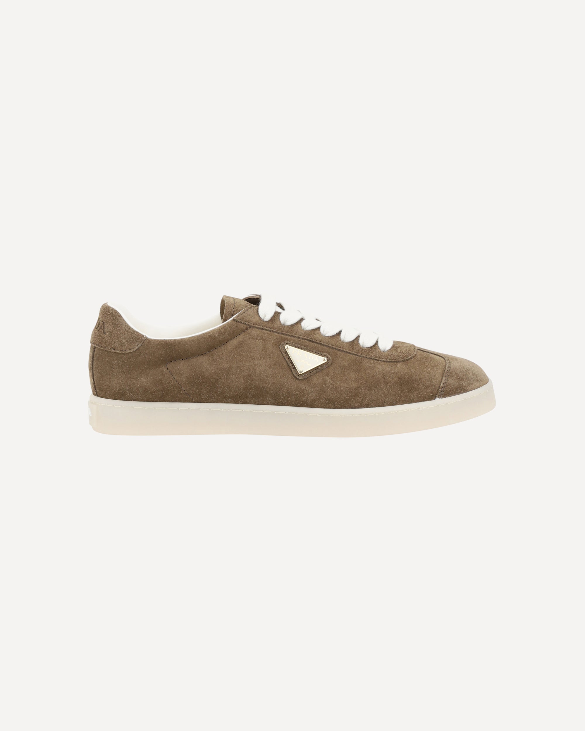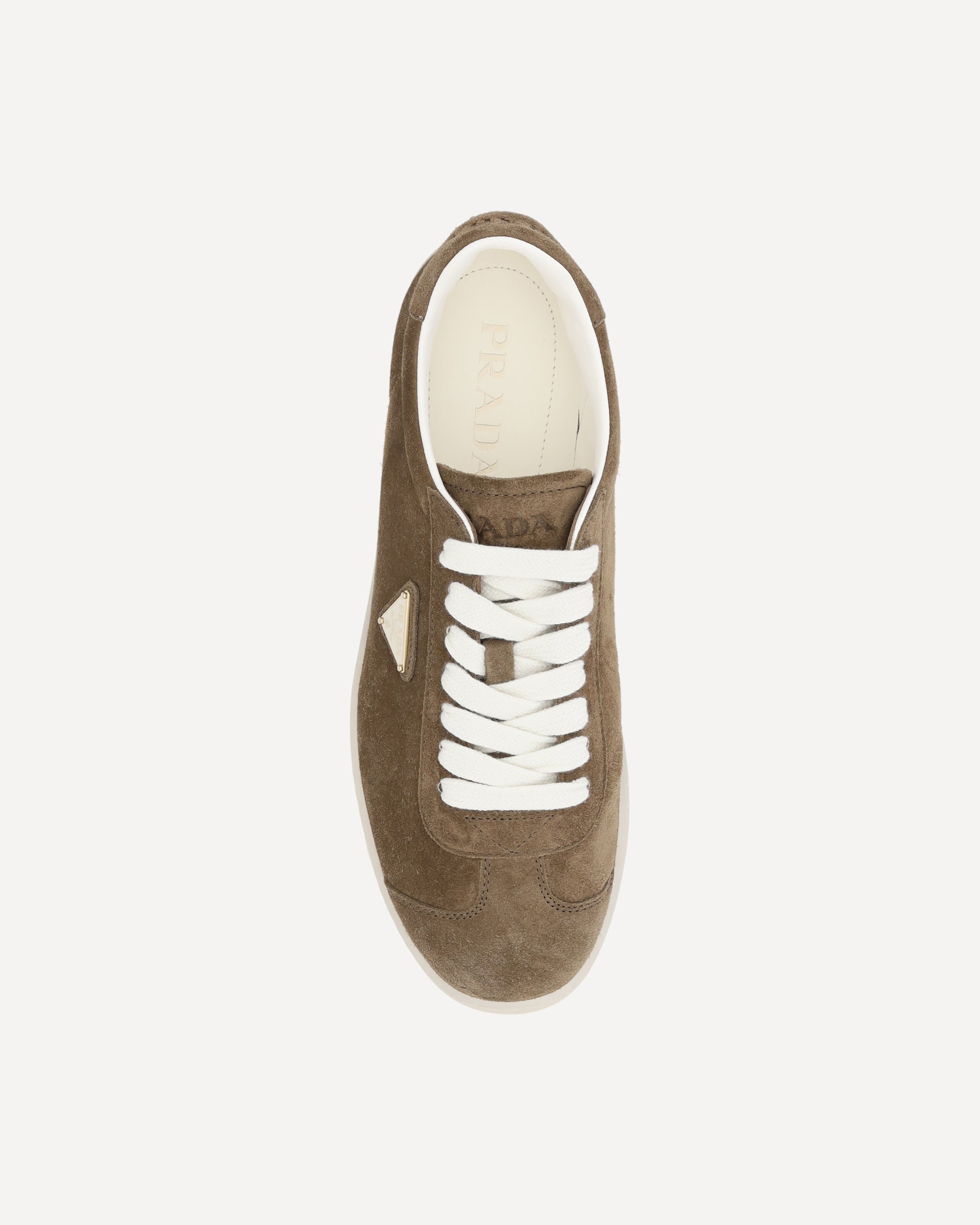 Prada's suede Sneakers are a perfect balance of elegance and comfort. The round toe ensures a comfortable fit, while the lace-up closure on the front offers an adjustable, secure fit. The logoed heel and iconic triangular logo plaque applied to the outer side panel recall the brand's distinctive identity, adding a touch of understated luxury. The flat sole and logoed insole complete the design, making these sneakers perfect for a casual yet sophisticated look.