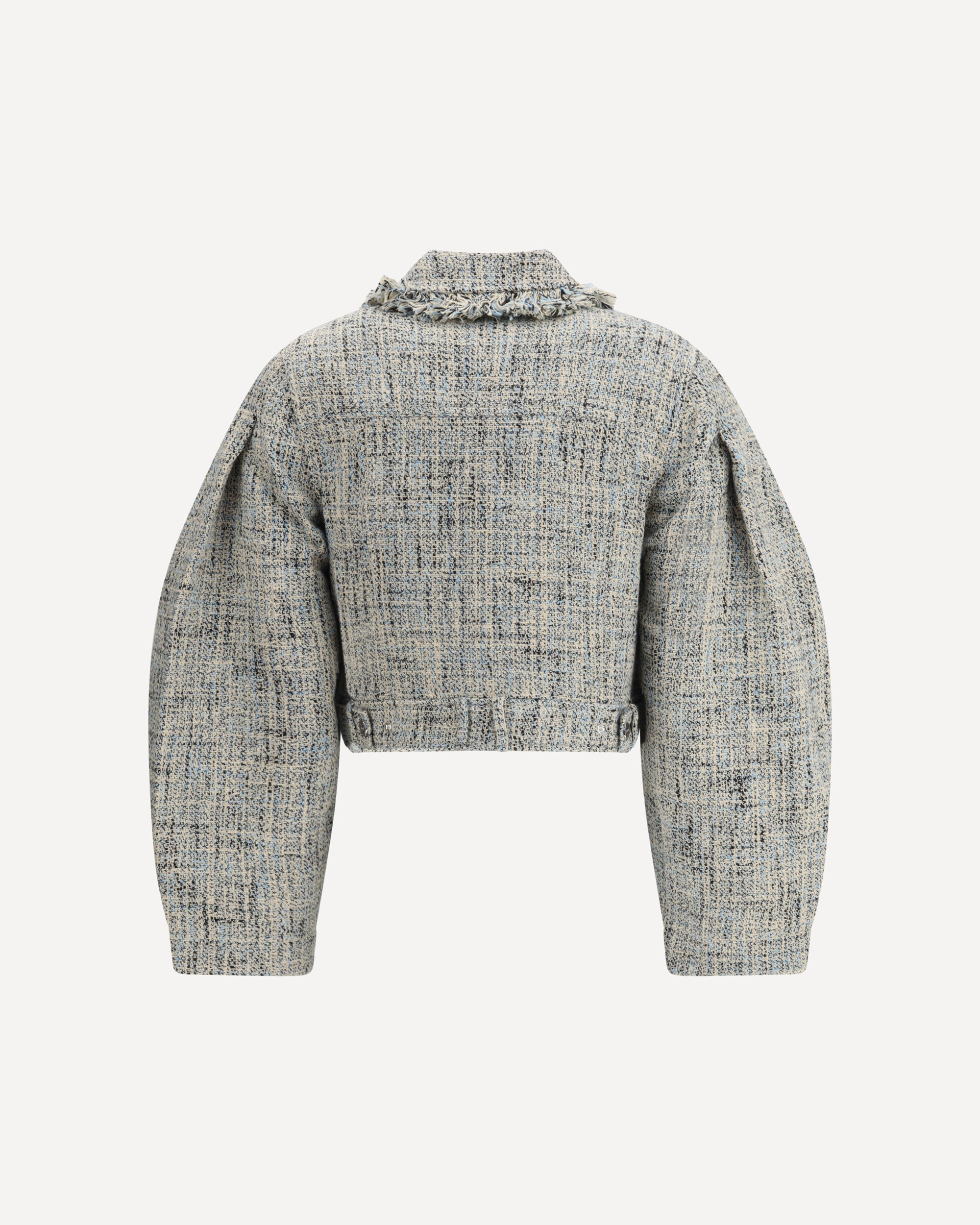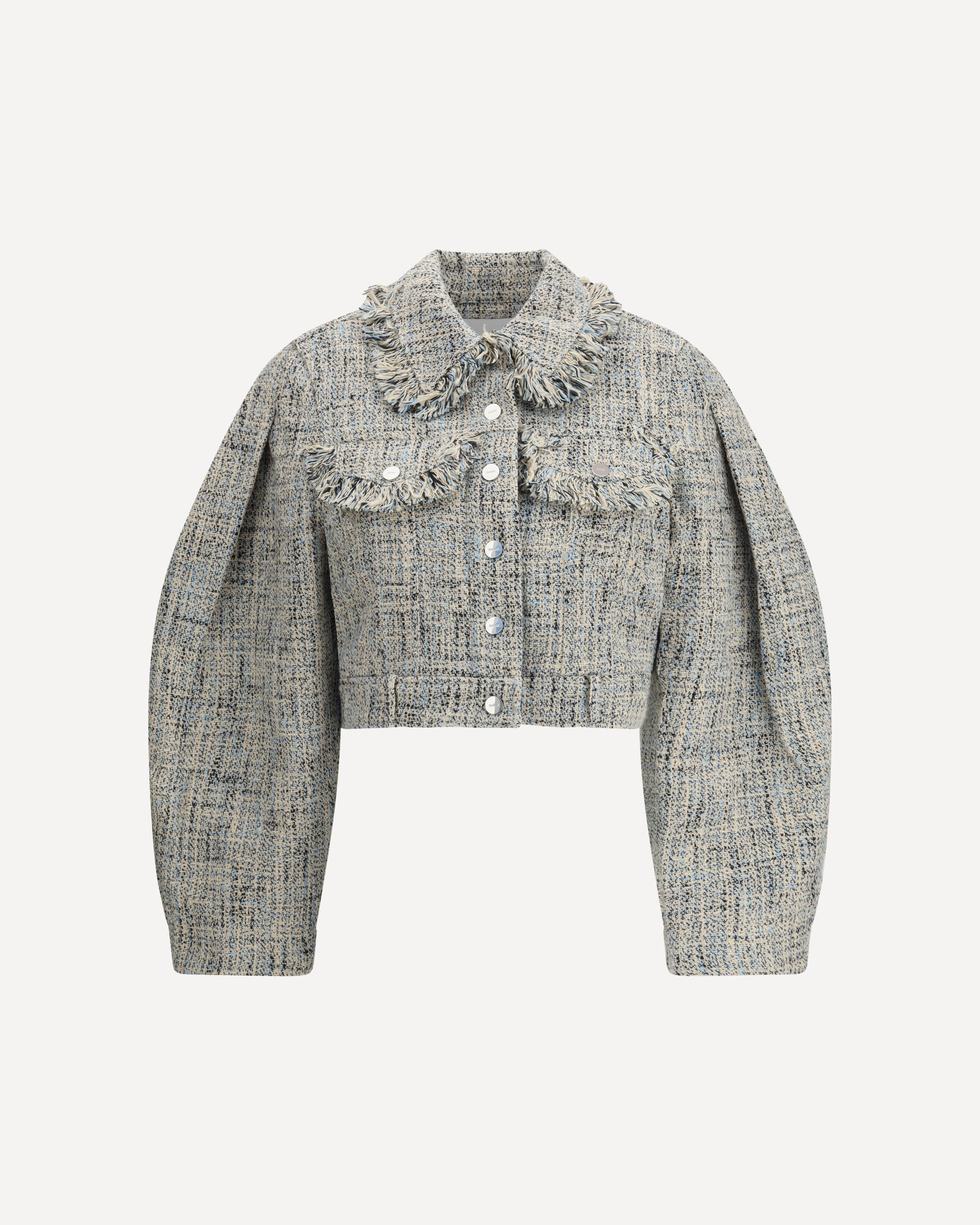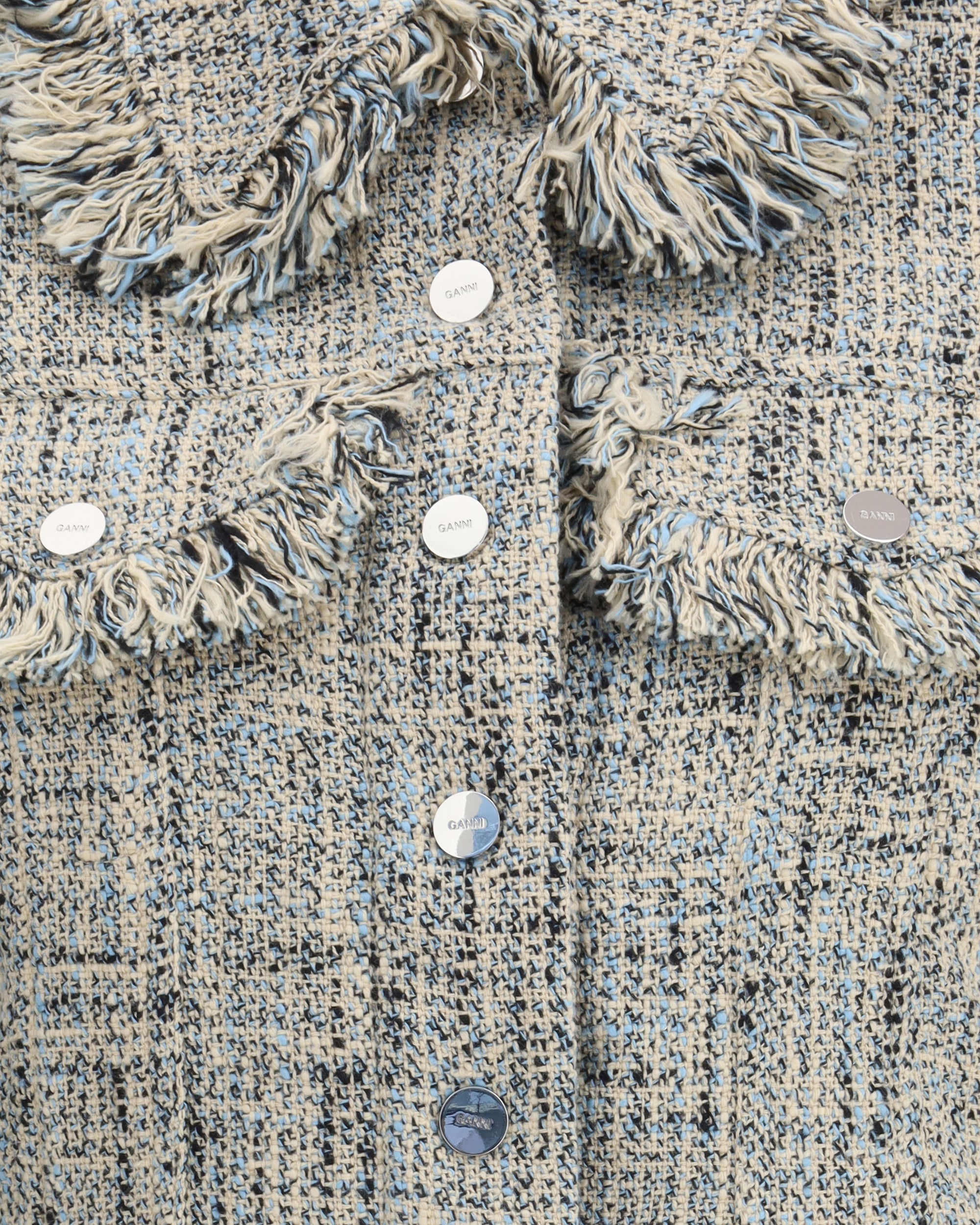 GANNI's signature cotton Summer Jacket with a cropped cut and contemporary character. The model features a classic collar enriched with bangs applied along the perimeter, which give an original and dynamic touch. The front closure is with buttons, while the garment is completed with two side welt pockets and two slit pockets with flap applied on the front. Perfect for enriching casual looks with a distinctive detail.