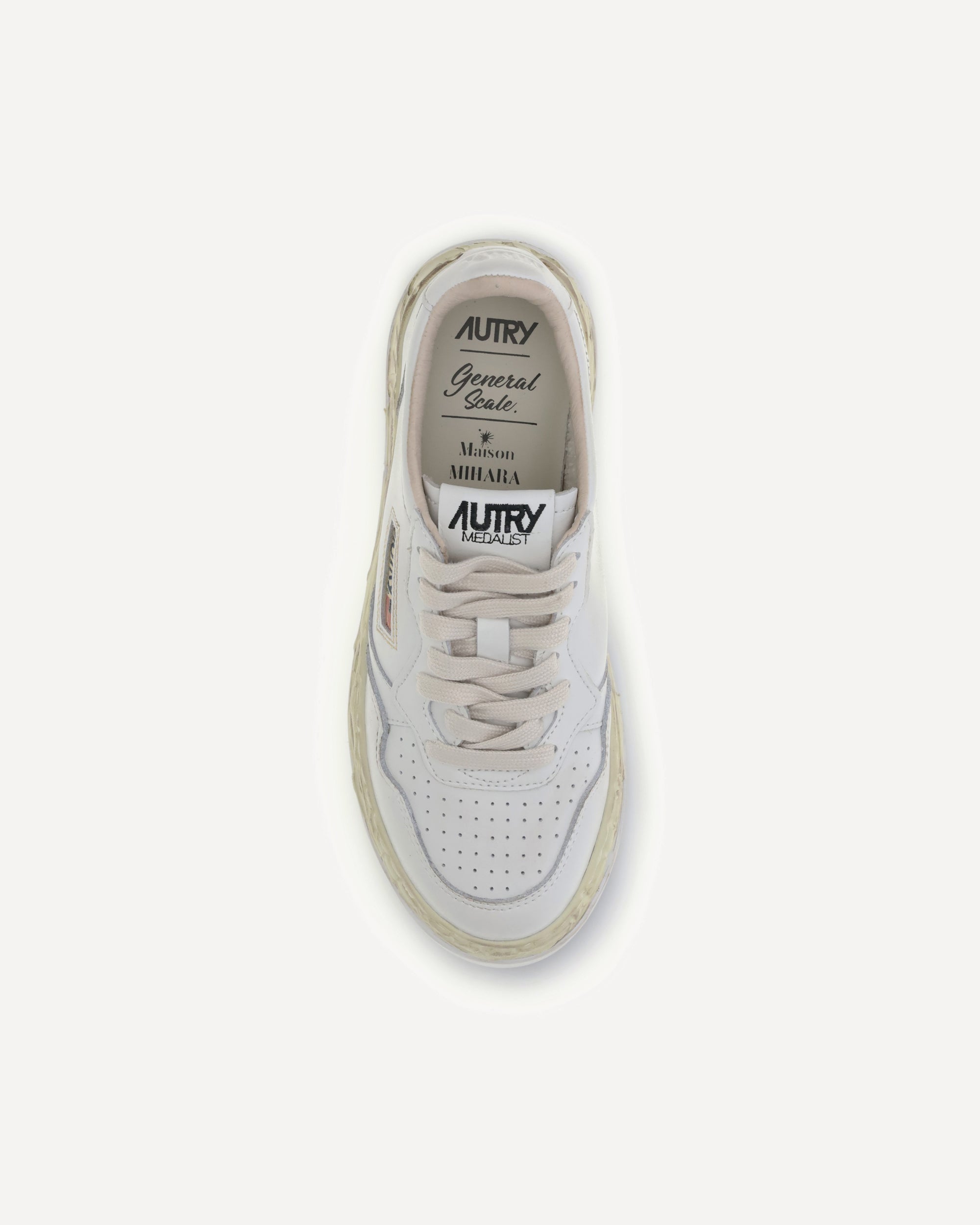 Autry Medalist x Mihara is an exclusive capsule collection that combines Autry’s rich heritage with the avant-garde vision of Maison MIHARA YASUHIRO General Scale. The sneakers, created in collaboration with Maison Mihara Yasuhiro General Scale, are made of white leather and feature a rounded perforated toe, a heel tab with embossed logo, lace-up closure, a vintage-textured midsole, a branded tongue, and a rubber sole.