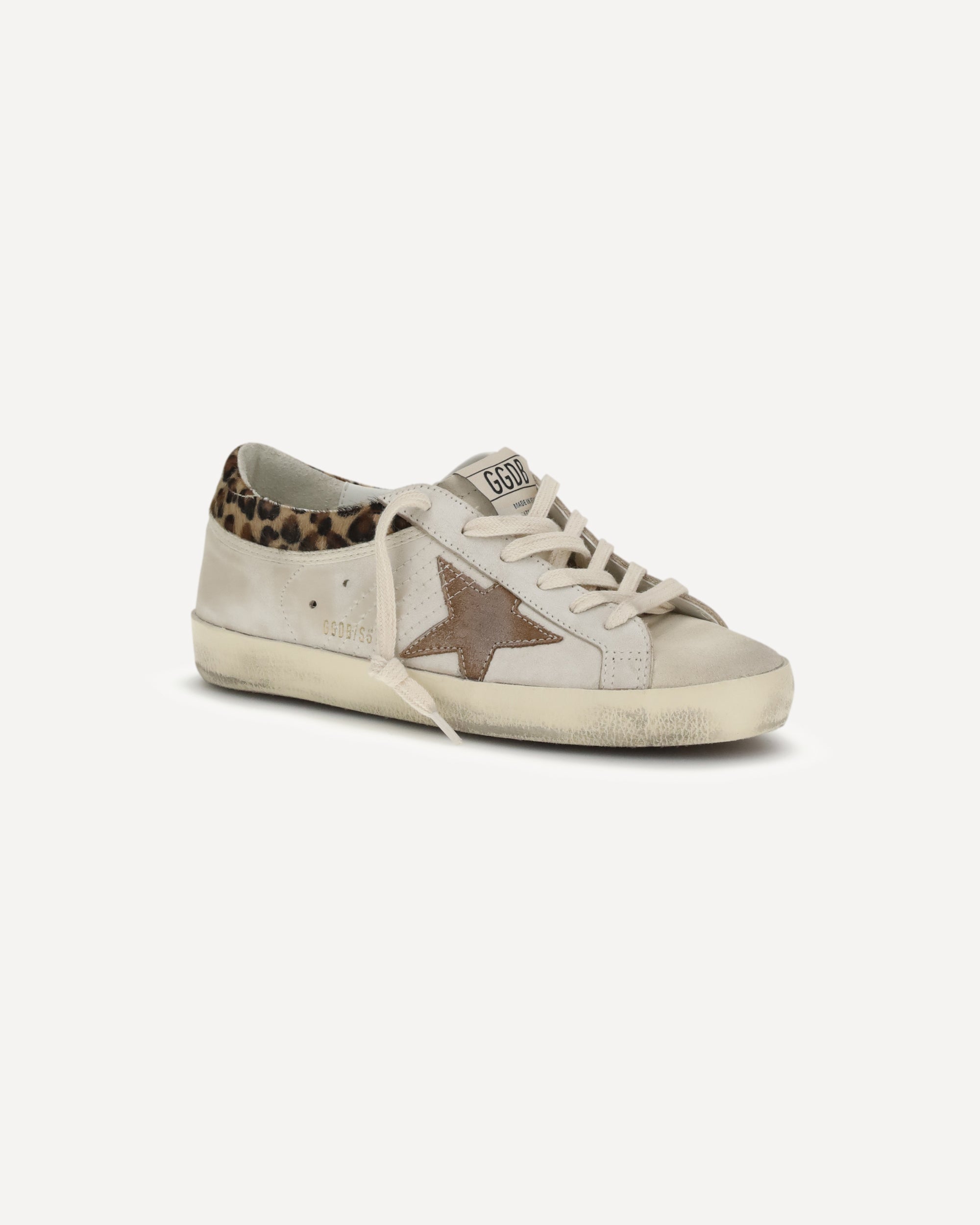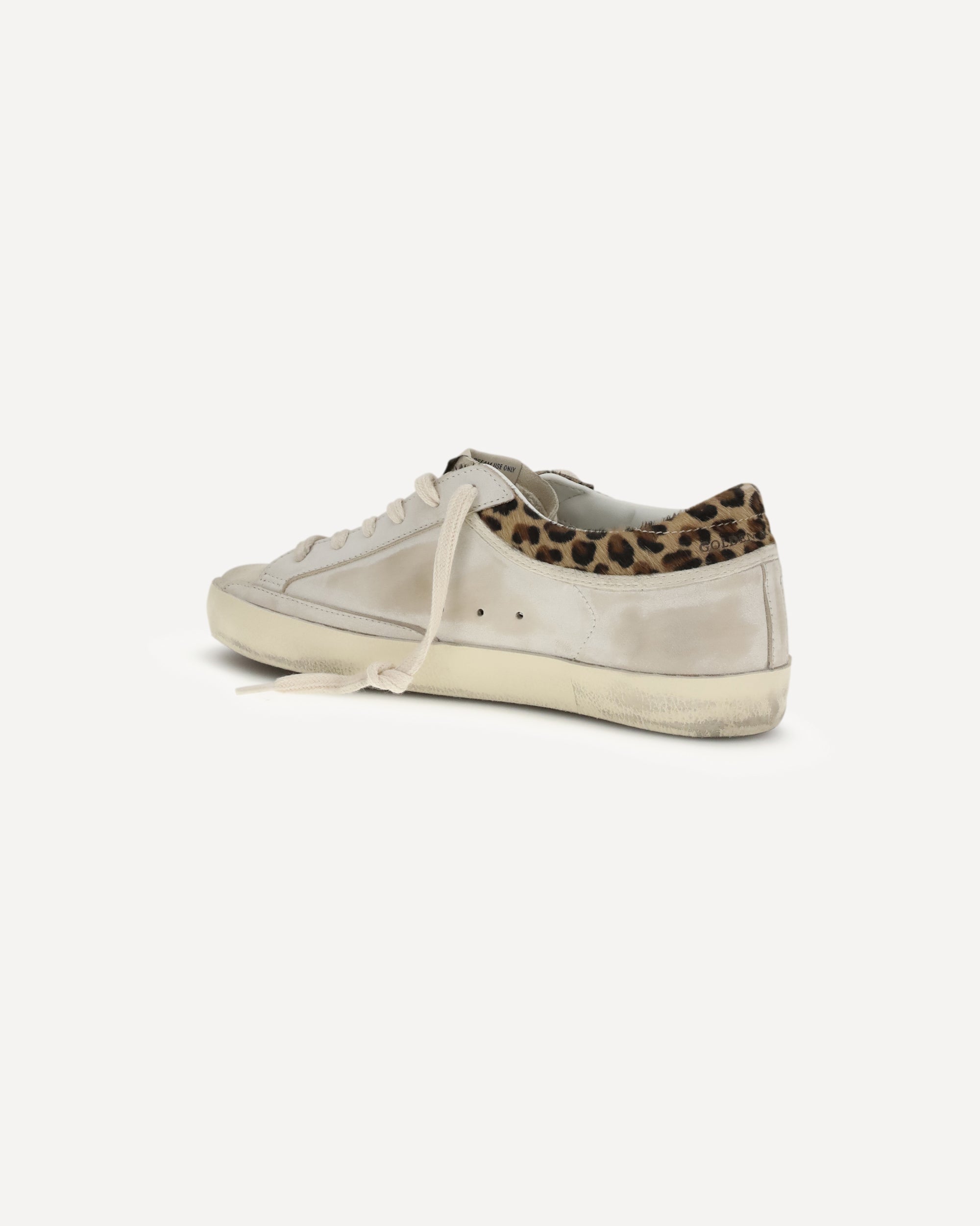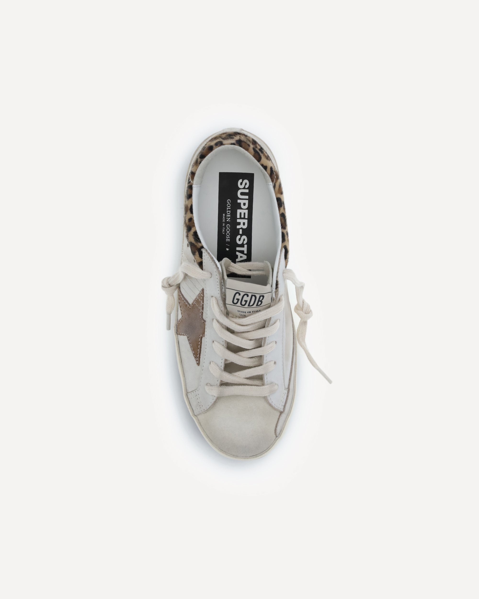 The Super Star Sneakers by Golden Goose feature a distinctive leopard-print pony skin heel in shades of beige and brown. The beige suede back insert and tongue add texture and depth to the design, while the brand's signature vintage treatment completes the look with an authentic, lived-in appeal.