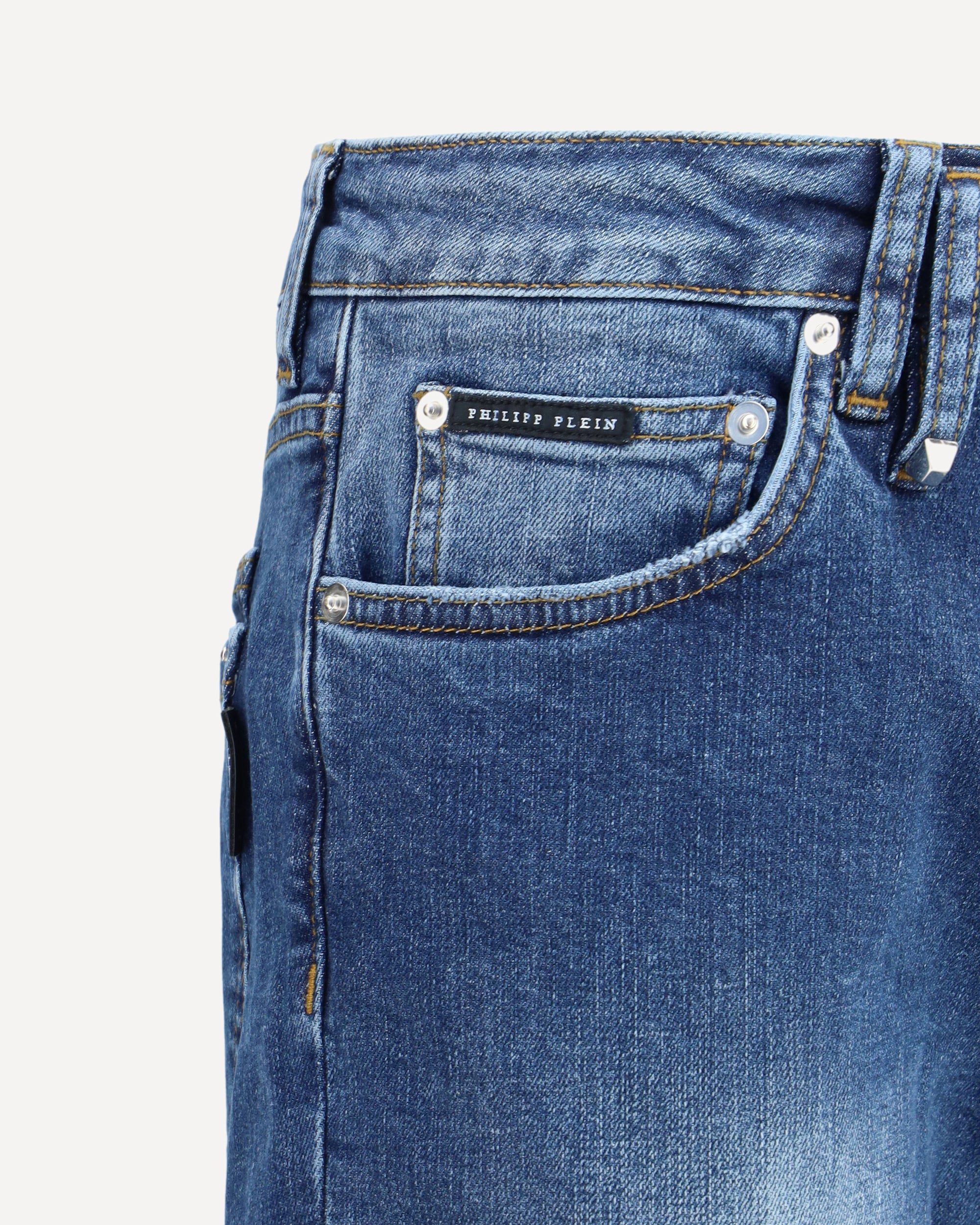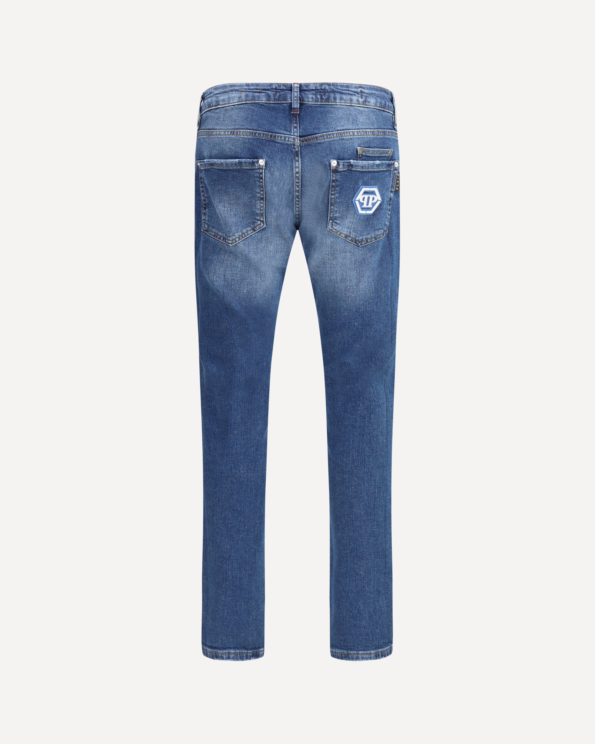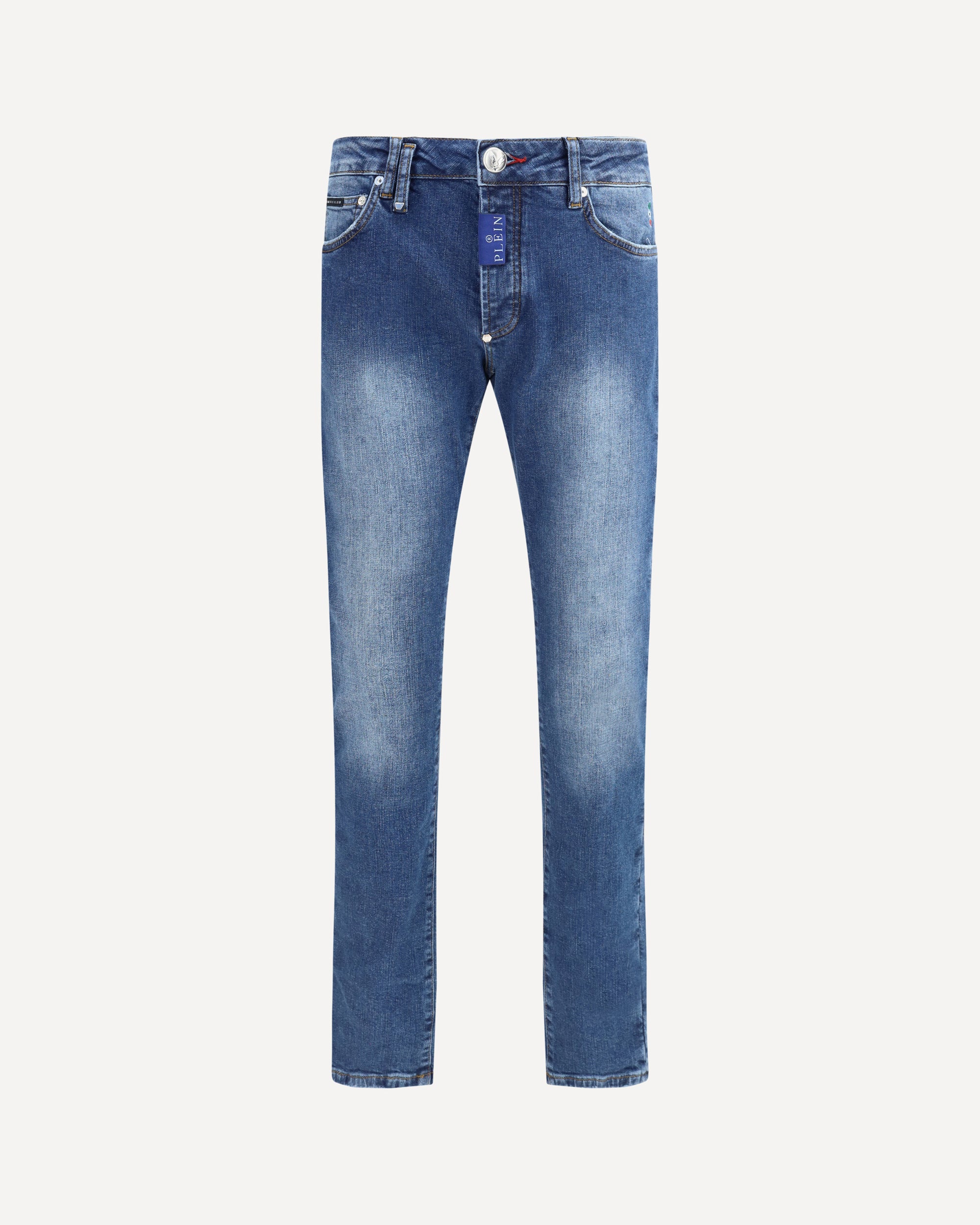 Philipp Plein's cotton Jeans are a bold, modern garment made from high-quality cotton. They feature a straight five-pocket style that offers a straight and comfortable fit, perfect for a casual and versatile look. The front button closure lends a distinctive touch, while belt loops on the waistband allow you to customize the fit. On the back, the iconic logo patch stands out, while on the front we find an iconic monogram patch, adding a detail of luxury and recognition to the design.