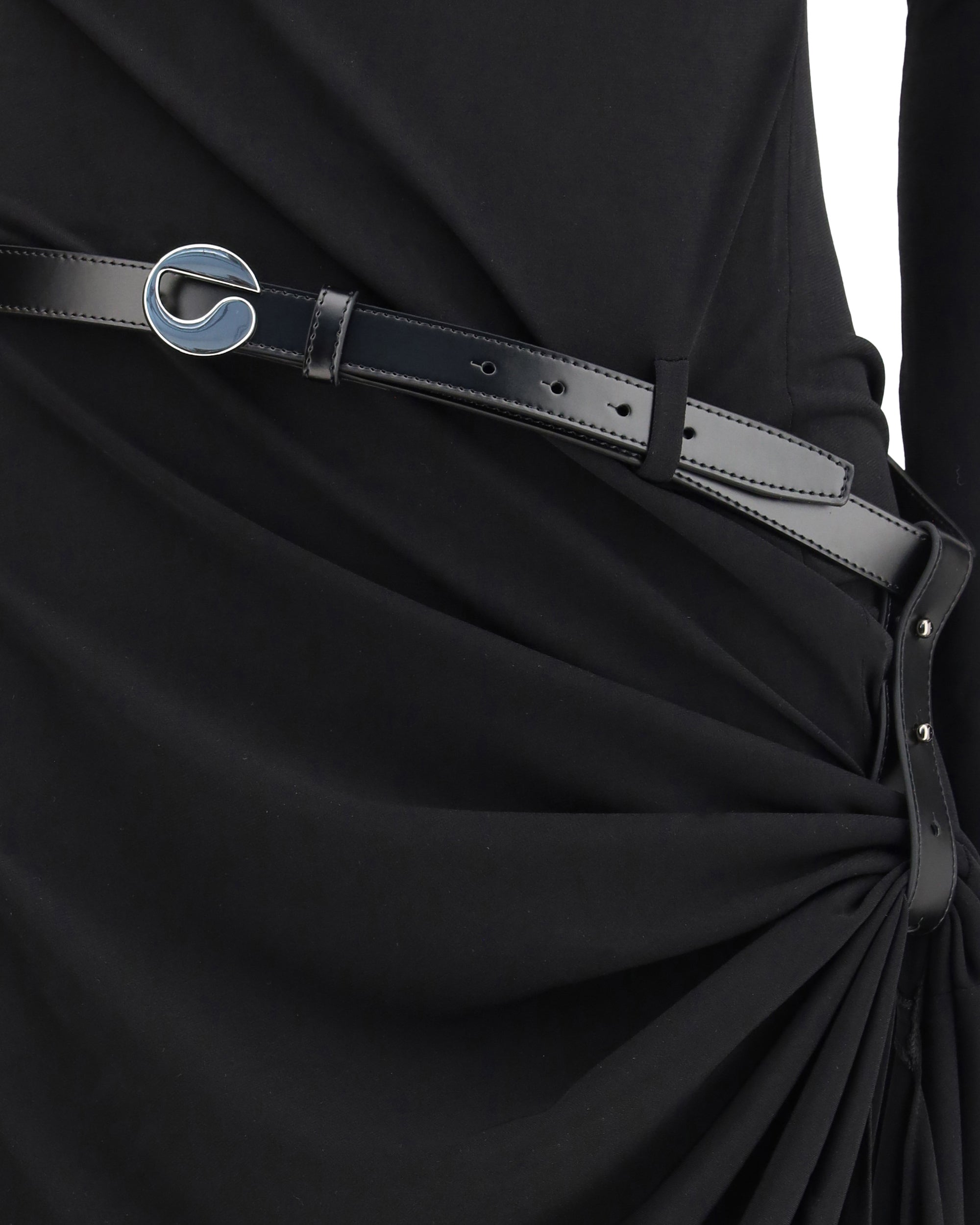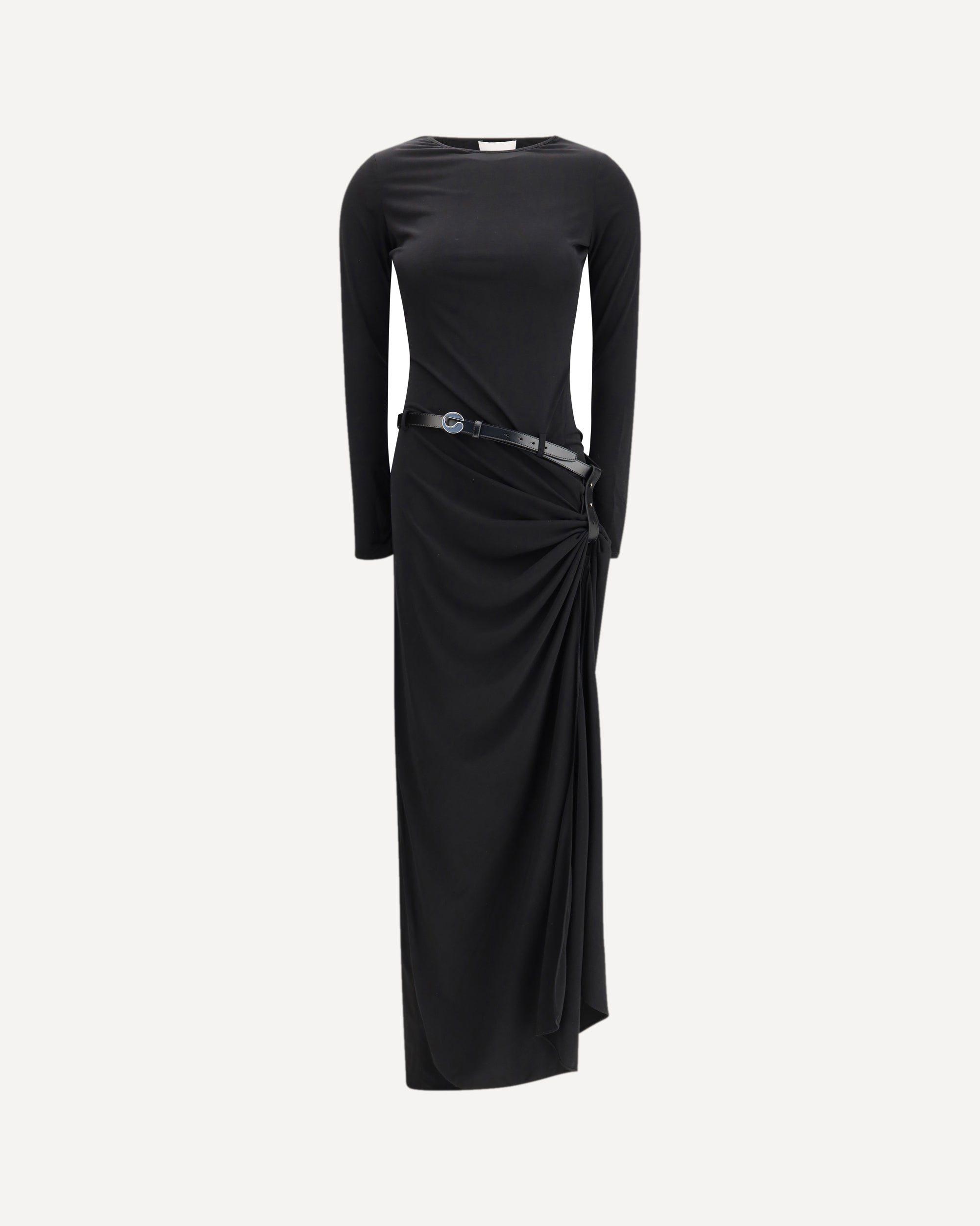 The Long-Sleeve Suspended Dress by Coperni features a fluid line that wraps the body with precision, defined by a high side slit that enhances the silhouette. A sculptural drape at the hip and a low-waisted belt interrupt the softness of the fabric, creating a harmonious contrast between structure and sensuality. The design embodies the brand’s architectural and contemporary vision, where purity of form meets an essential, modern sense of motion.