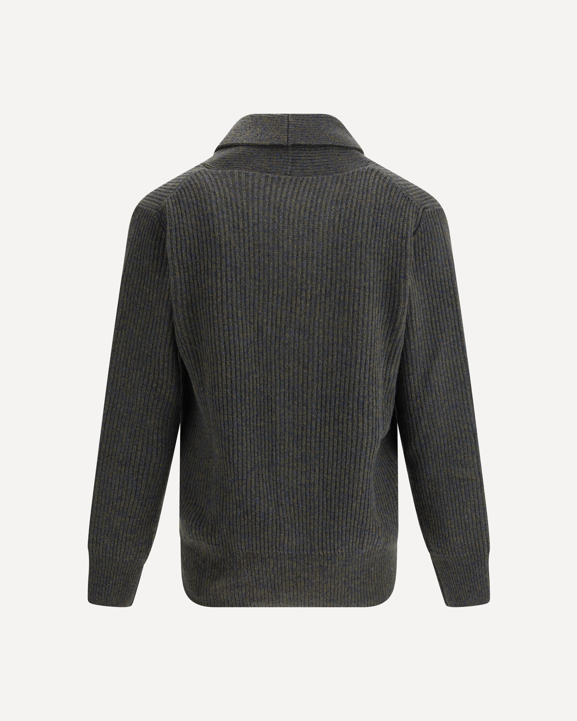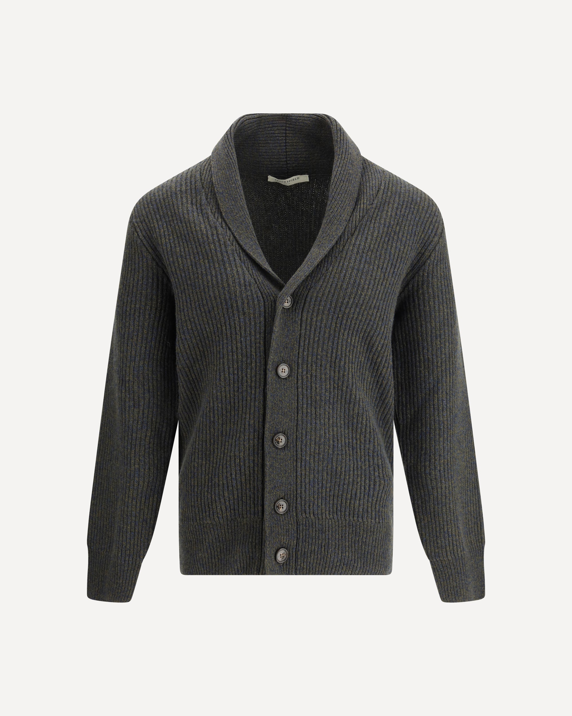 The Virgin Wool Shawl-Collar Cardigan blends comfort and refinement in a timeless silhouette. The ribbed texture enhances the natural softness of the yarn, giving the piece structure and depth. Button fastening highlights its classic character, while the shawl collar introduces a touch of effortless elegance. A wardrobe essential designed to bring style and ease to everyday moments.