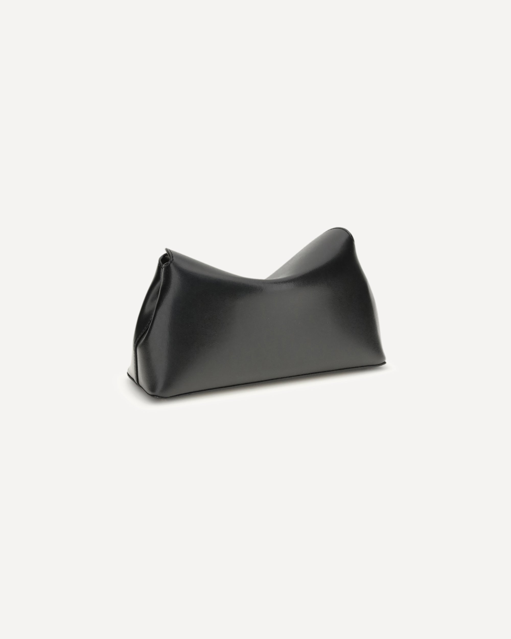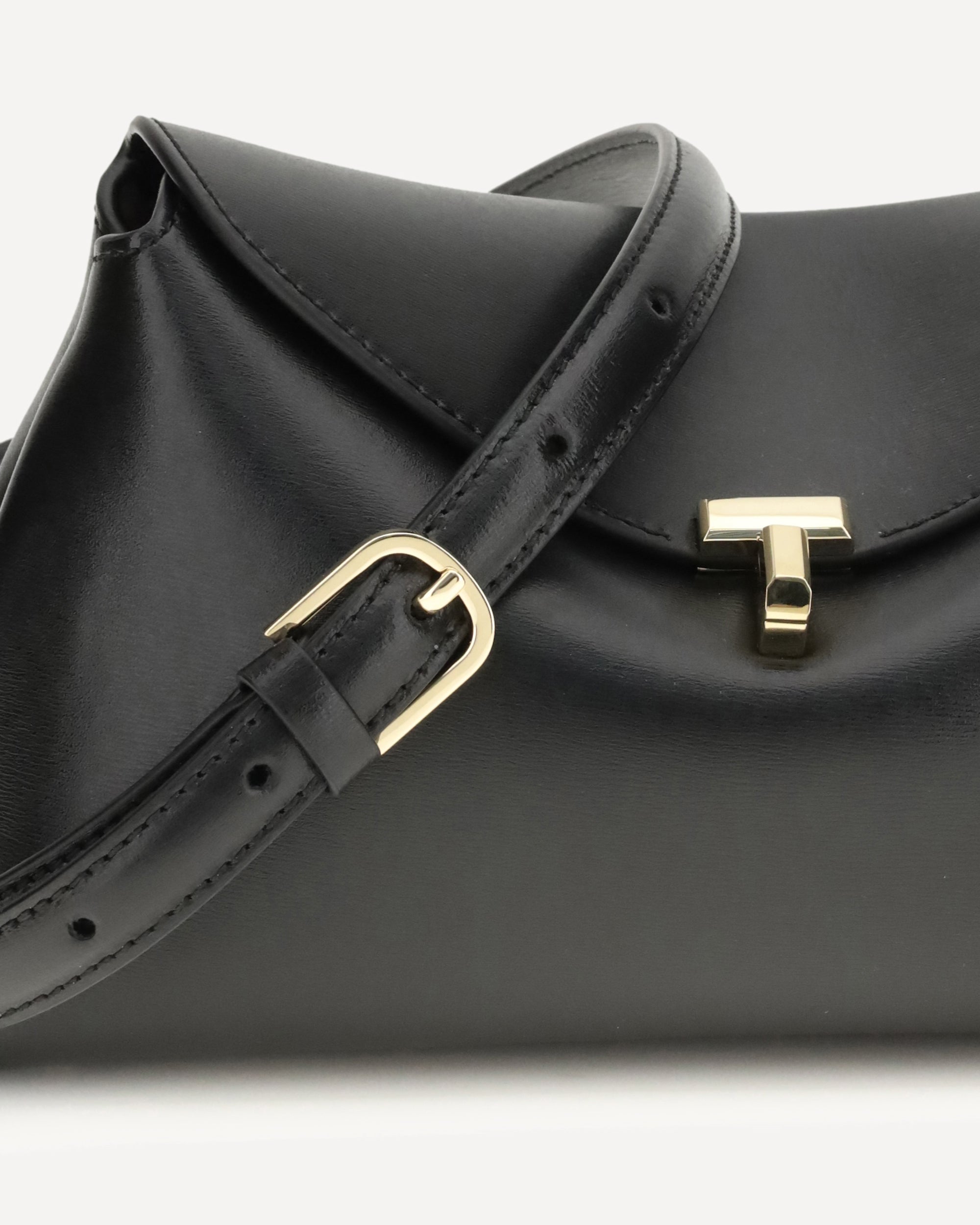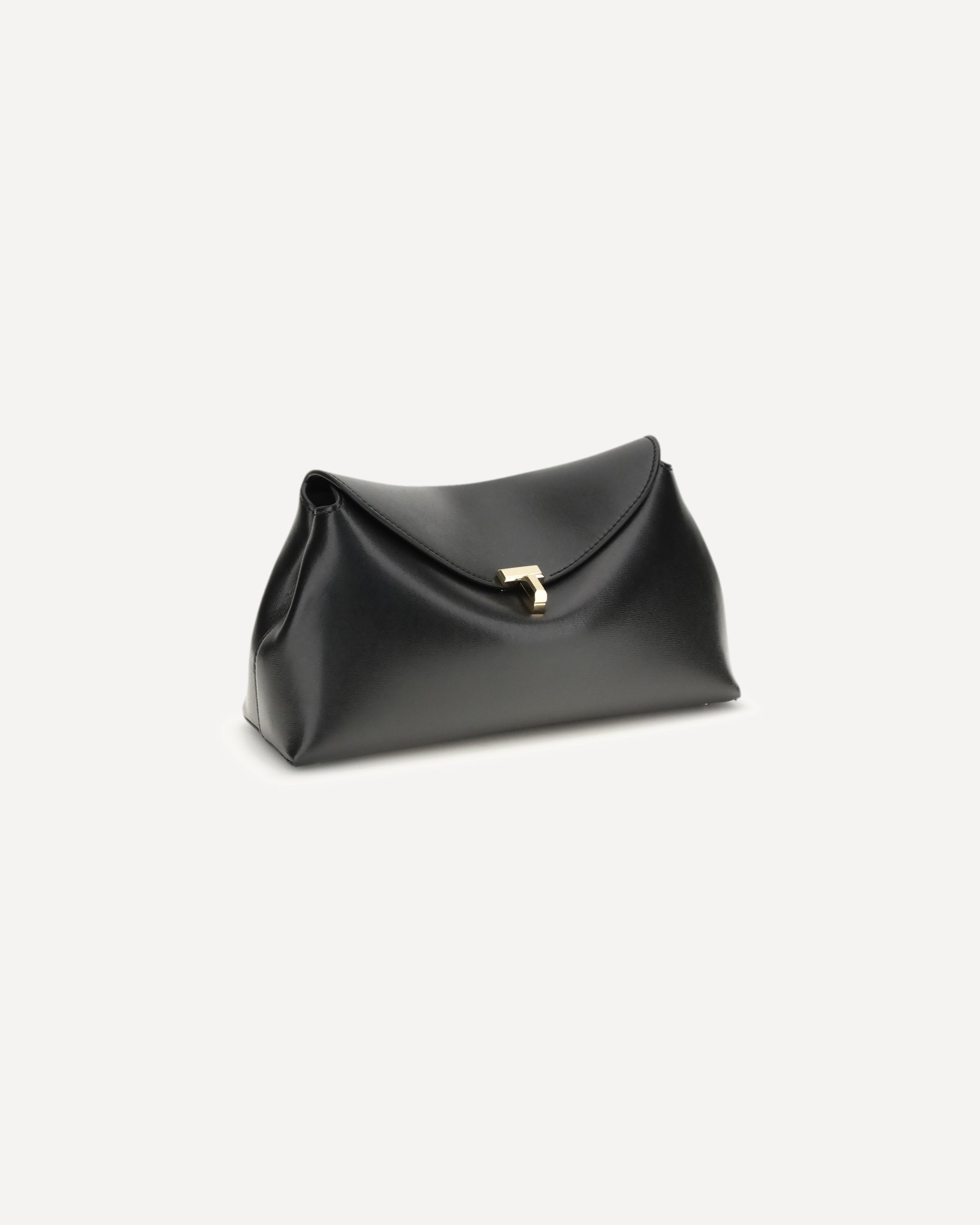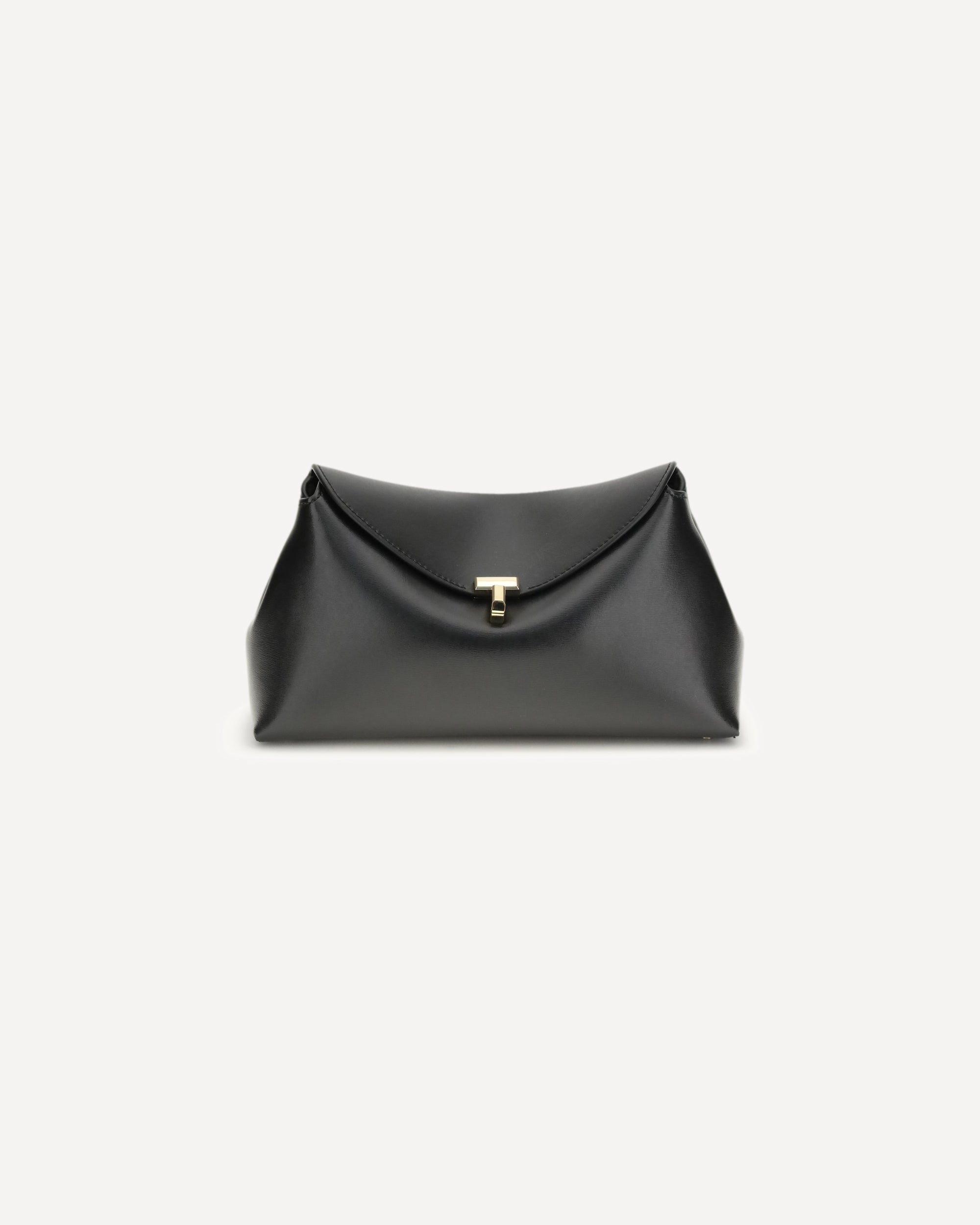 The T-lock Clutch by TOTEME is a sculptural piece defined by a gold-tone twist lock securing the curved top flap, enriched with decorative topstitching and protective feet. Handcrafted in Italy from smooth leather, it opens to a beige microsuede interior with a leather card slot. It can be carried by hand or worn crossbody using the detachable, adjustable strap, which must be attached with the clasp opening facing inward.