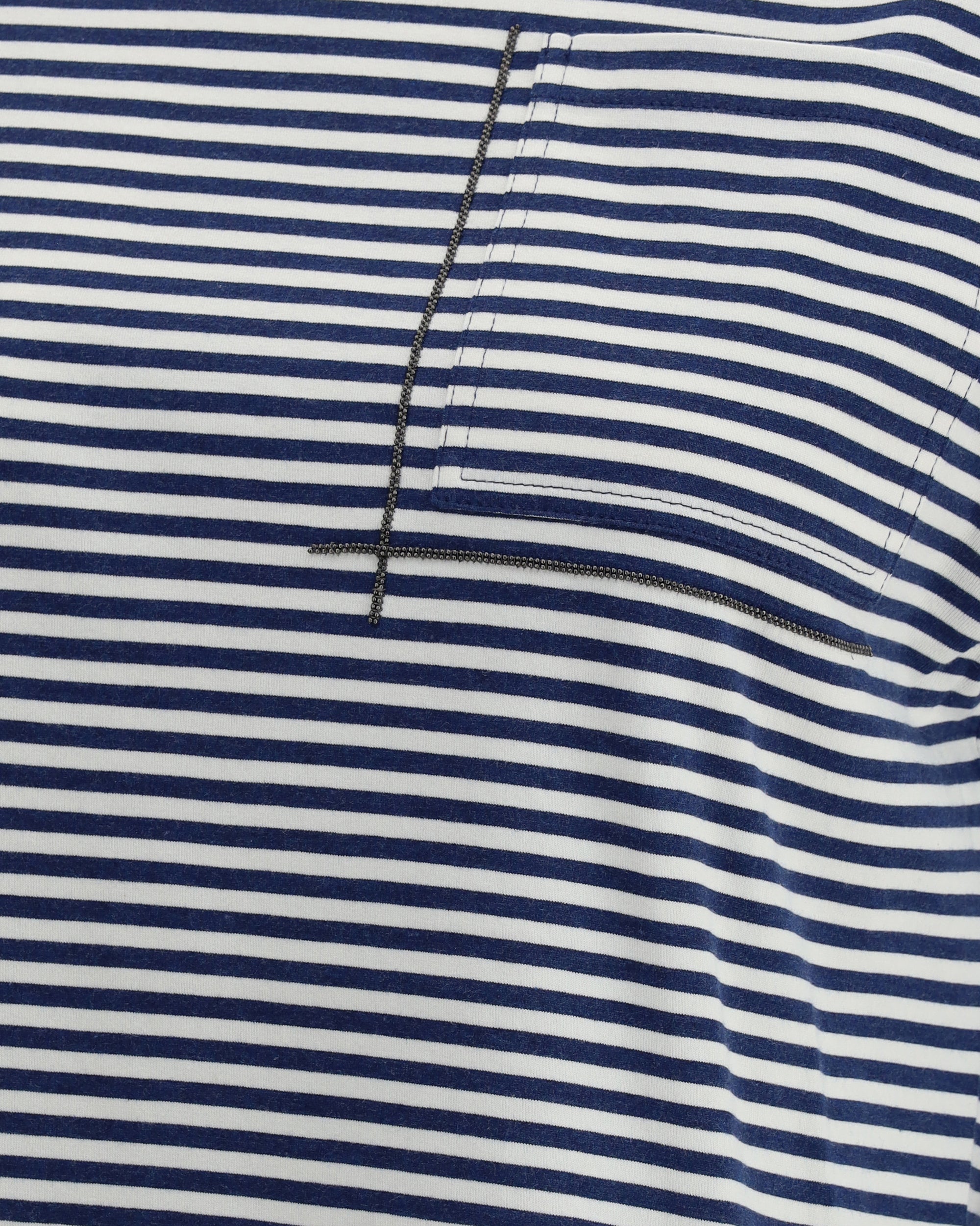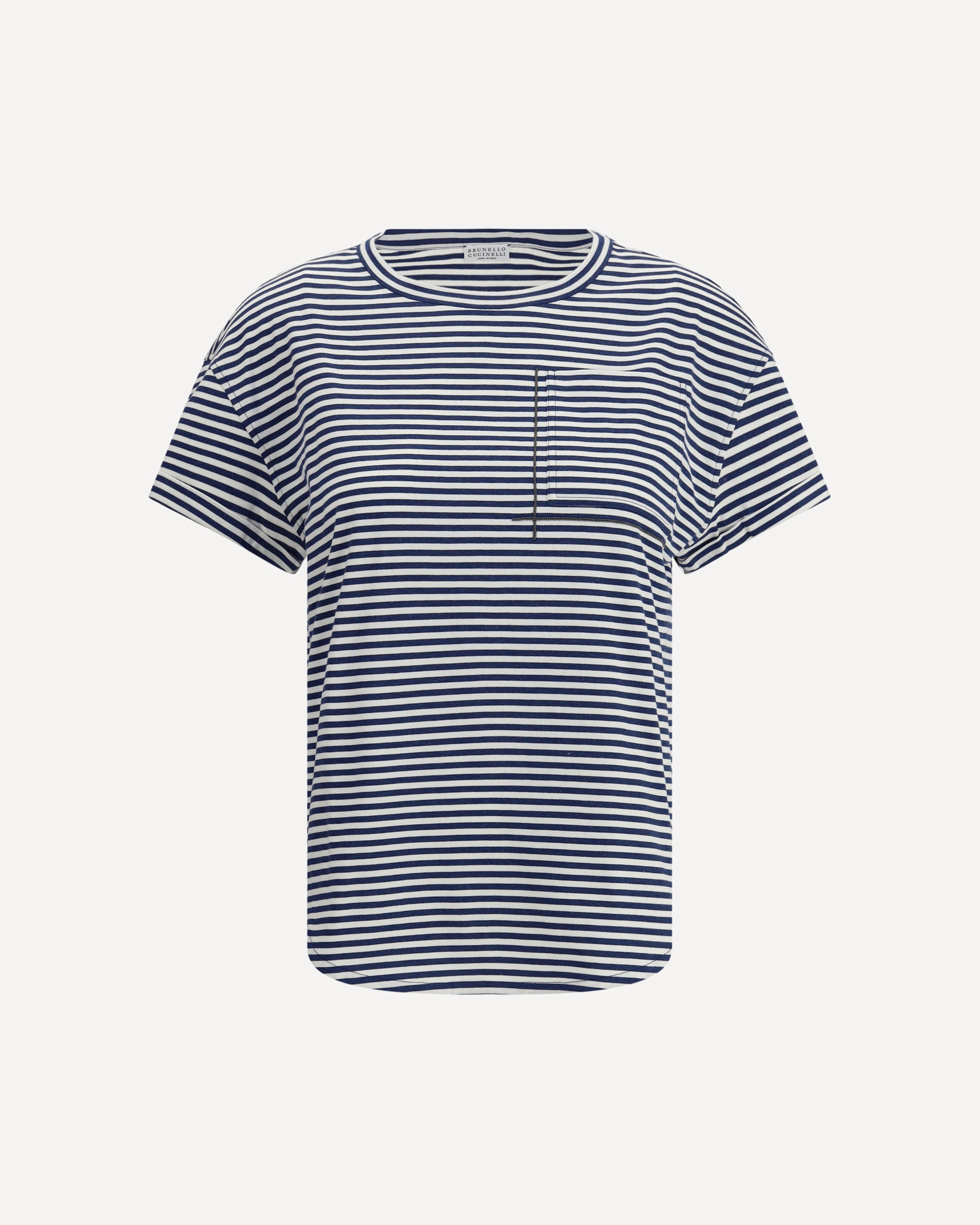 Brunello Cucinelli's cotton T-Shirt features a two-tone striped pattern, giving the garment a dynamic and modern touch. An appliquéd welt pocket on the front is embellished with iconic shiny jewel details, adding a note of light and sophistication. A rounded hemline completes the design, offering additional elegance to the pattern.