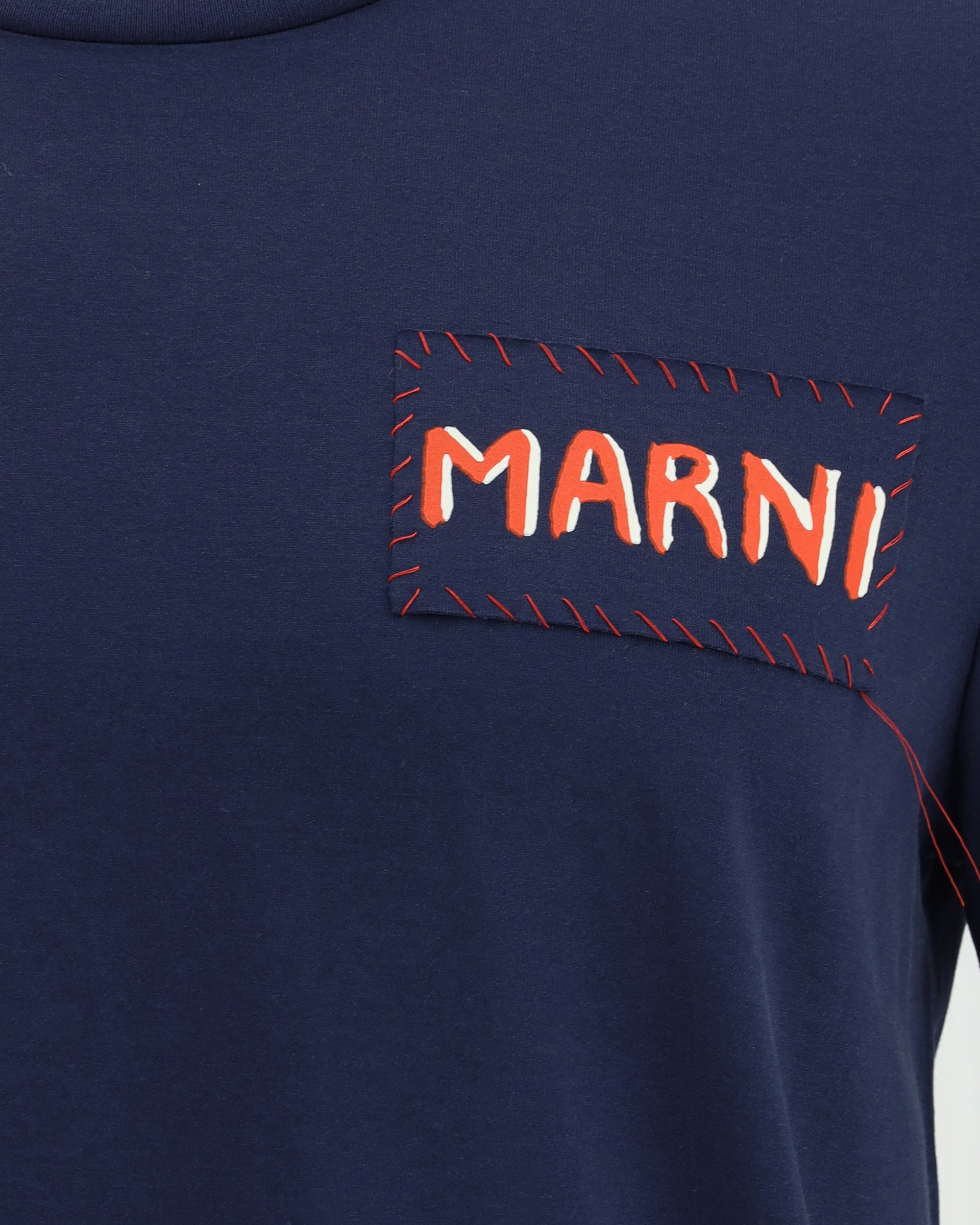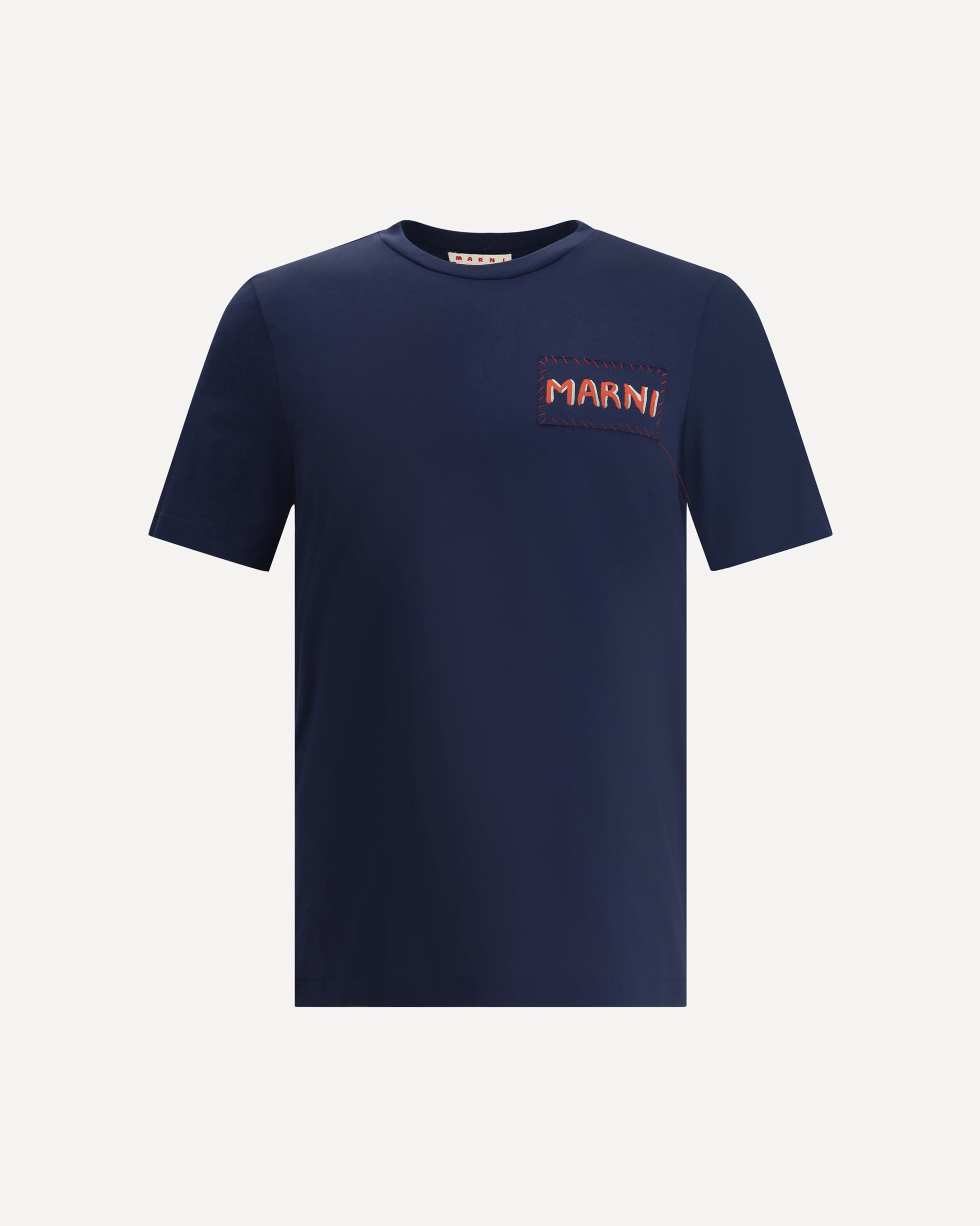 Marni's cotton T-Shirt features a sleek, contemporary design. The ribbed crew neck offers a comfortable and classic fit, while the monochrome pattern keeps the look clean and versatile. The brand's iconic monogram patch applied to the front adds a distinctive and recognizable touch.