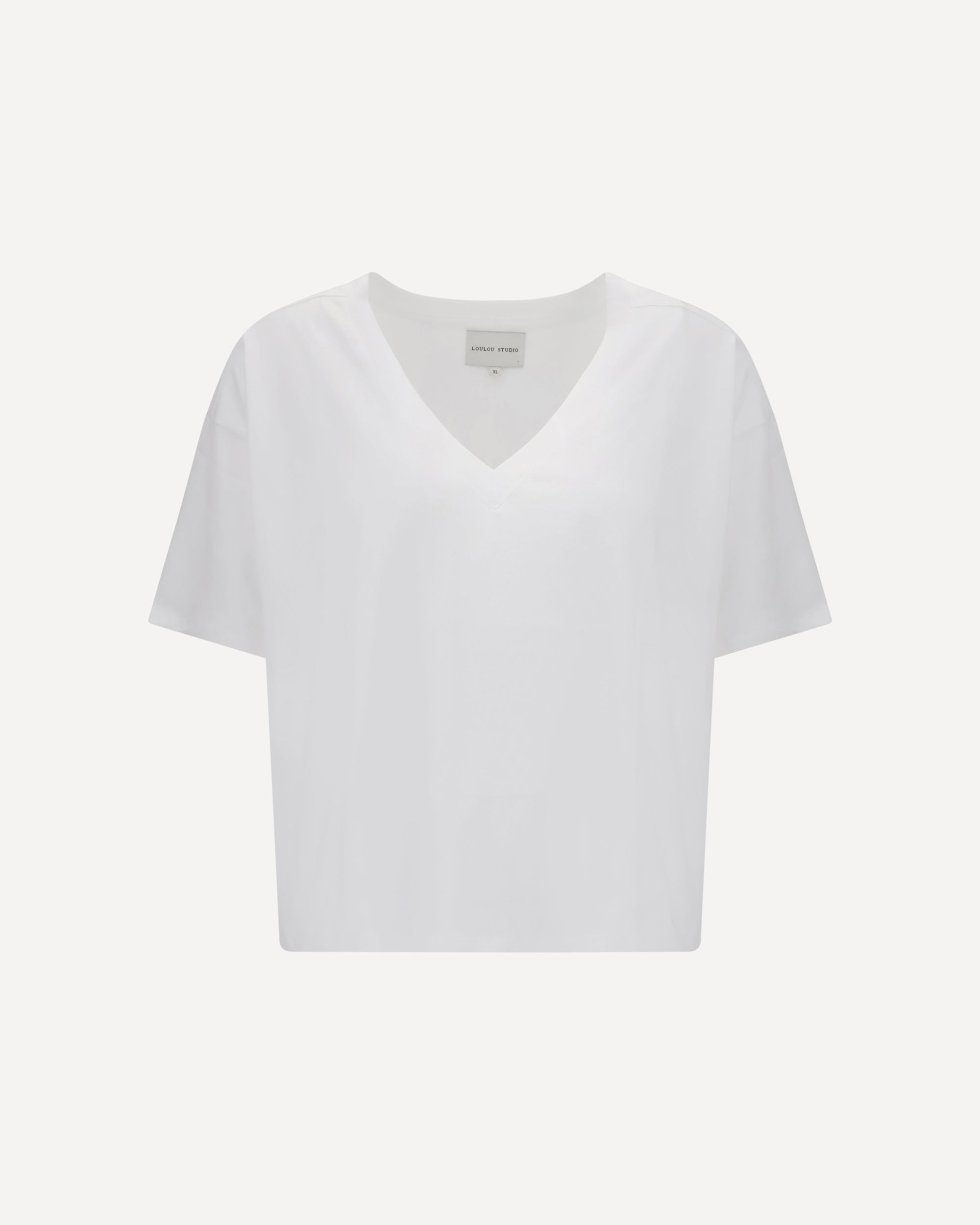 LouLou De Saison's cotton T-Shirt is a versatile garment that combines comfort and style. Featuring a V-neck on the front and an asymmetrical hemline, it offers a modern and dynamic silhouette. Perfect for a casual yet sophisticated look, it can be easily paired with a variety of outfits for a touch of casual elegance.