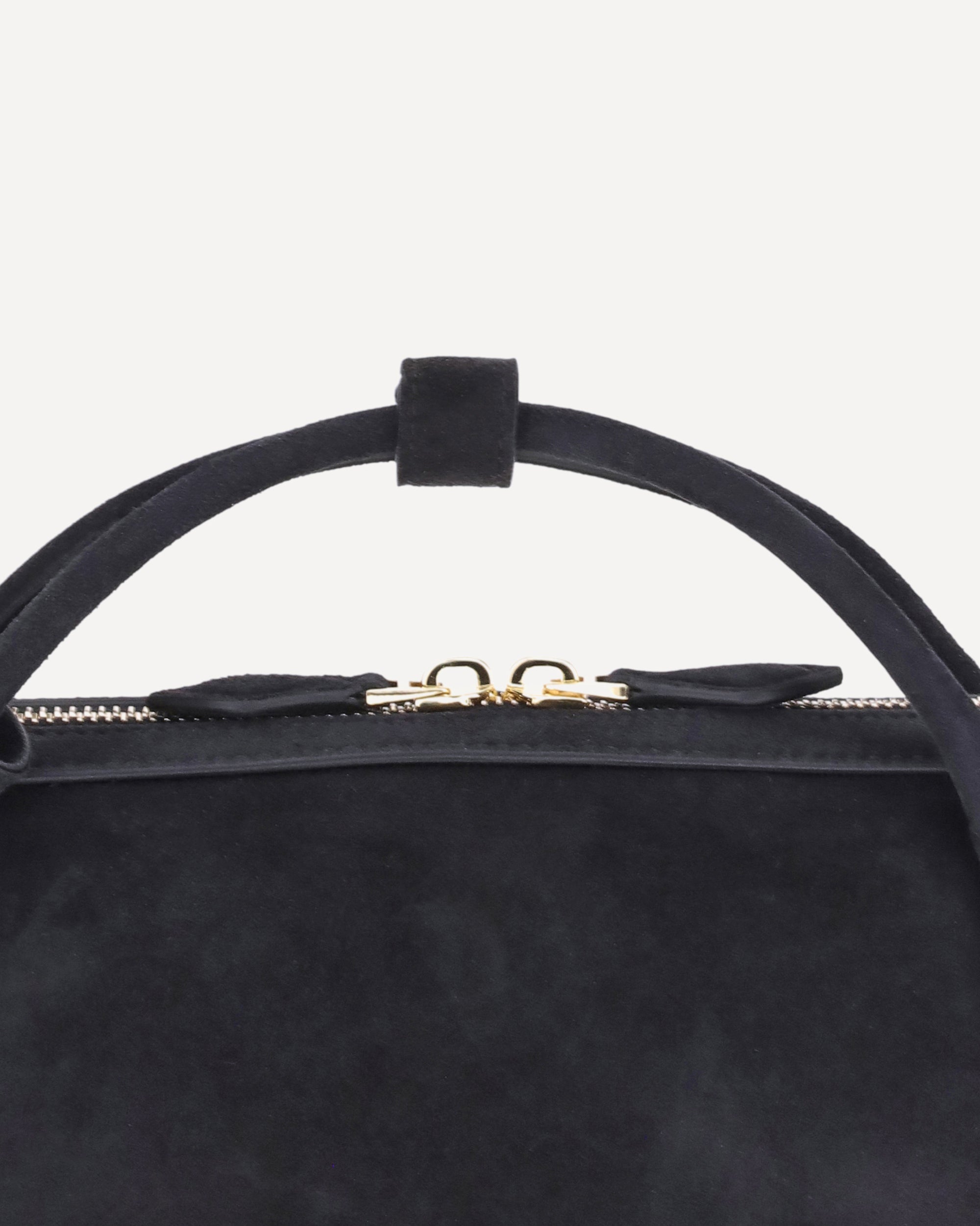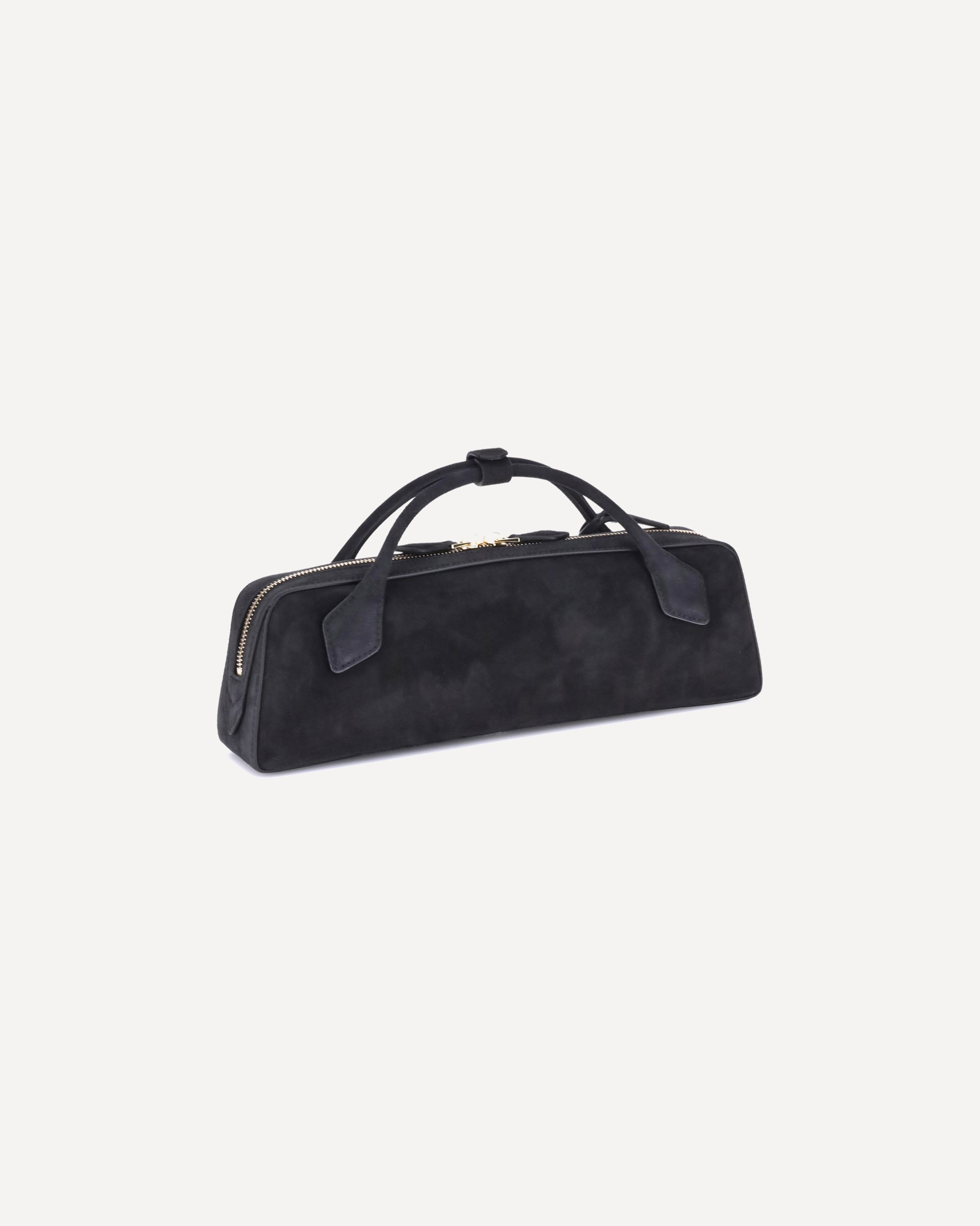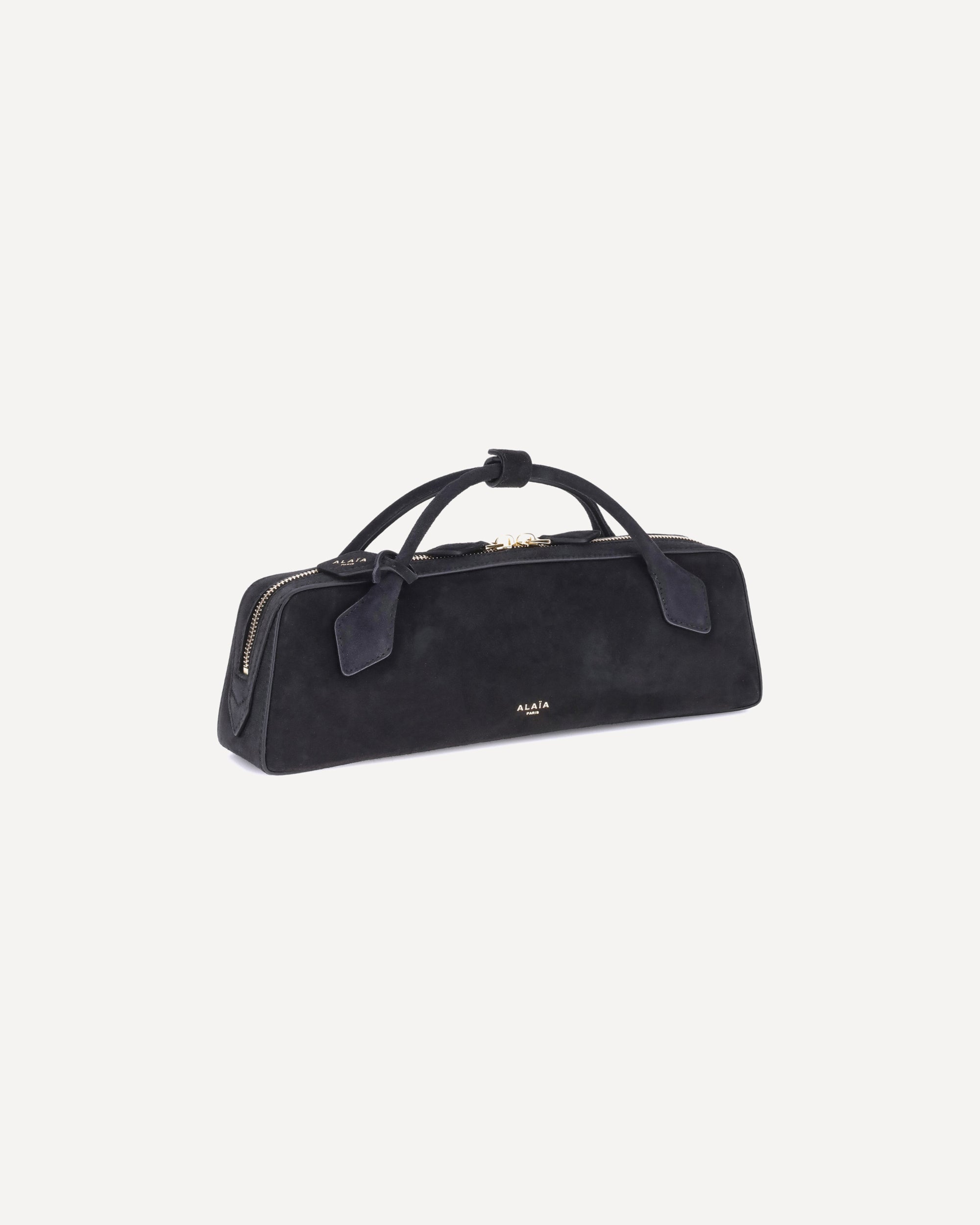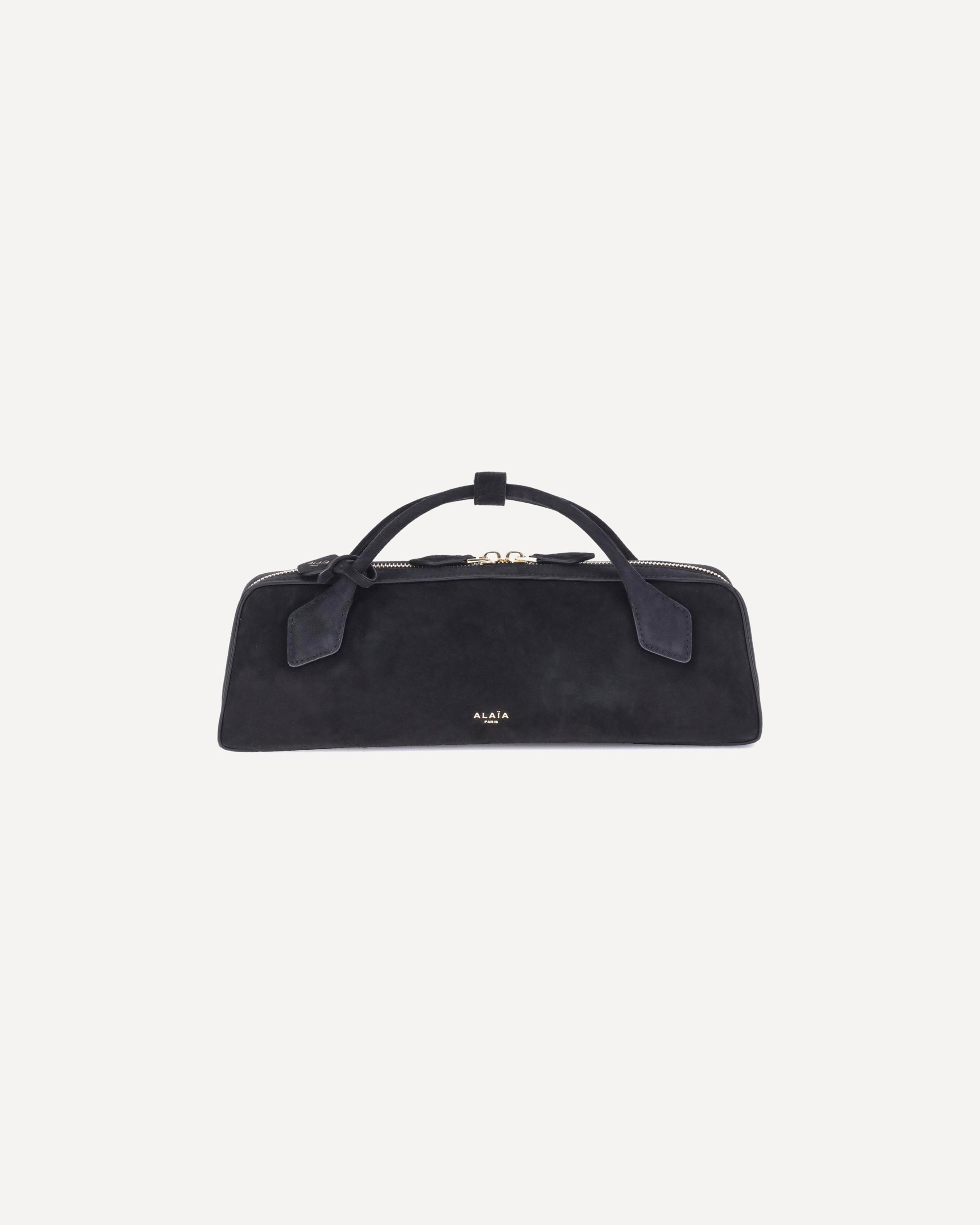 The Le Teckel goat leather Clutch bag by Alaïa is a sleek, modern accessory featuring a distinctive geometric design. Rigid semicircular double handles on the top give it a structured and sophisticated silhouette. The double-slider zipper closure at the top ensures practicality, while the brand's iconic contrasting monogram on the front panel adds a recognizable touch. Crafted in suede leather, this clutch bag is the epitome of luxury and craftsmanship, perfect for completing a refined, contemporary look.