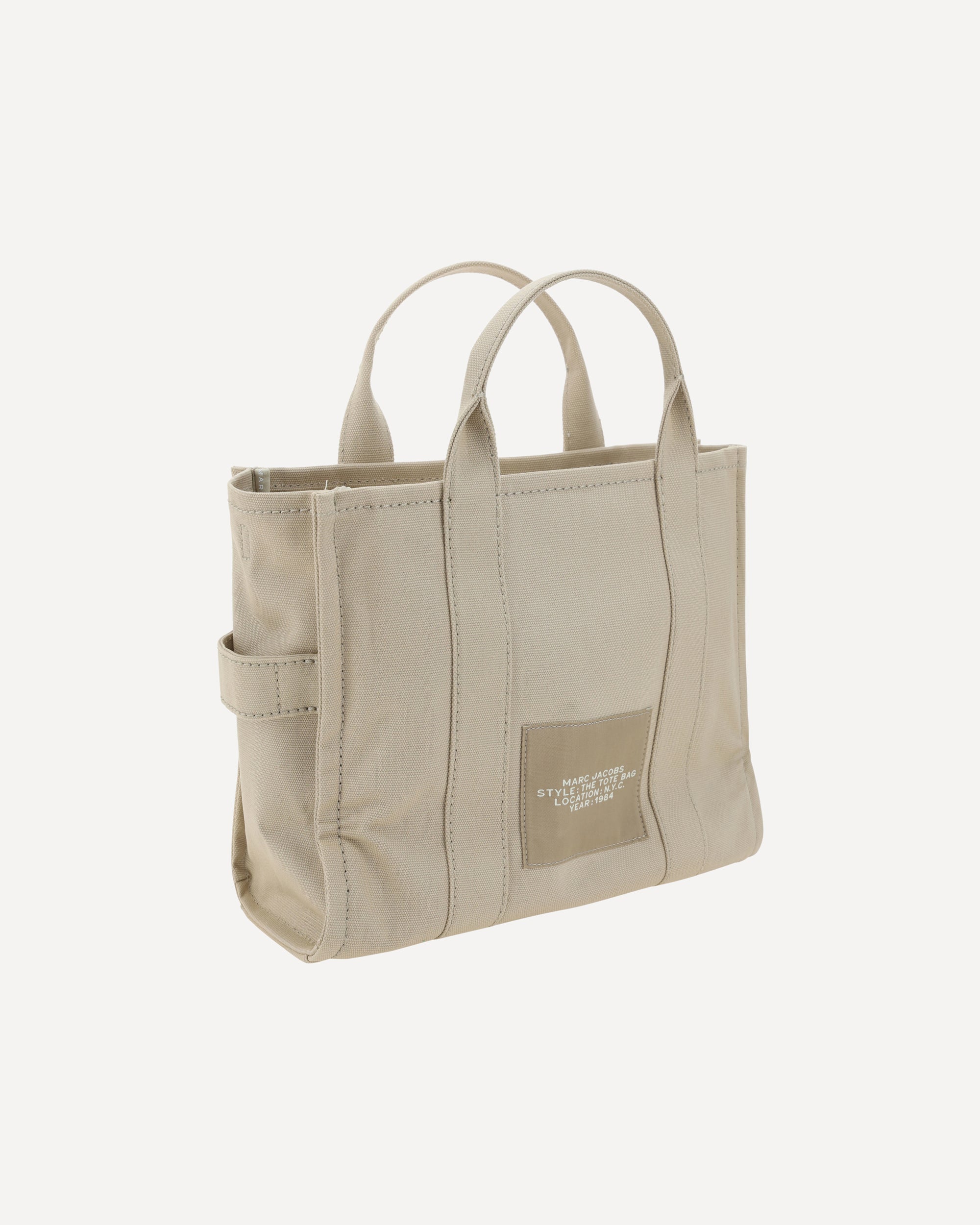 The cotton Medium Tote Handbag by Marc Jacobs, two rigid tubular top handles, top zipper closure, single interior pocket, adjustable and removable flat shoulder strap, contrasting iconic brand monogram print on front, contrasting iconic brand monogram patch applied on back.