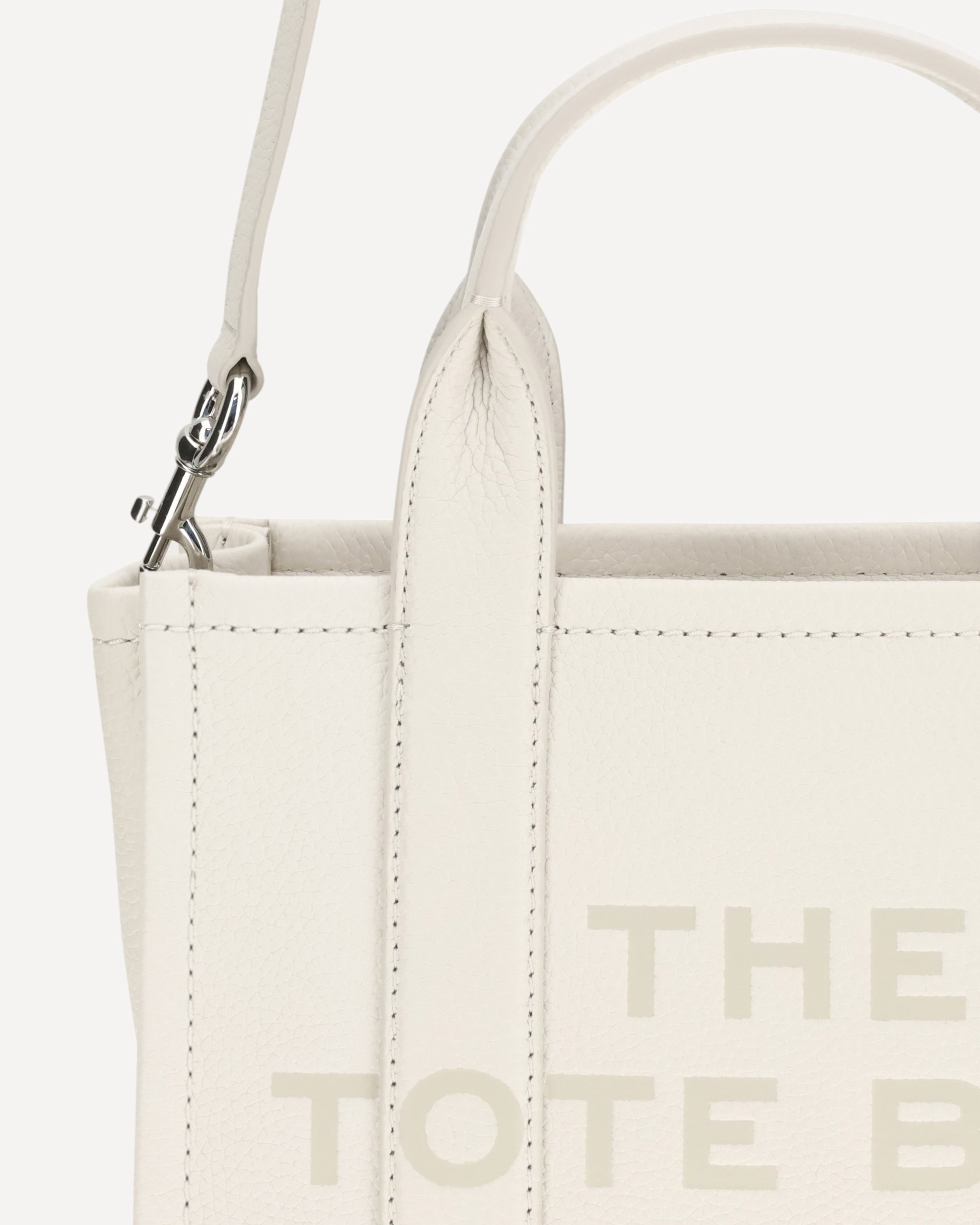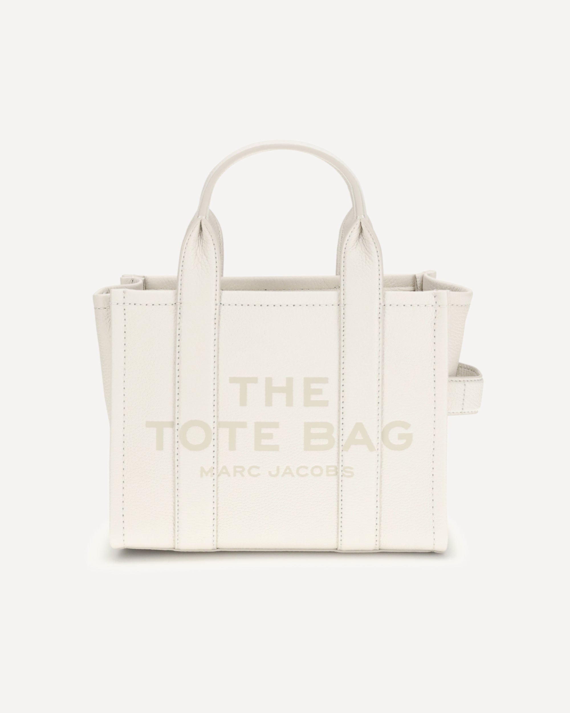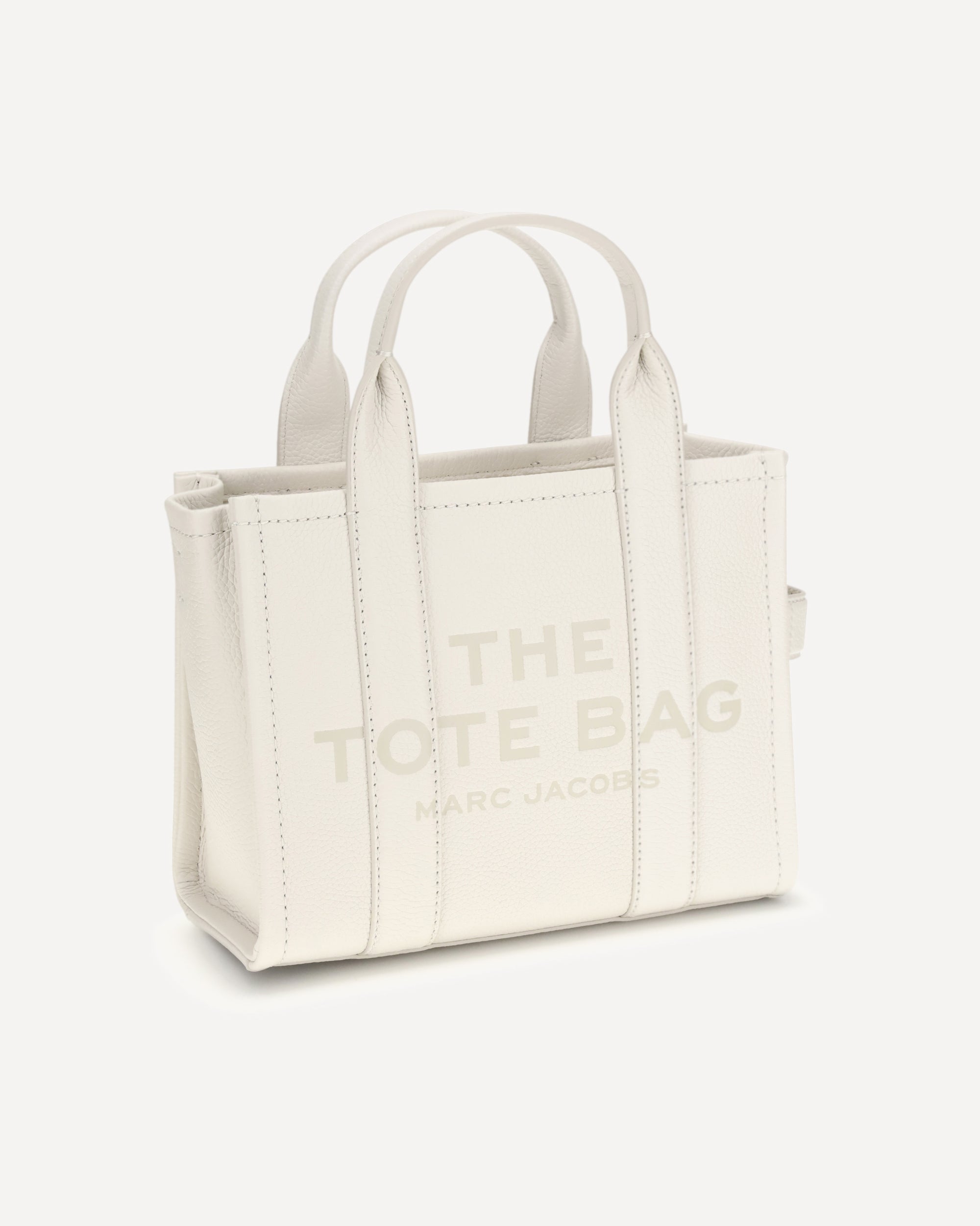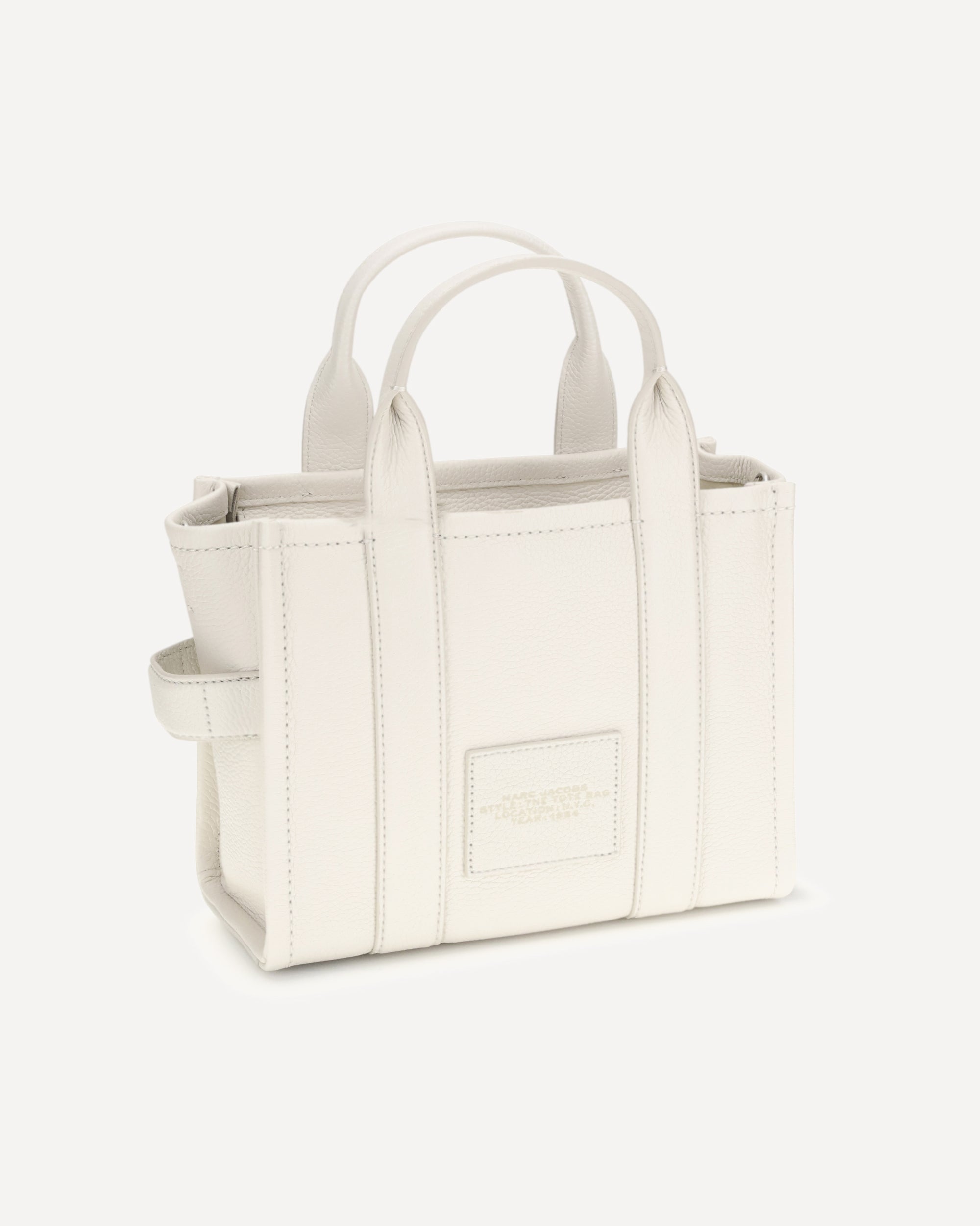 The Small Tote Handbag by Marc Jacobs is made of grained leather, with a sleek and sturdy design. The two stiff tubular handles on top provide a comfortable grip, while the zippered closure keeps items inside secure. Inside, a single pocket offers additional practicality. The adjustable and removable flat shoulder strap adds versatility, allowing it to be carried over the shoulder as well. The brand's iconic monogram is contrastingly printed on the front, while the back features a leather patch with the logo applied by pressure, completing the bag's distinctive, modern look.