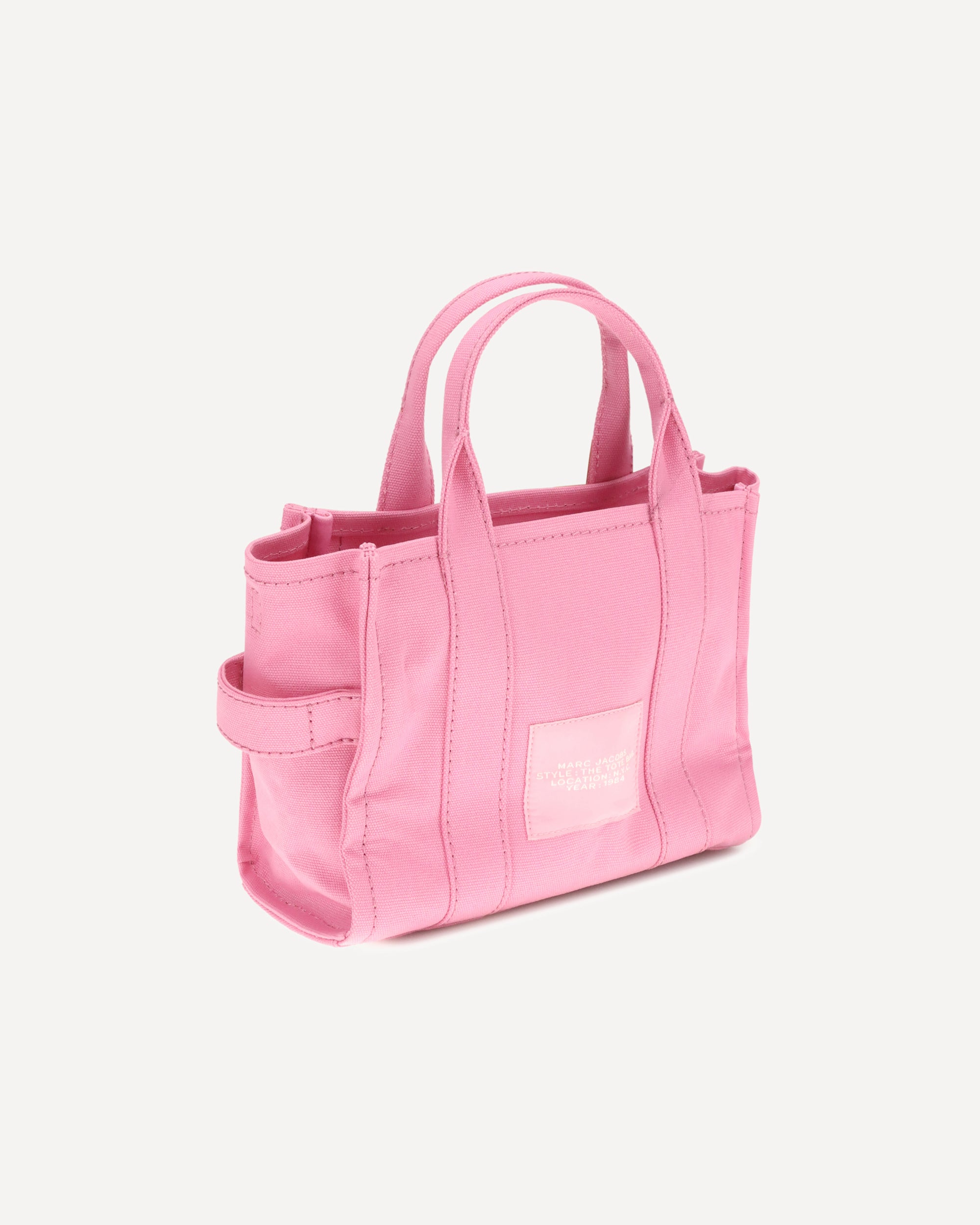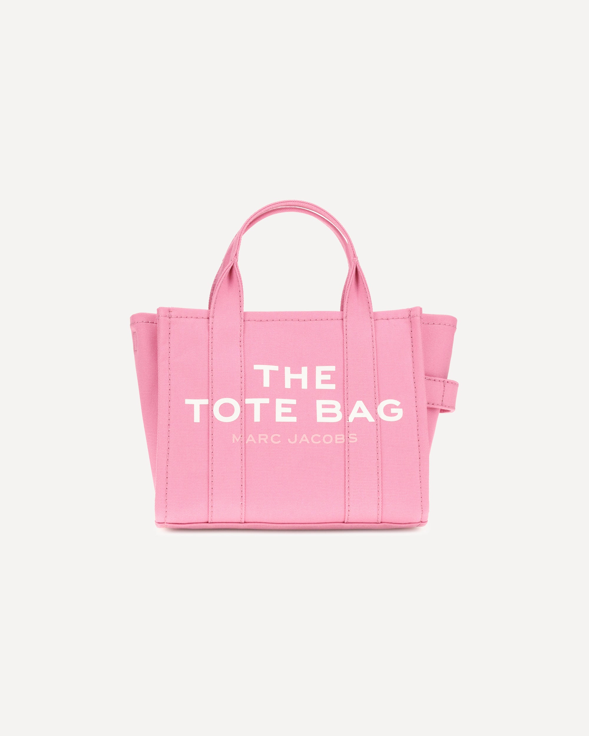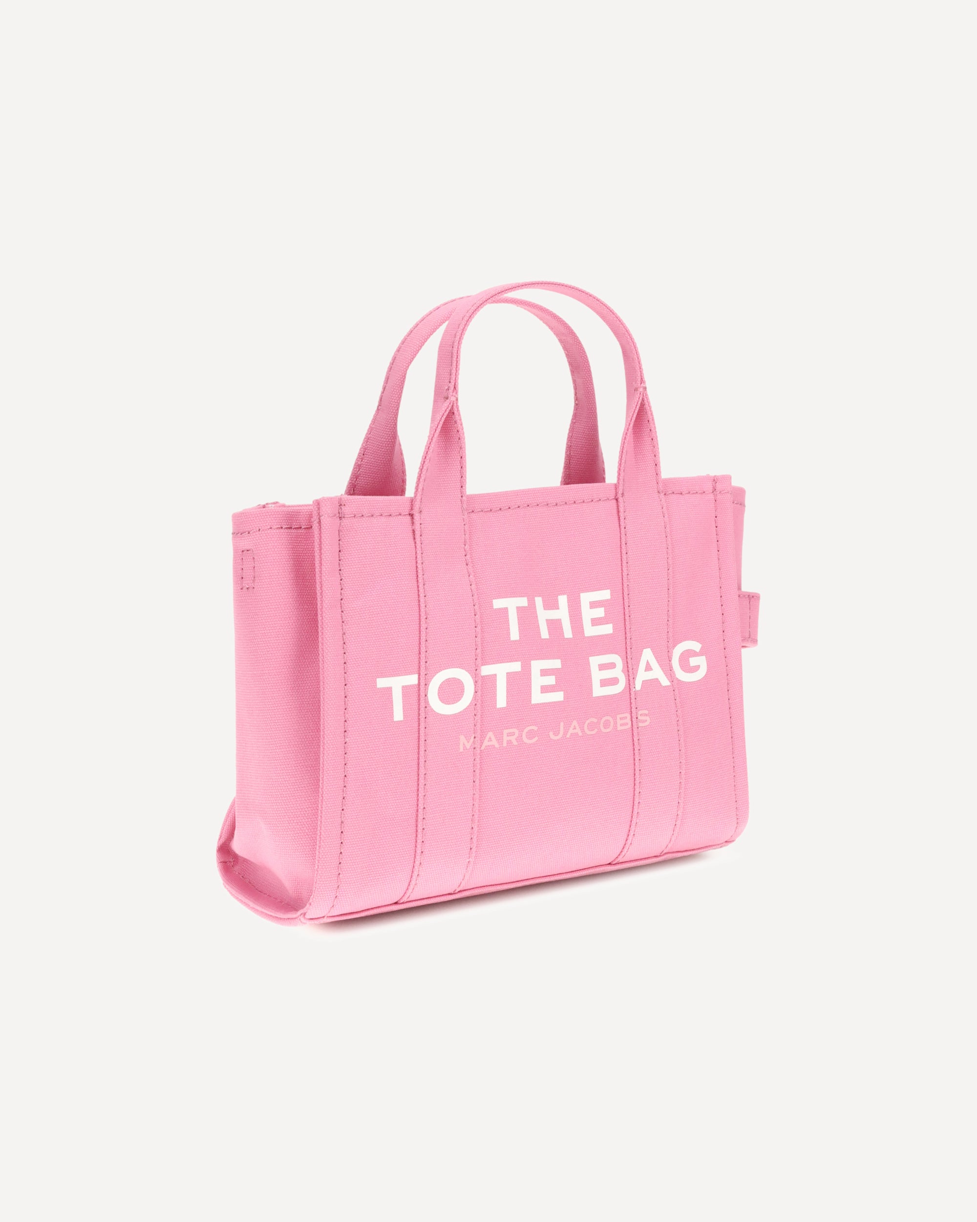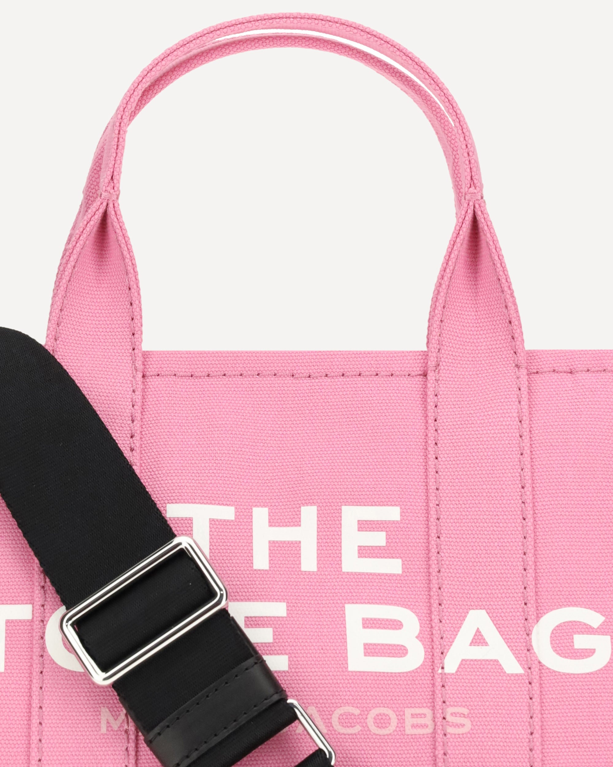 Cotton The small Tote Handbag by Marc Jacobs, two rigid tubular top handles, top zipper closure, single interior pocket, adjustable and removable flat shoulder strap, contrasting jacquard print iconic brand monogram on front, contrasting patch with iconic brand monogram applied on back.