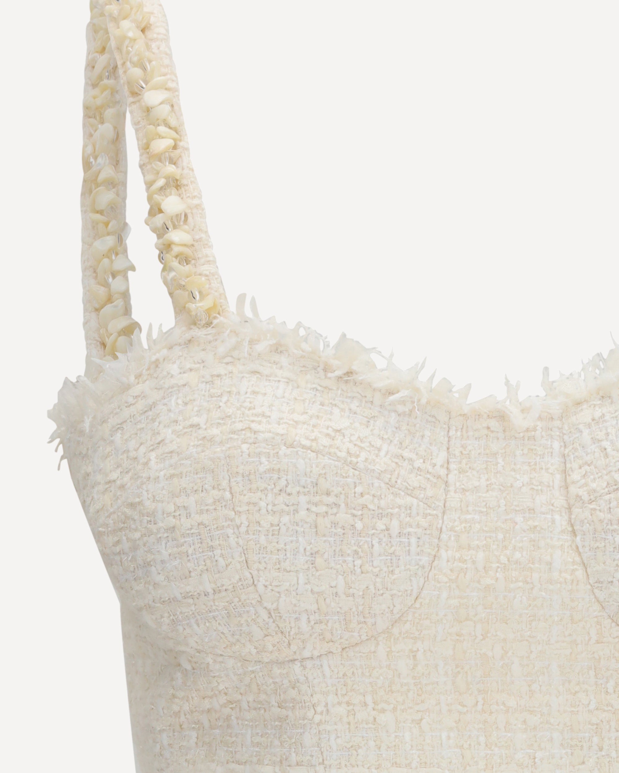 The Tweed Top with pearl straps by Balmain is an iconic and refined Top featuring a check pattern and textured tweed fabric. The pearl chain straps add an elegant and distinctive touch, while the frayed edges with visible cups enhance the femininity of the design. A sophisticated piece that blends tailoring tradition with contemporary style.