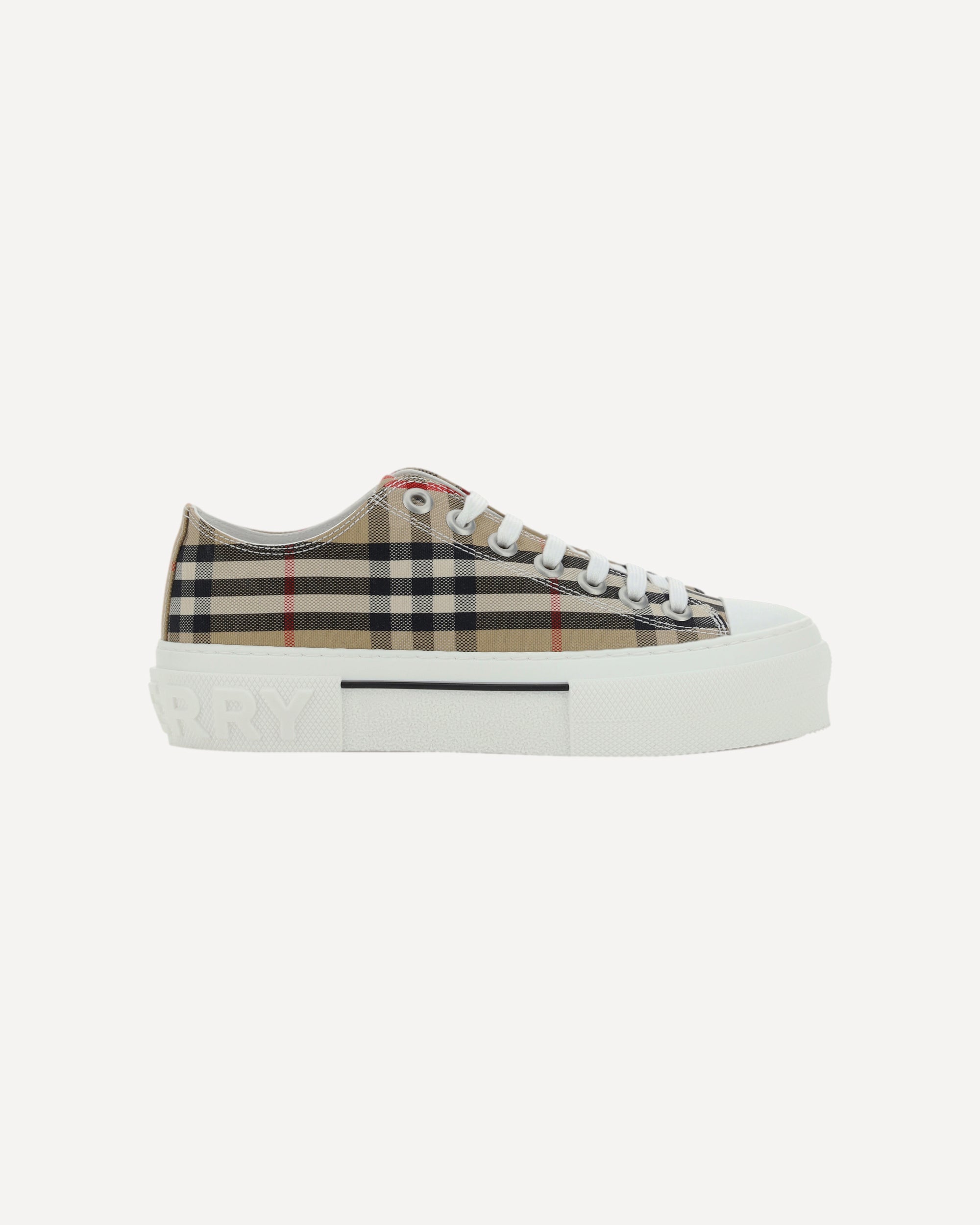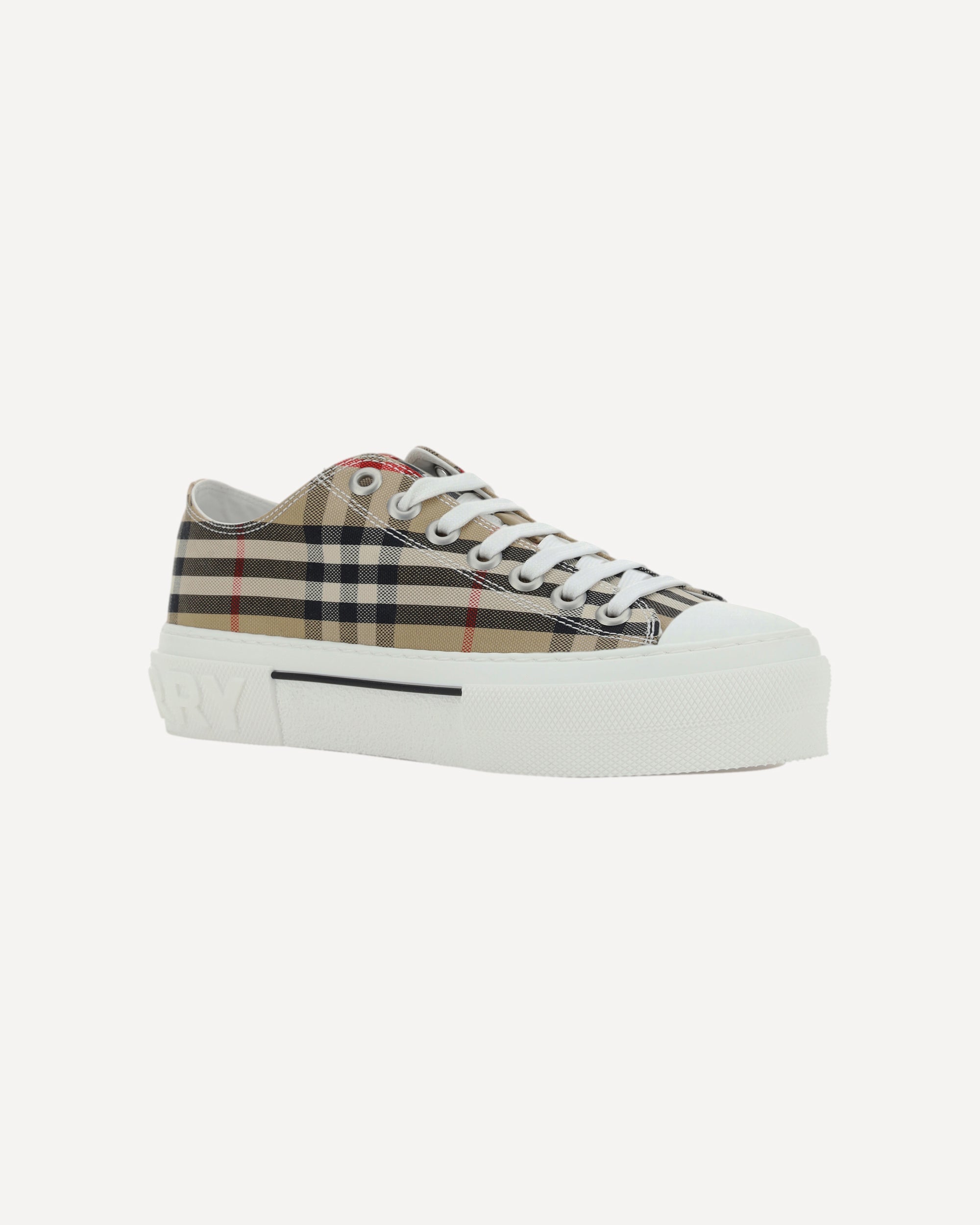The cotton TNR Jack Low Sneakers by Burberry combine urban style and heritage, with a rubber-reinforced round toe and a practical lace-up front closure. The brand's iconic pattern is repeated all-over, giving an instantly recognizable character, while the embossed monogram on the heel adds a distinctive detail that completes the design with contemporary elegance.