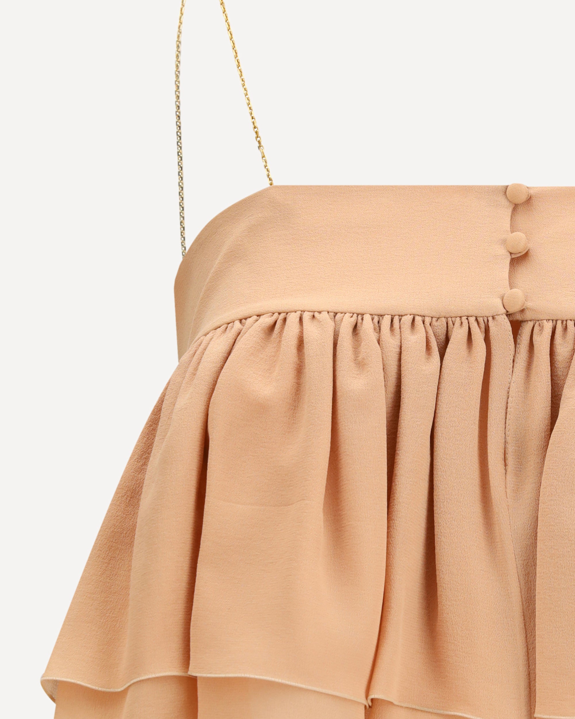 The sleeveless ruffled Top in silk georgette by Chloé is crafted from the house’s signature organic silk and features a tiered, flowing silhouette. Adjustable chain straps with the signature “C” detail and fabric-covered buttons at the back complete the design, evoking a refined and romantic spirit typical of the brand.