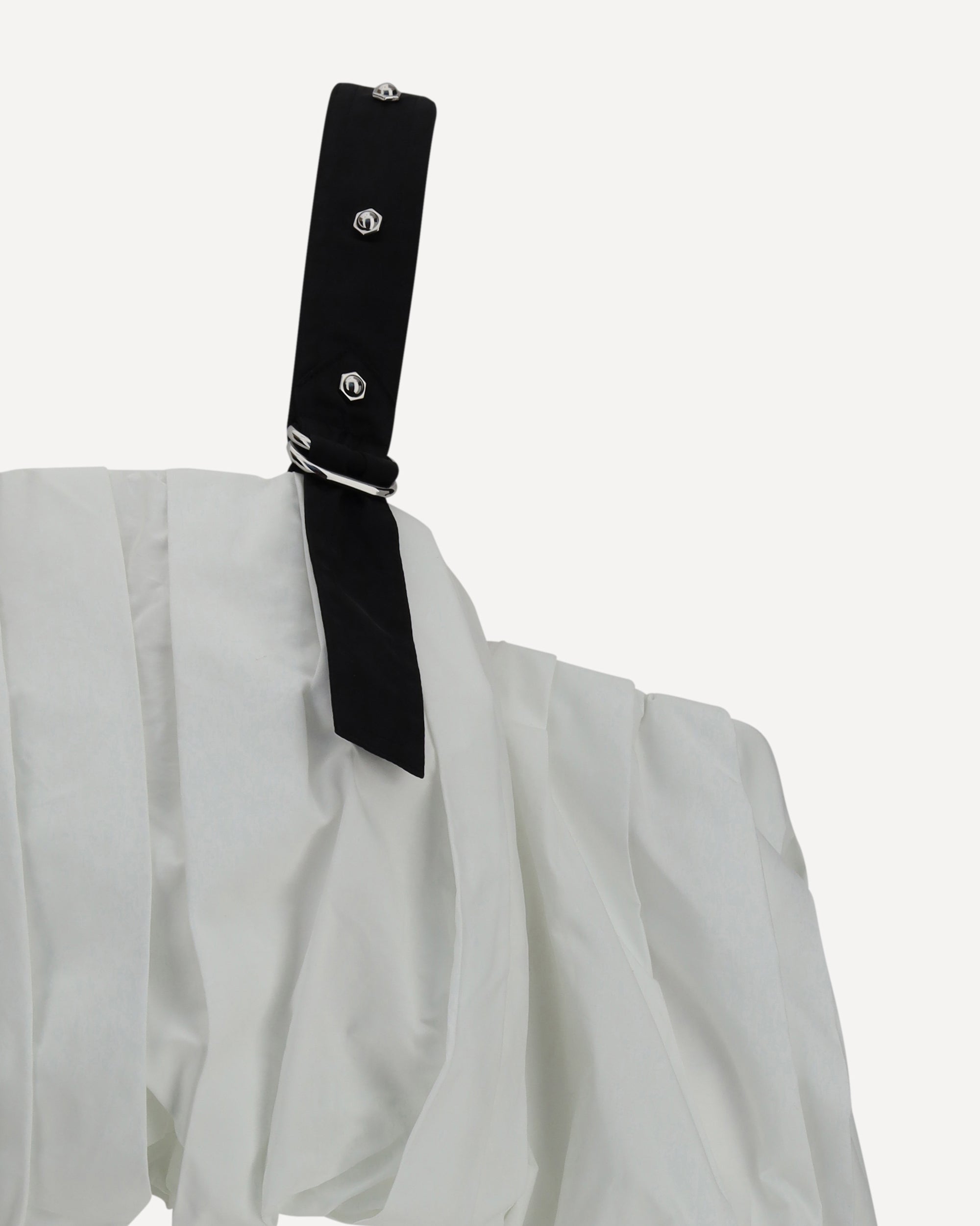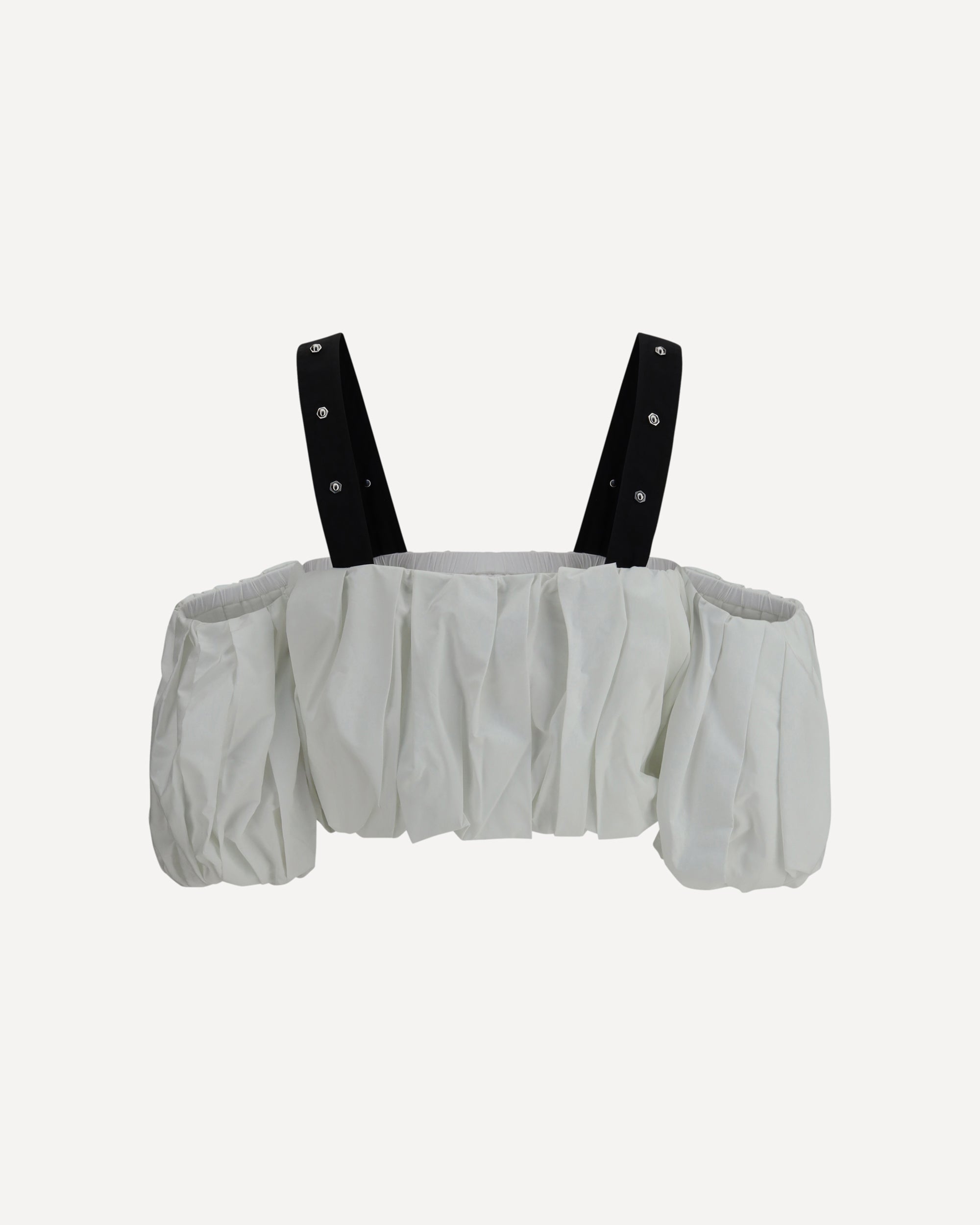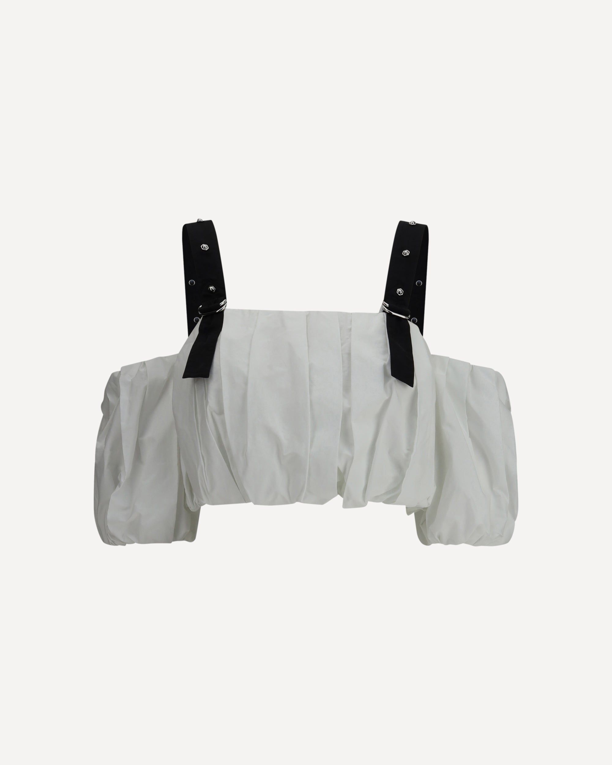Pinko's crop Top is a bold, feminine piece perfect for a trendy summer look. Featuring bare shoulders and studded adjustable straps, it adds a rock touch to its elegance. Balloon sleeves complete the design, giving volume and movement to the top for a young and dynamic silhouette.