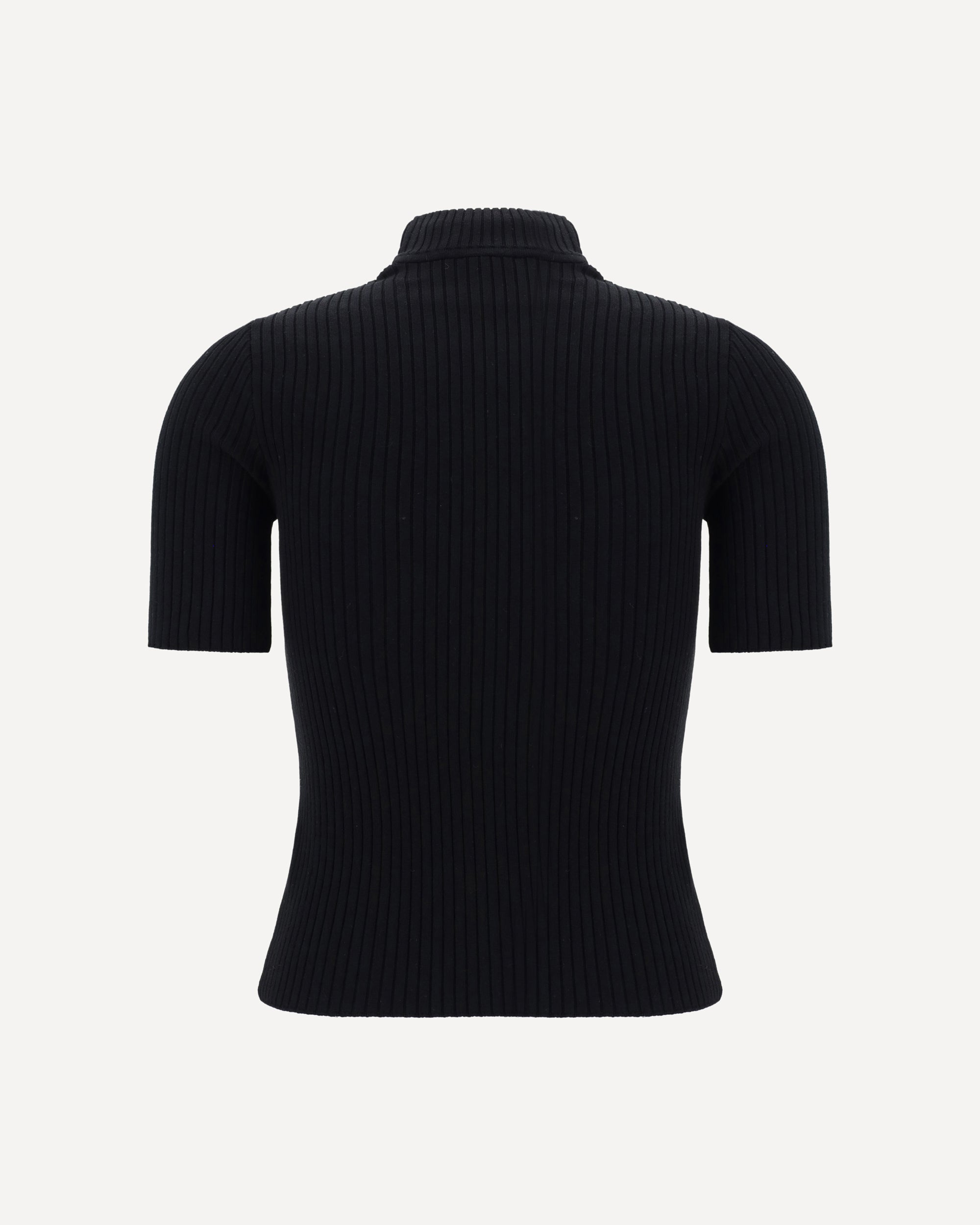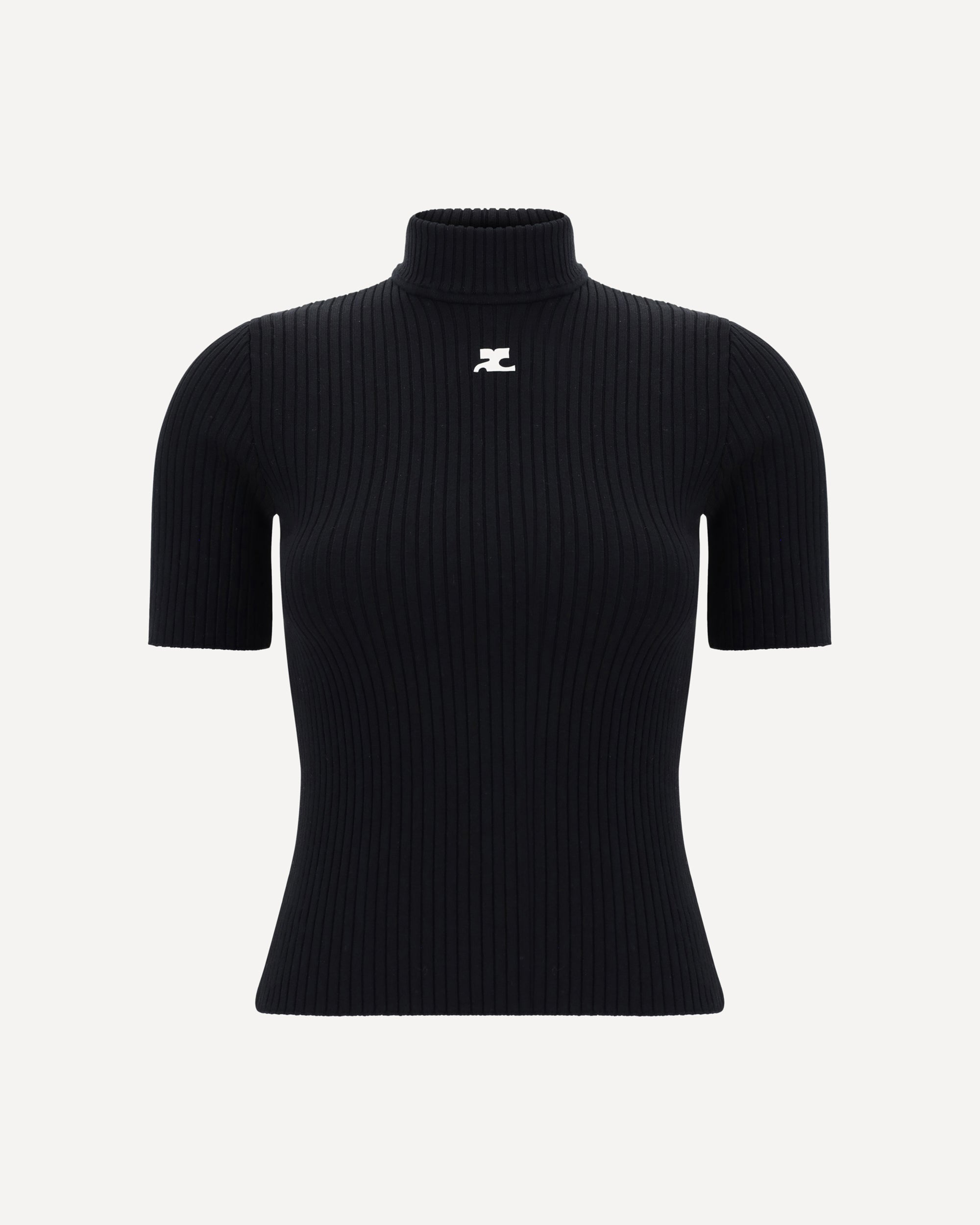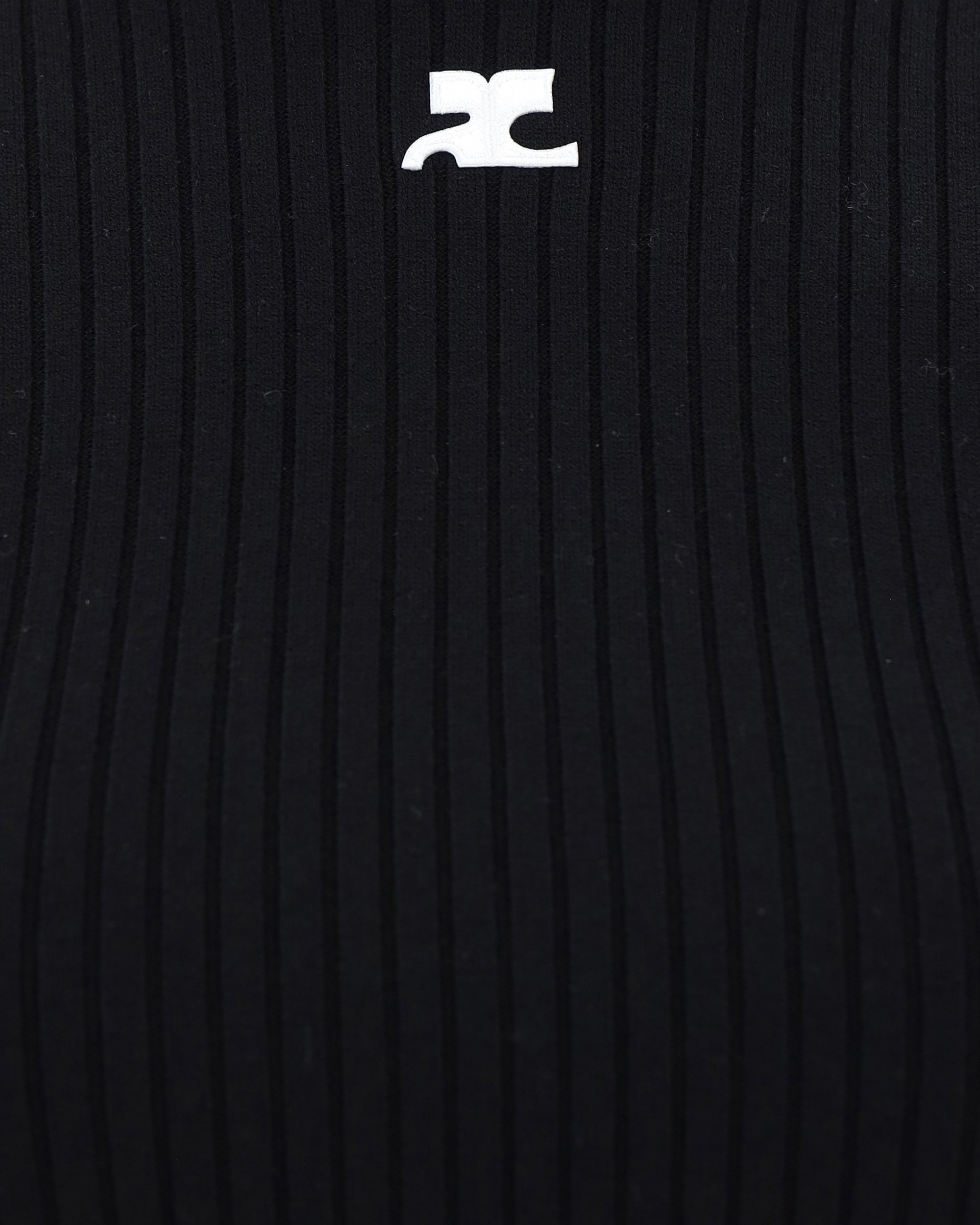 Top by Courrèges, short-sleeved design, high colo, iconic contrasting embroidered brand logo on front, all-over ribbed design, monochrome pattern, slim fit.