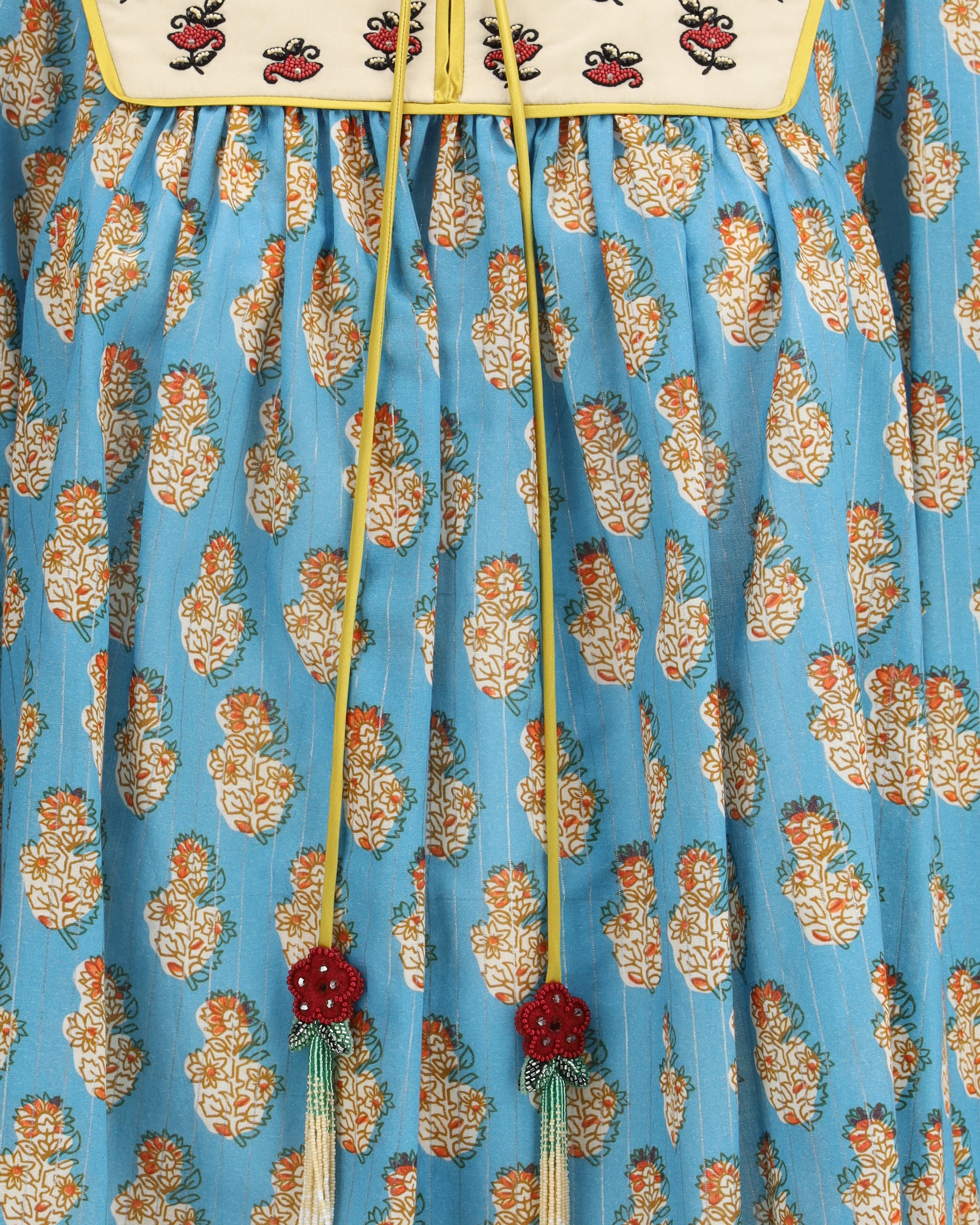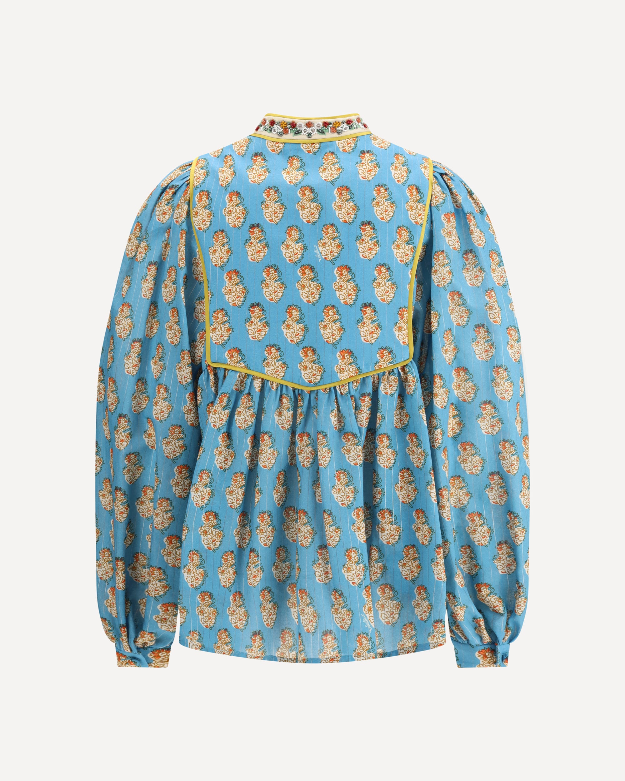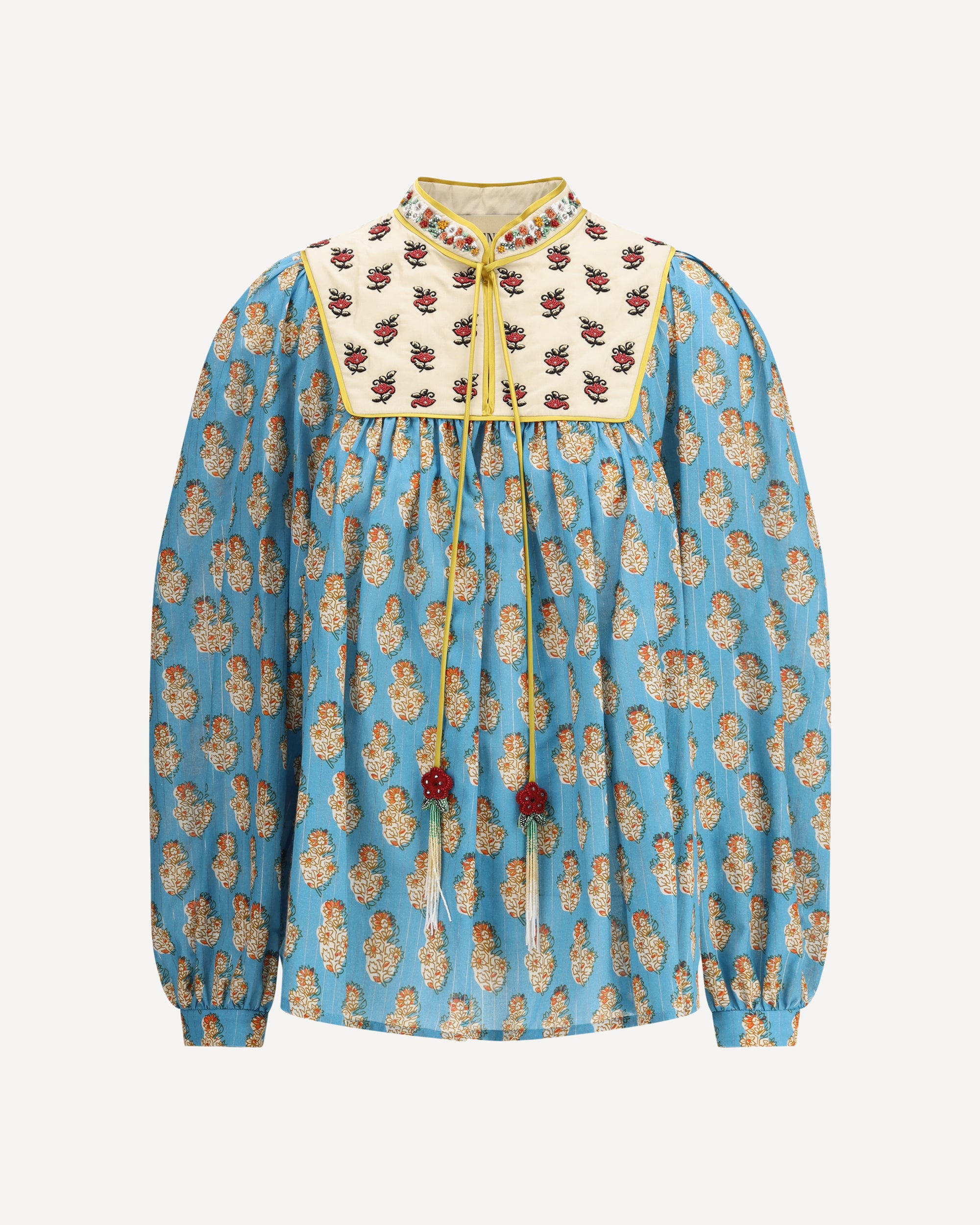 Valentino's Petales D'Amour print Blouse is a romantic and refined garment made of lightweight cotton lurex that gives a delicate luminosity to the fabric. Embellished with embroidered tassels, it expresses an ethereal and refined elegance. The model is unlined, ideal for a light and sophisticated look, perfect for special occasions or to add a feminine touch to everyday life.