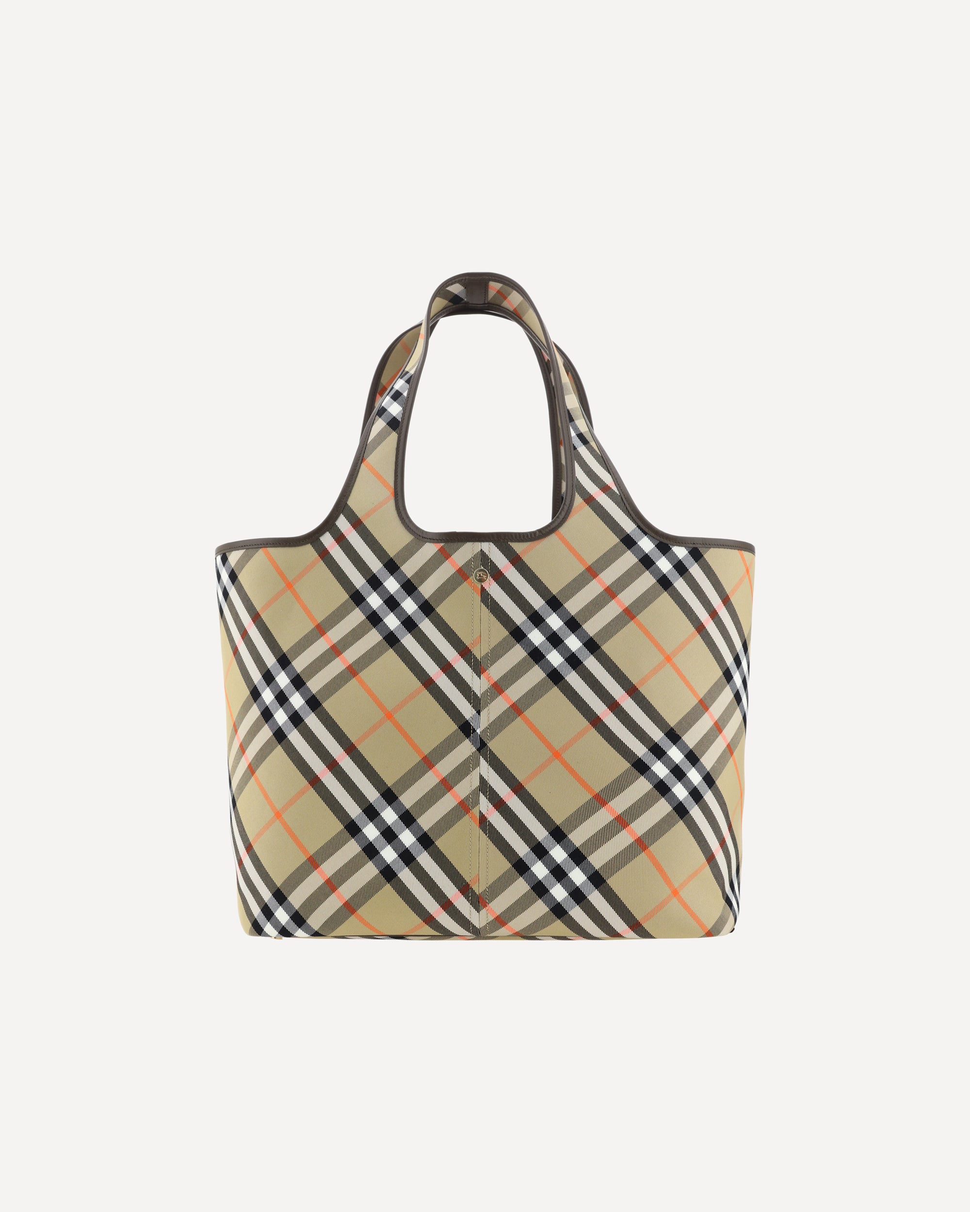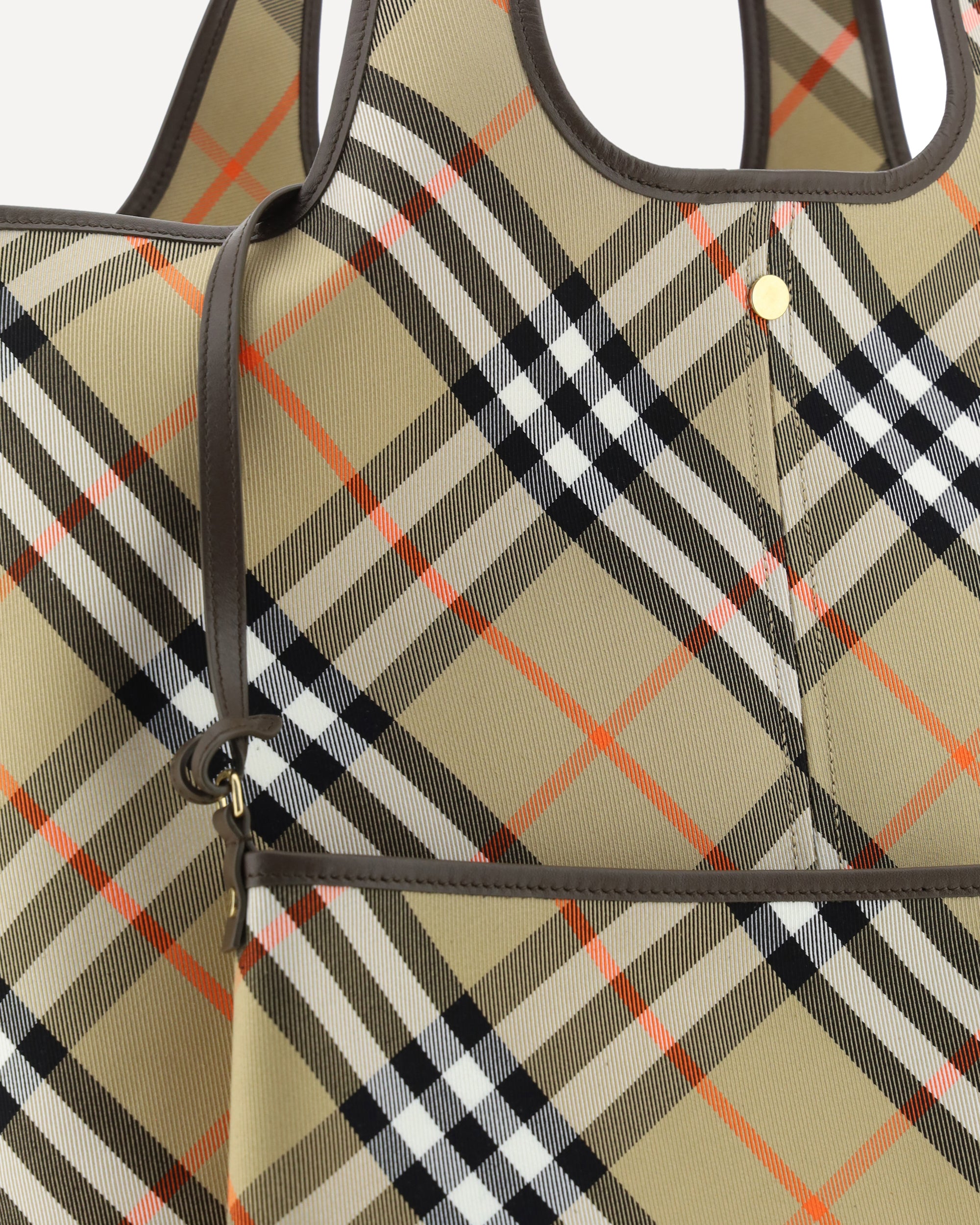 Cotton Tote Bag by Burberry, flat top-applied handles, iconic all-over printed Check Archivio pattern, smooth leather trim, detachable zippered pouch, snap-button closure.