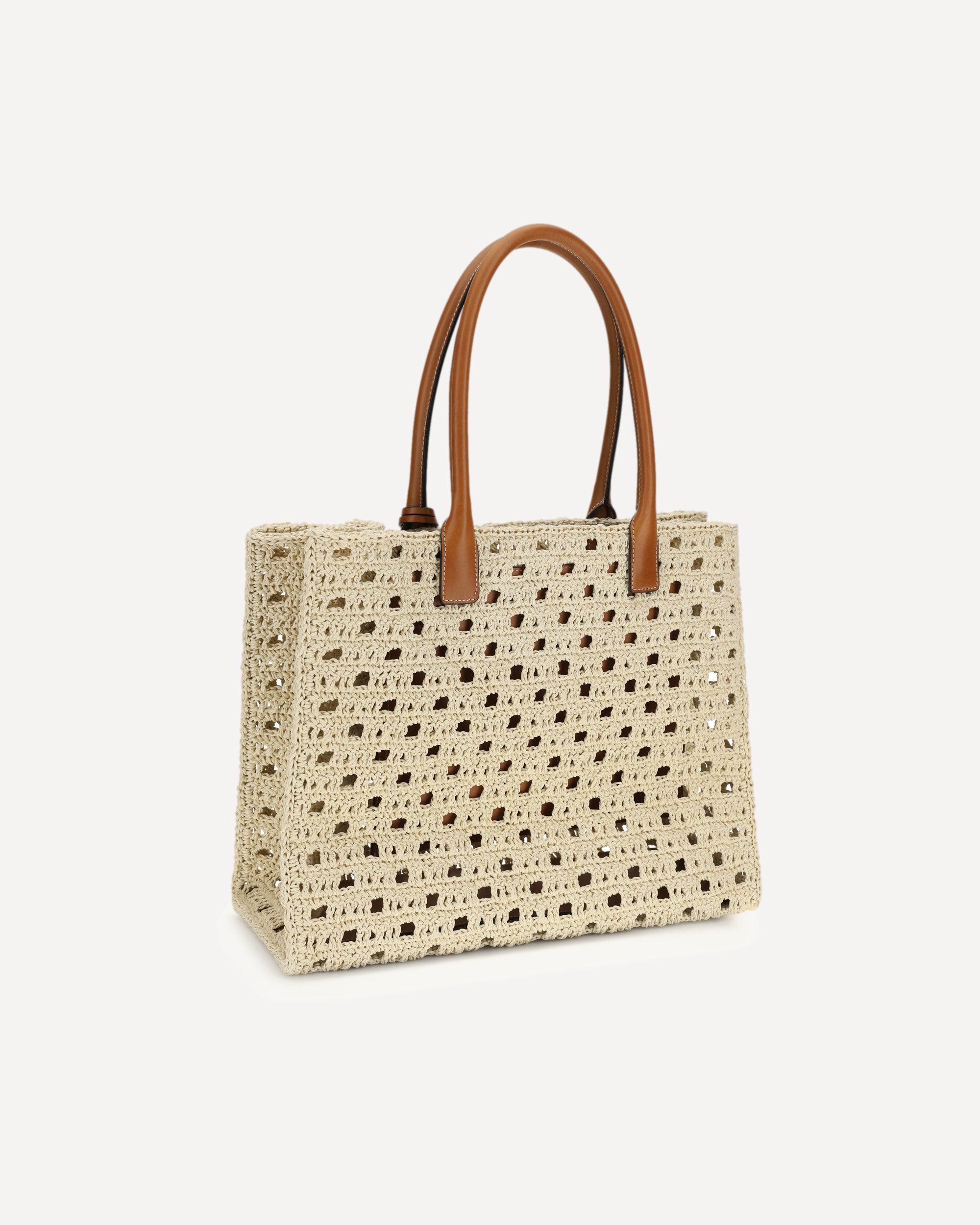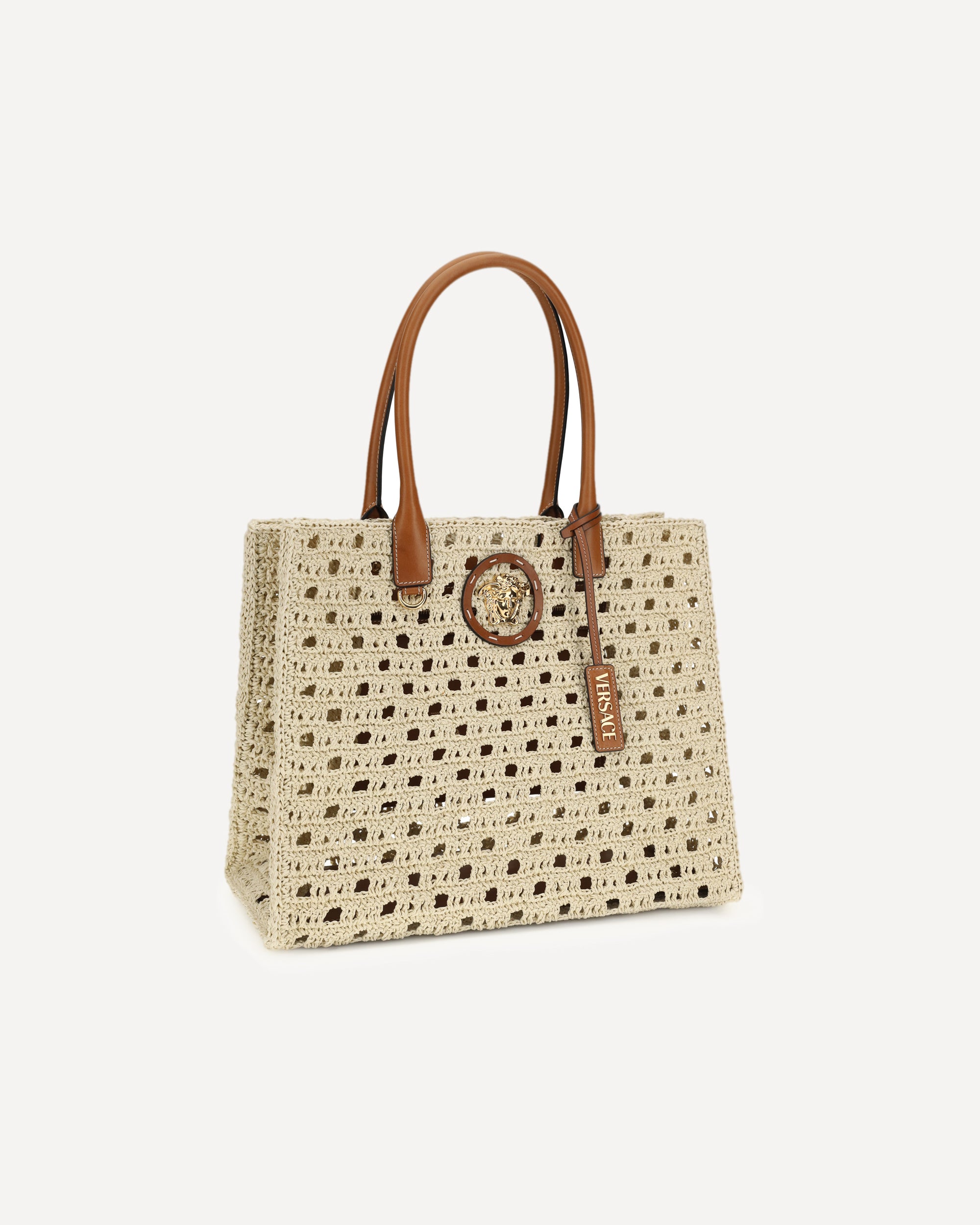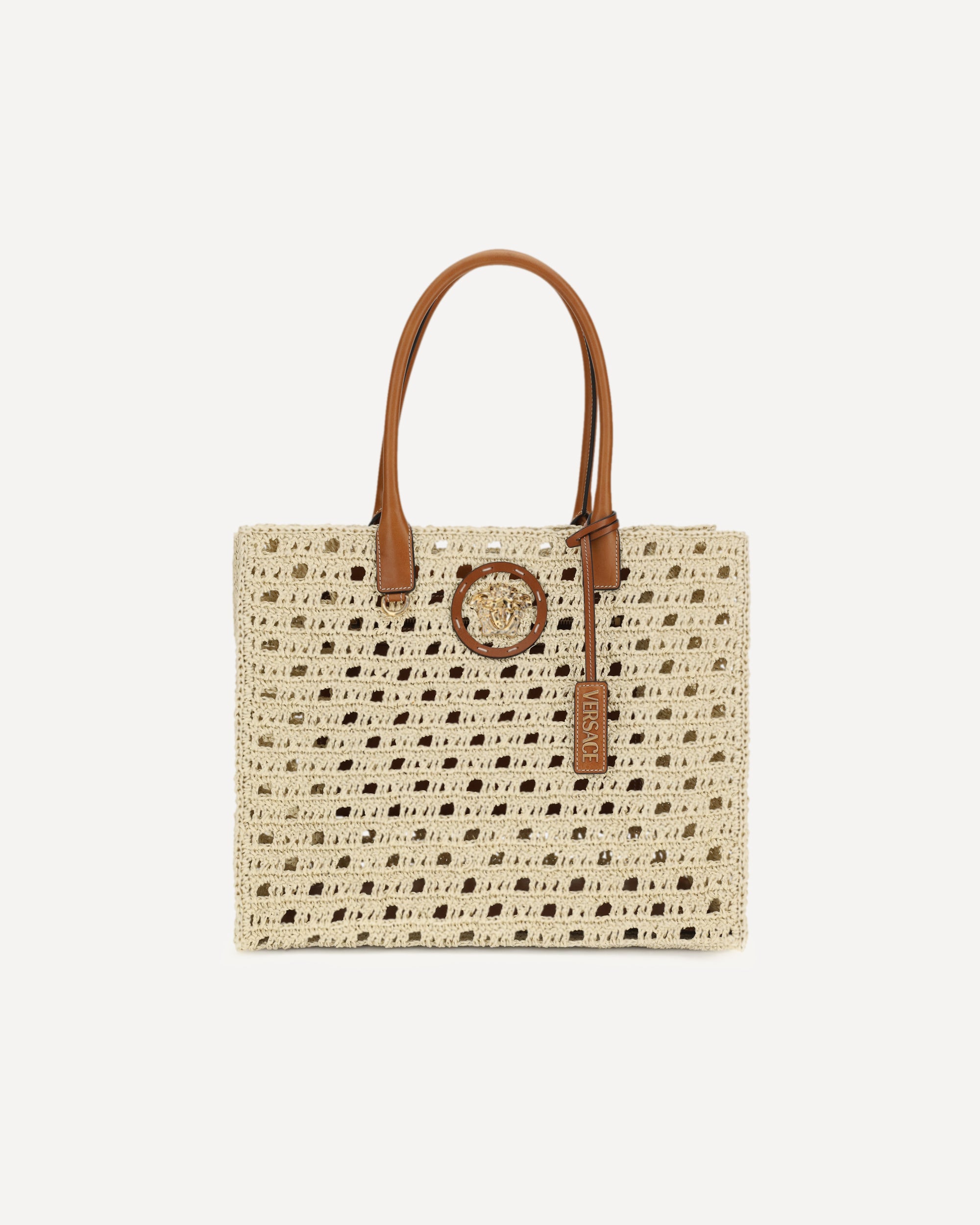 The Tote Bag by Versace features a top handle, gold-tone hardware, and a logo plaque that enhance its iconic aesthetic. The internal zip pocket ensures practicality and organization. Crafted from high-quality materials, it combines elegance and functionality, perfect for completing everyday outfits or more sophisticated looks. The refined design and distinctive details make it a versatile and contemporary accessory, a key feature of the modern wardrobe.