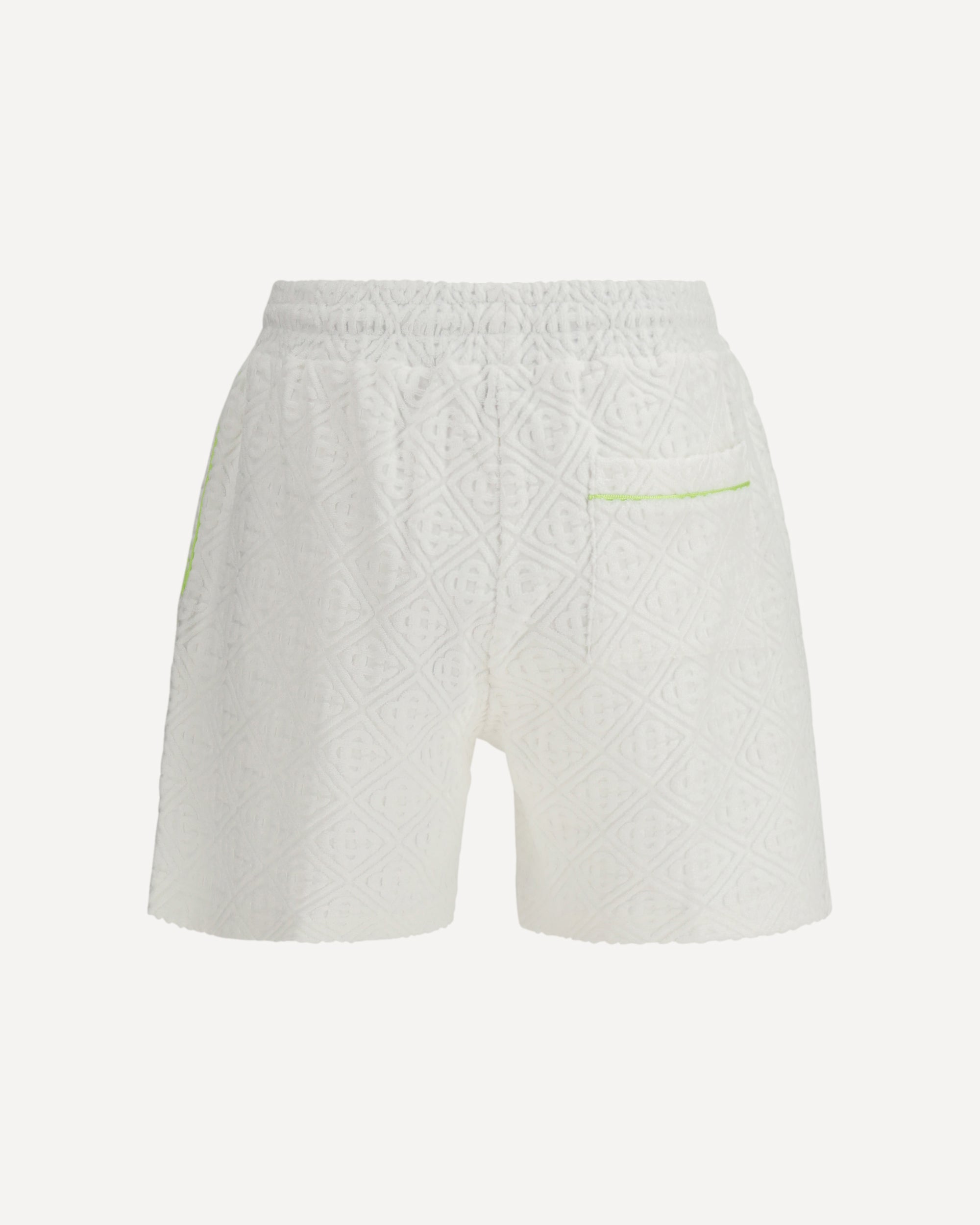 The monogrammed Shorts by Casablanca combine comfort and style with an elastic waistband and drawstring for a perfect fit. The slanted side pockets and patch back pocket offer practicality, while the visible stitching and piping on the sides add a refined touch. With a casual cut, these shorts are ideal for a relaxed yet elegant look, perfect for summer days and informal occasions.
