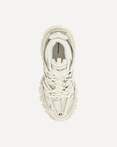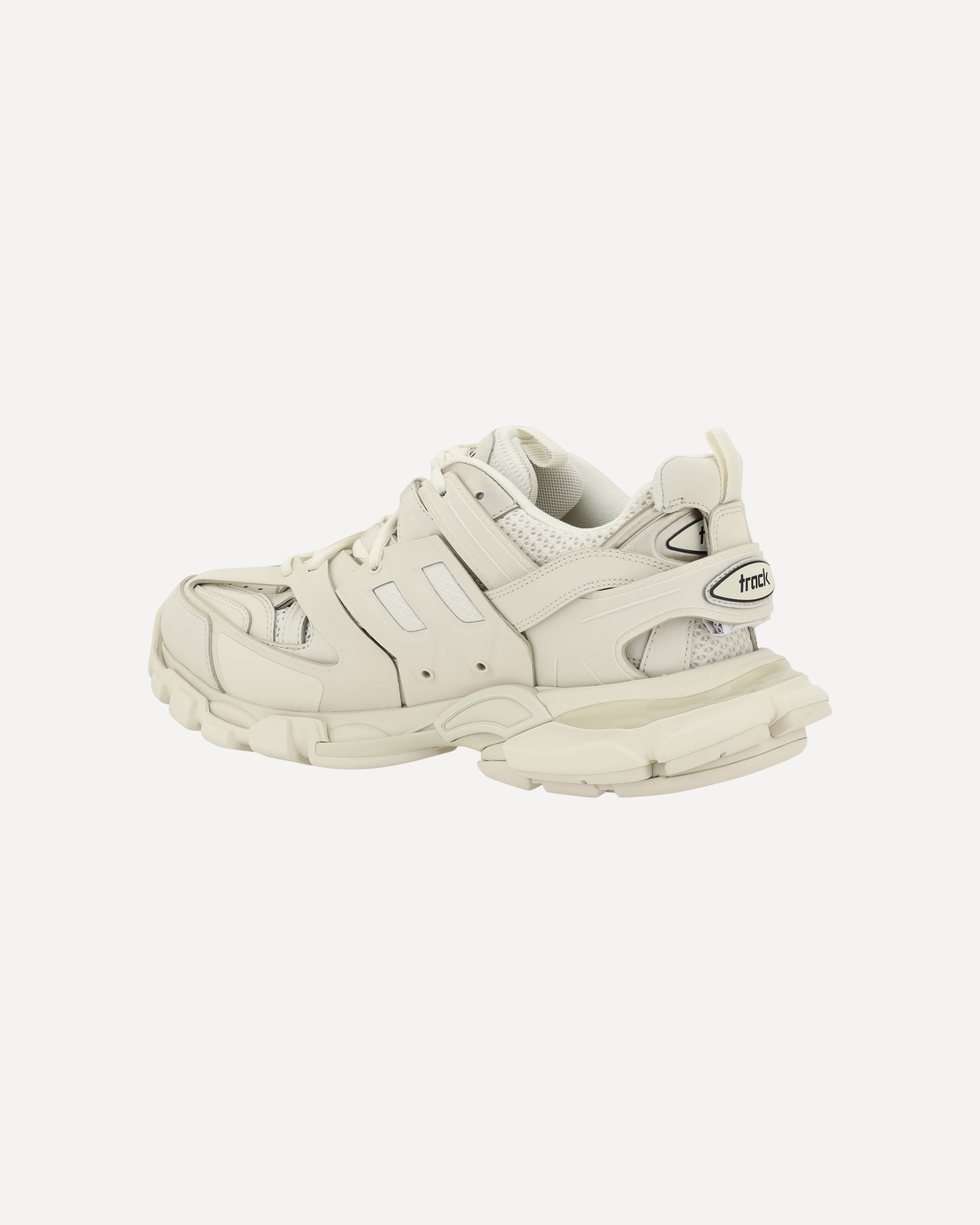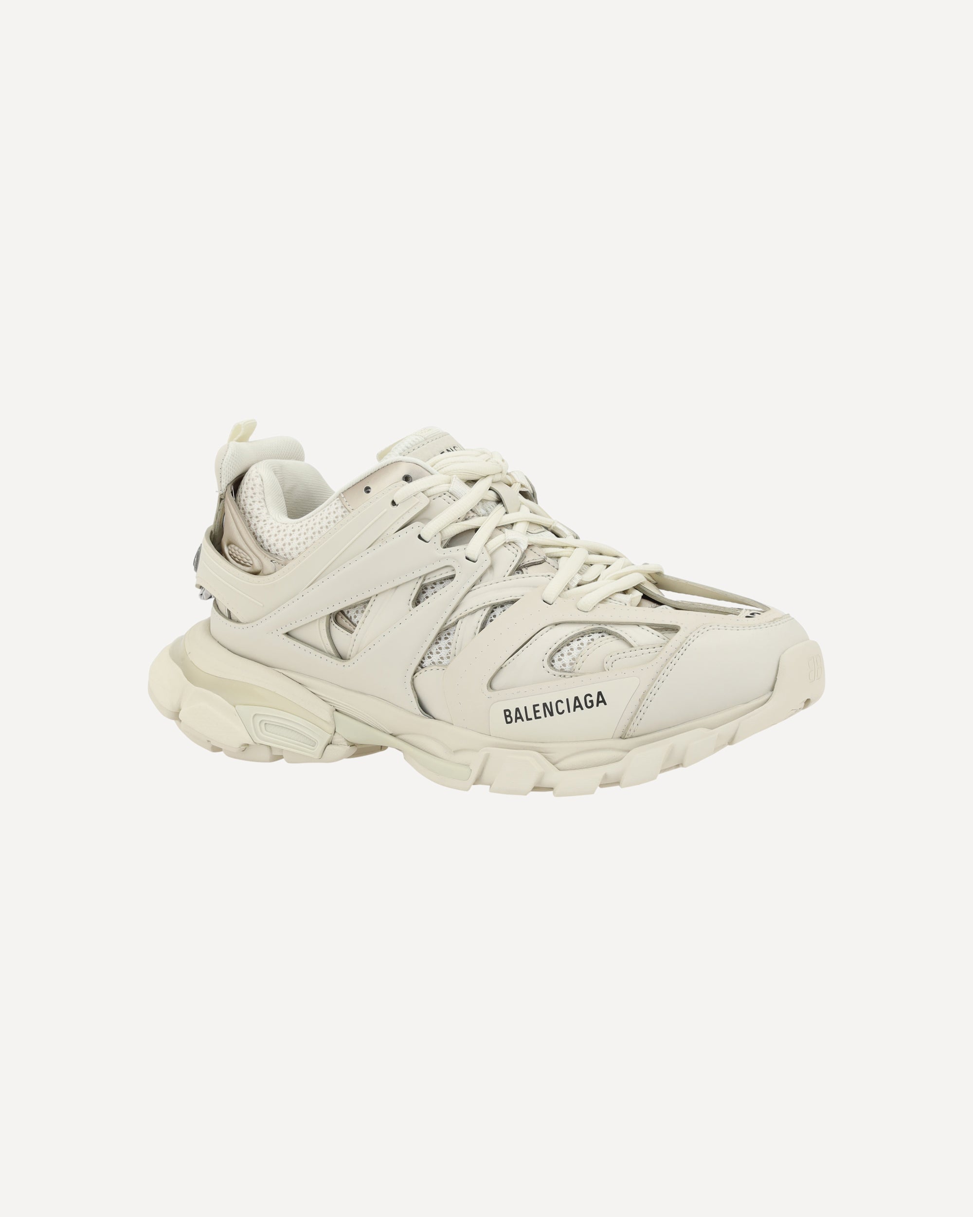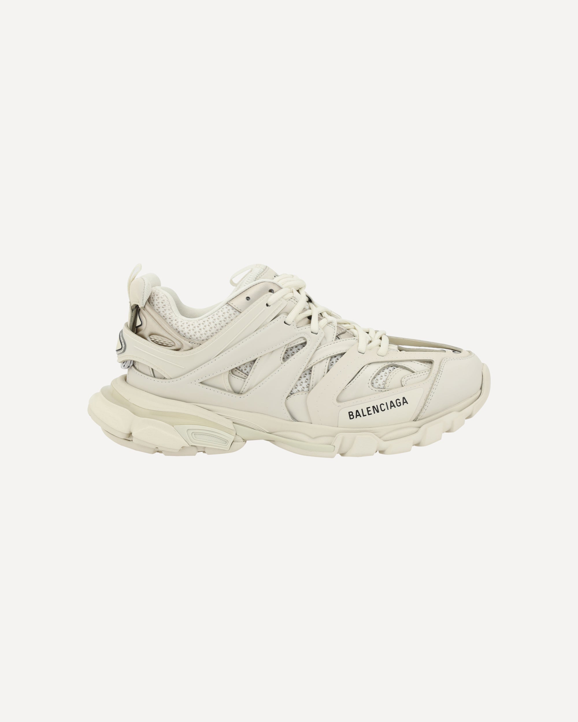 Balenciaga's Track Sneakers are inspired by the design of high-tech running shoes, combining performance and style. The multi-layer upper offers a complex, modern construction, while the drawstring-style lace-up closure on the front ensures a secure, adjustable fit. The embroidered size number on the front adds a distinctive detail, while the side-printed logo underscores its authenticity. The reinforced outsole ensures durability and comfort, with the logo also on the sole and insole, completing the sporty and functional look of these sneakers.