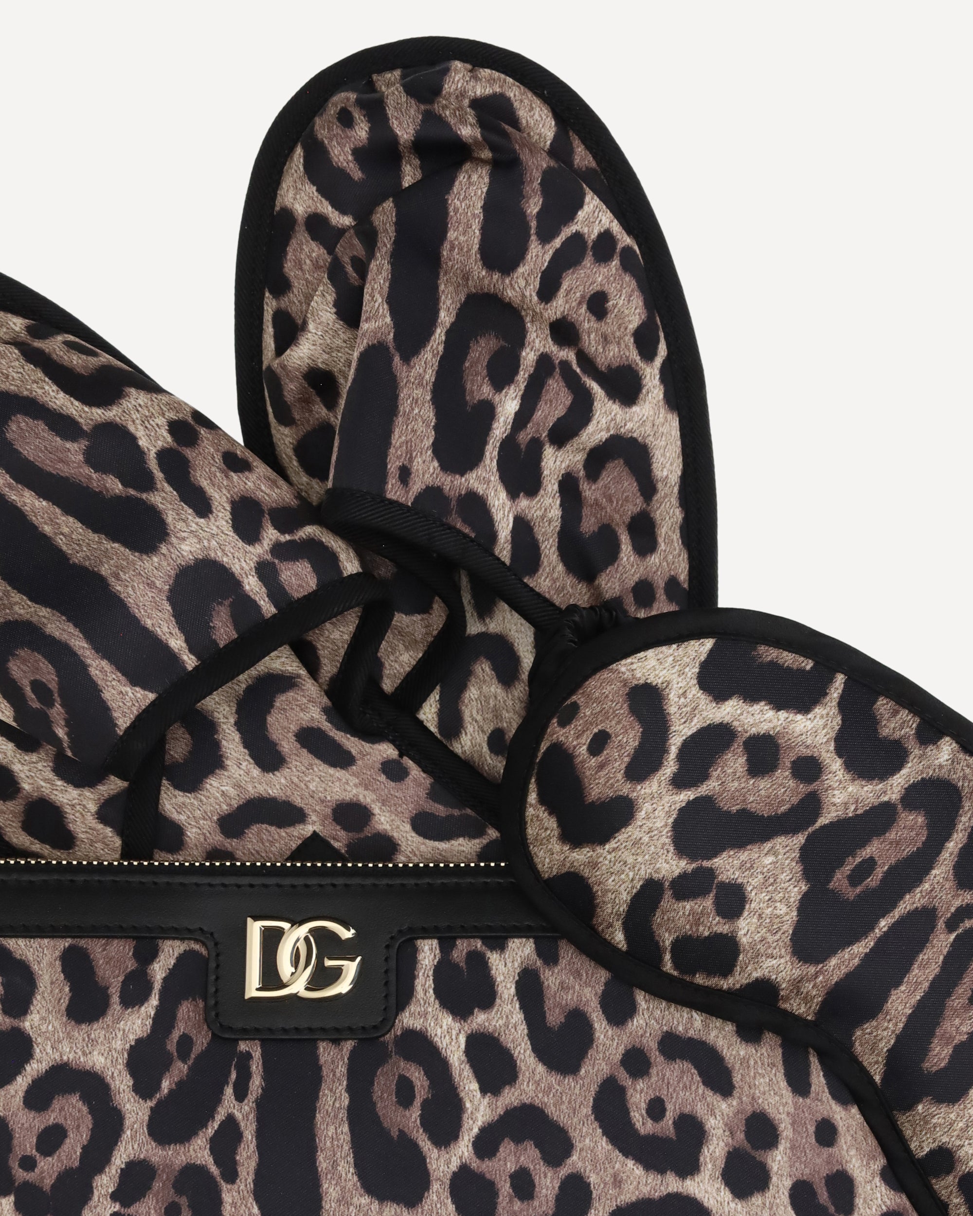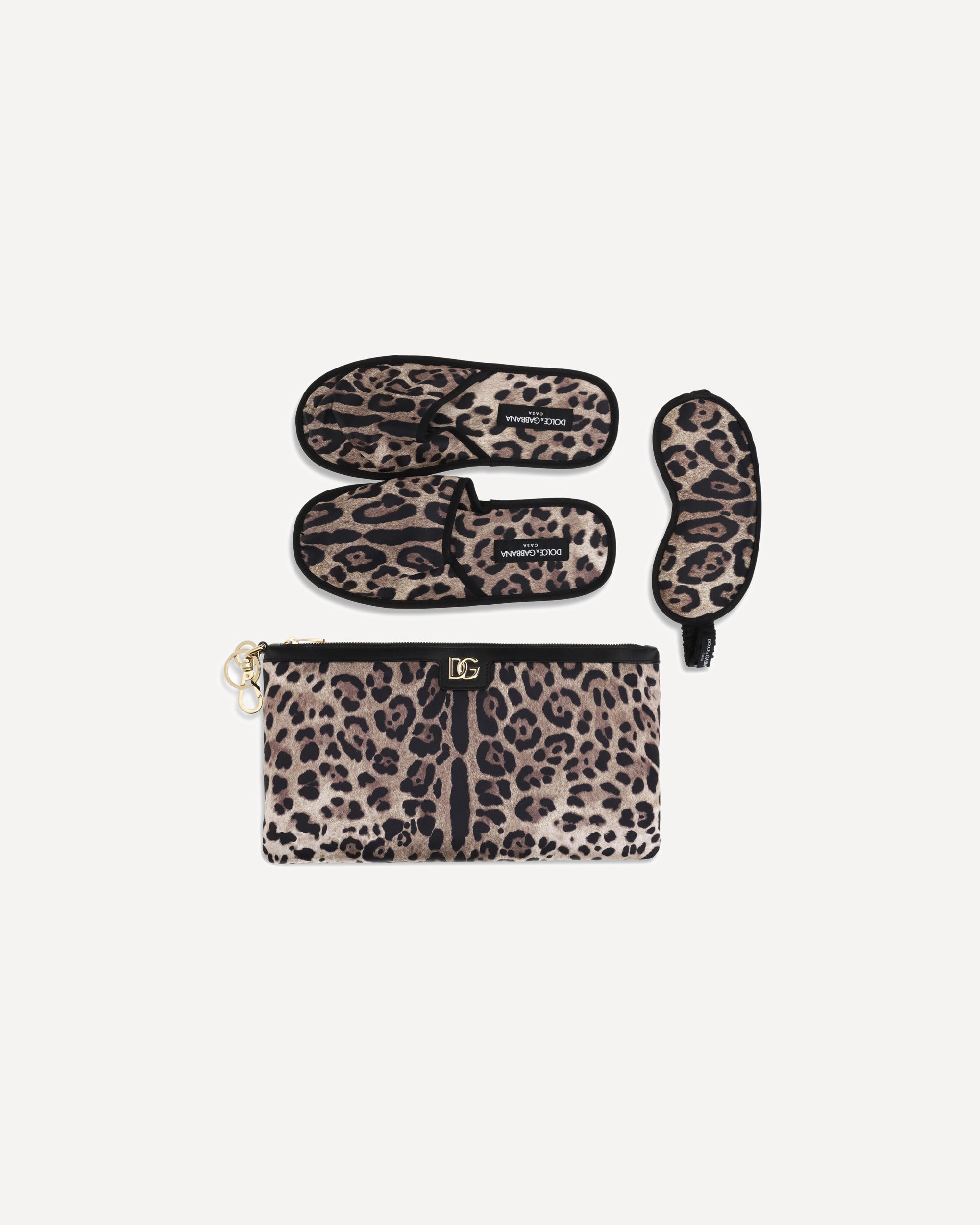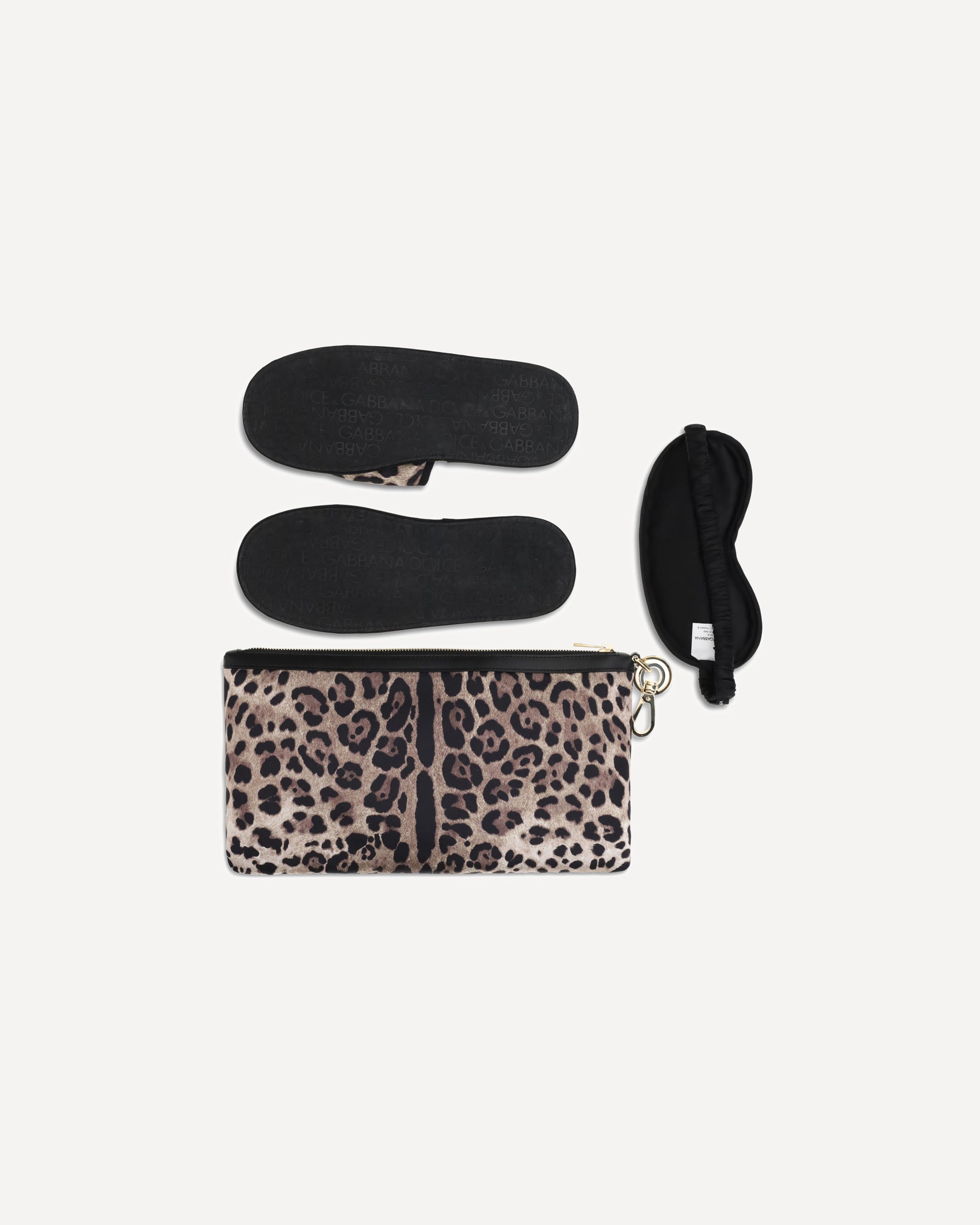 The Dolce&Gabbana leopard-print Comfort Kit is the ideal accessory for travel and relaxation, combining style and functionality. The set includes a clutch with a silver zipper closure, snap hook, and leather details, lined in matching fabric and organized internally. The kit is completed by comfortable slippers with logoed rubber soles and grosgrain details, and a sleep mask with an elasticized silk ribbon. A refined accessory for well-being, wherever you are.